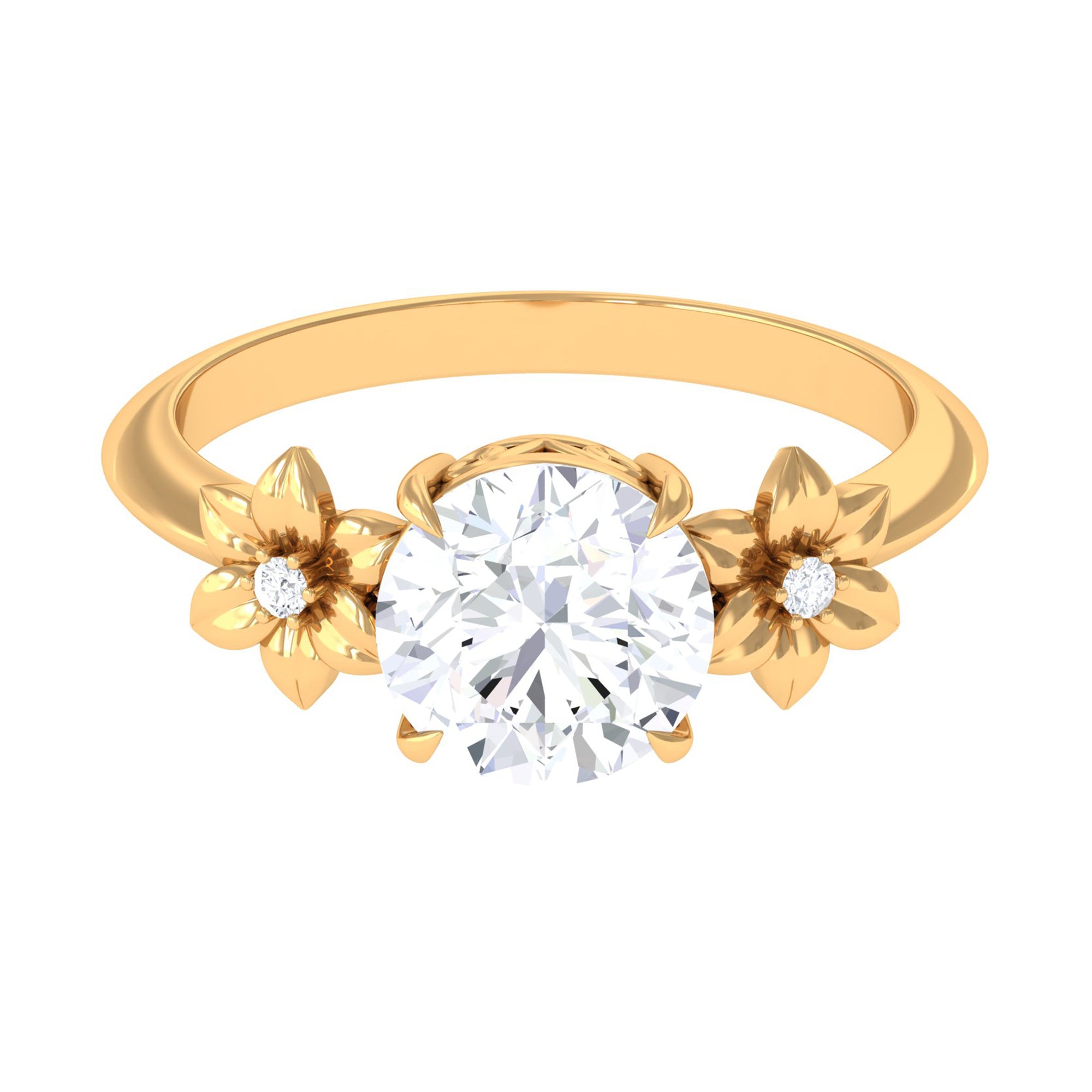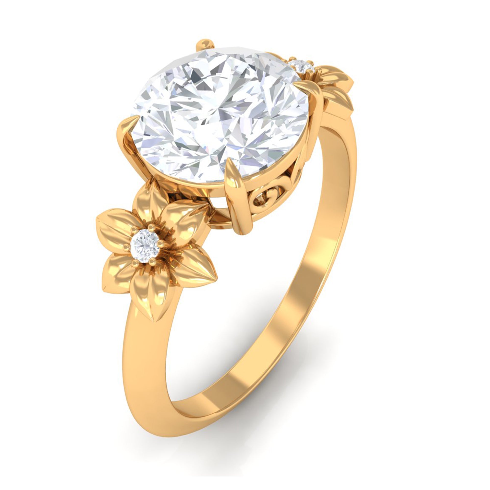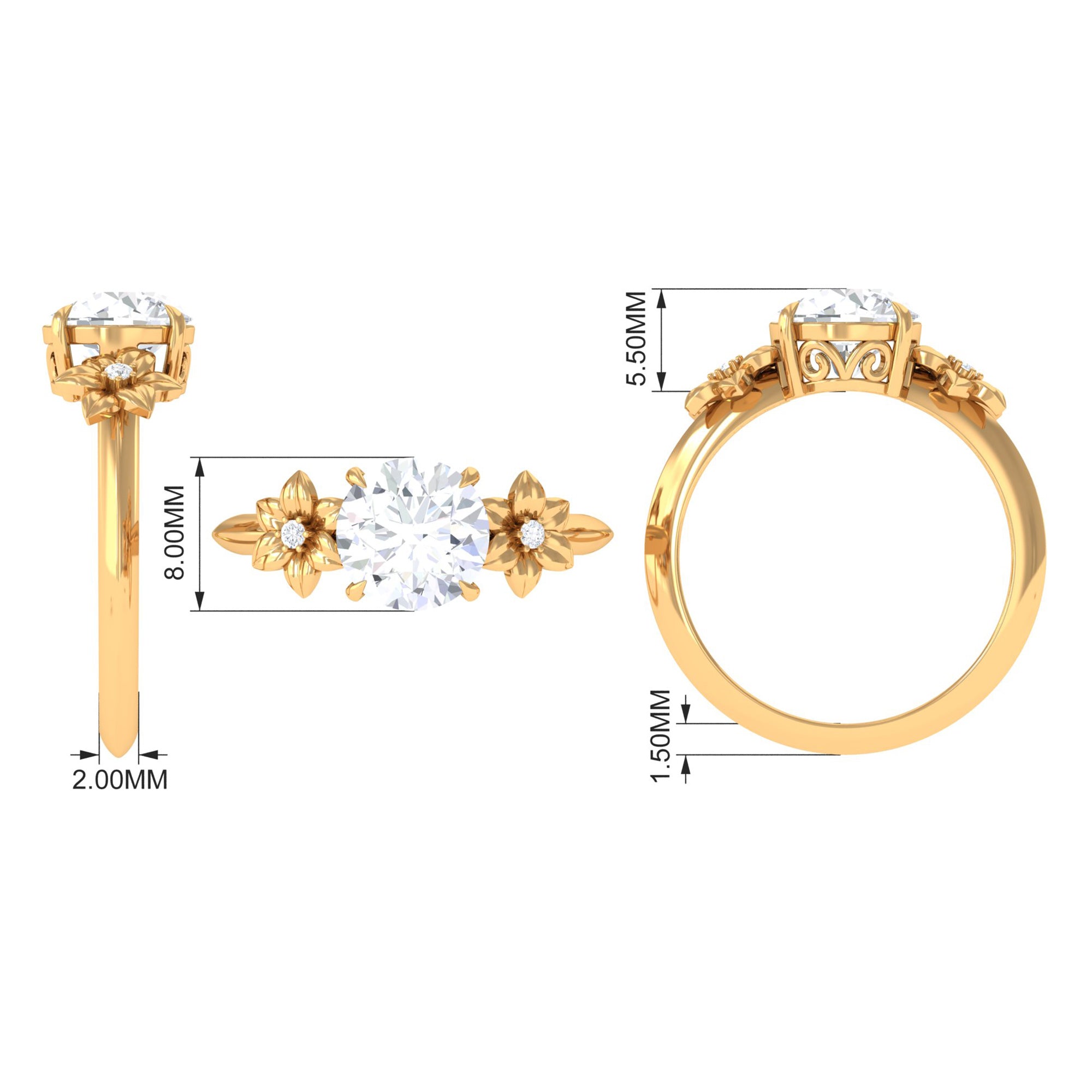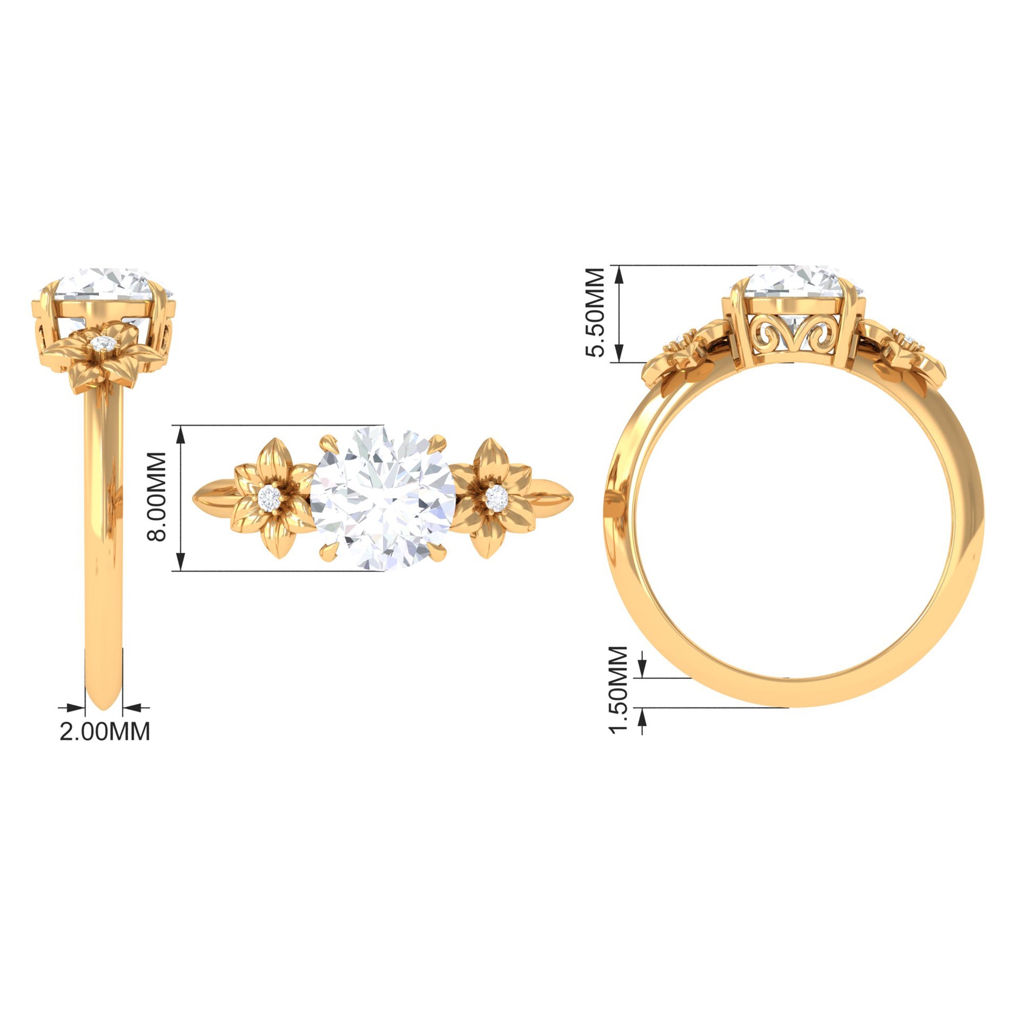 Remind your beloved of your love with this stunning floral solitaire ring, crafted from solid gold. The centerpiece of the ring is an 8 MM round-cut Zircon, beautifully set in a claw setting. Adding to its elegance, the engagement ring is embellished with round-cut cubic zirconia in a 6-prong setting as side stones. With its exquisite design and quality craftsmanship, this solitaire ring is sure to be treasured for years to come.