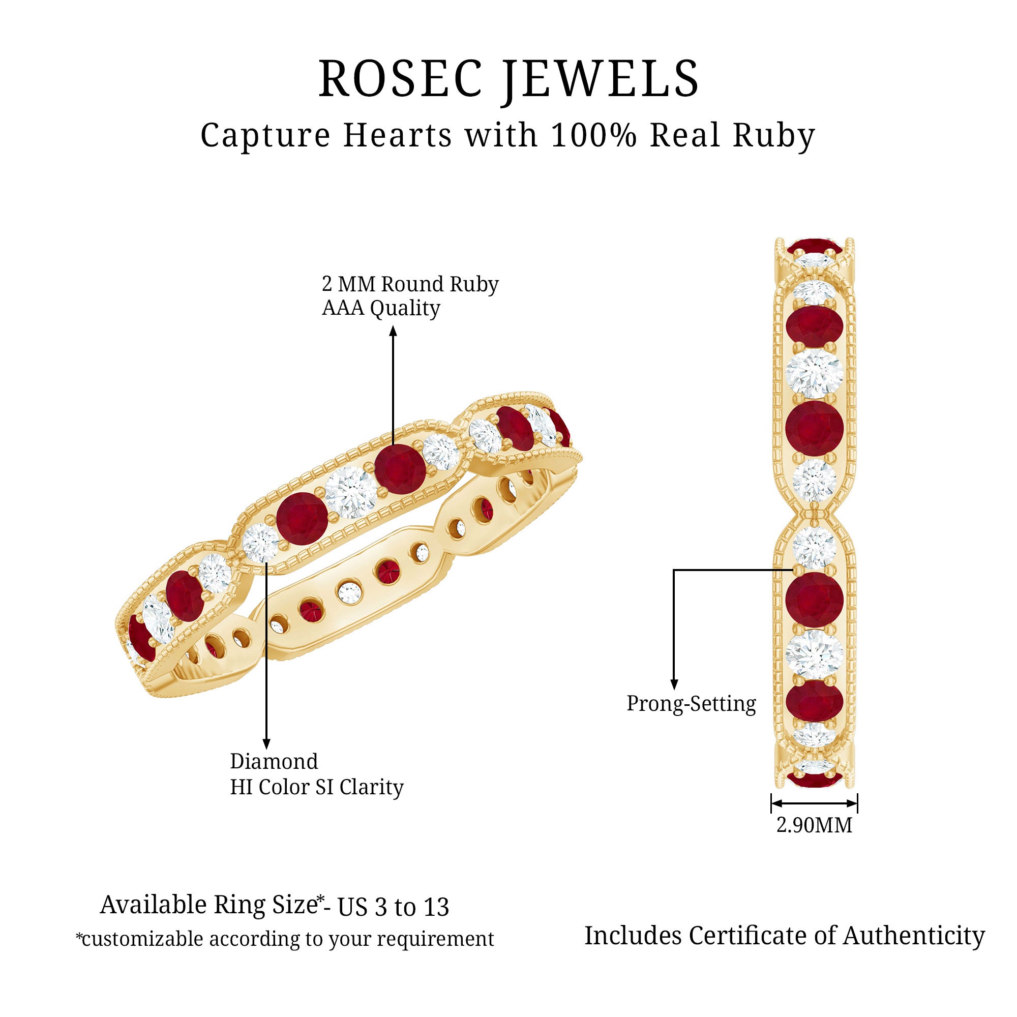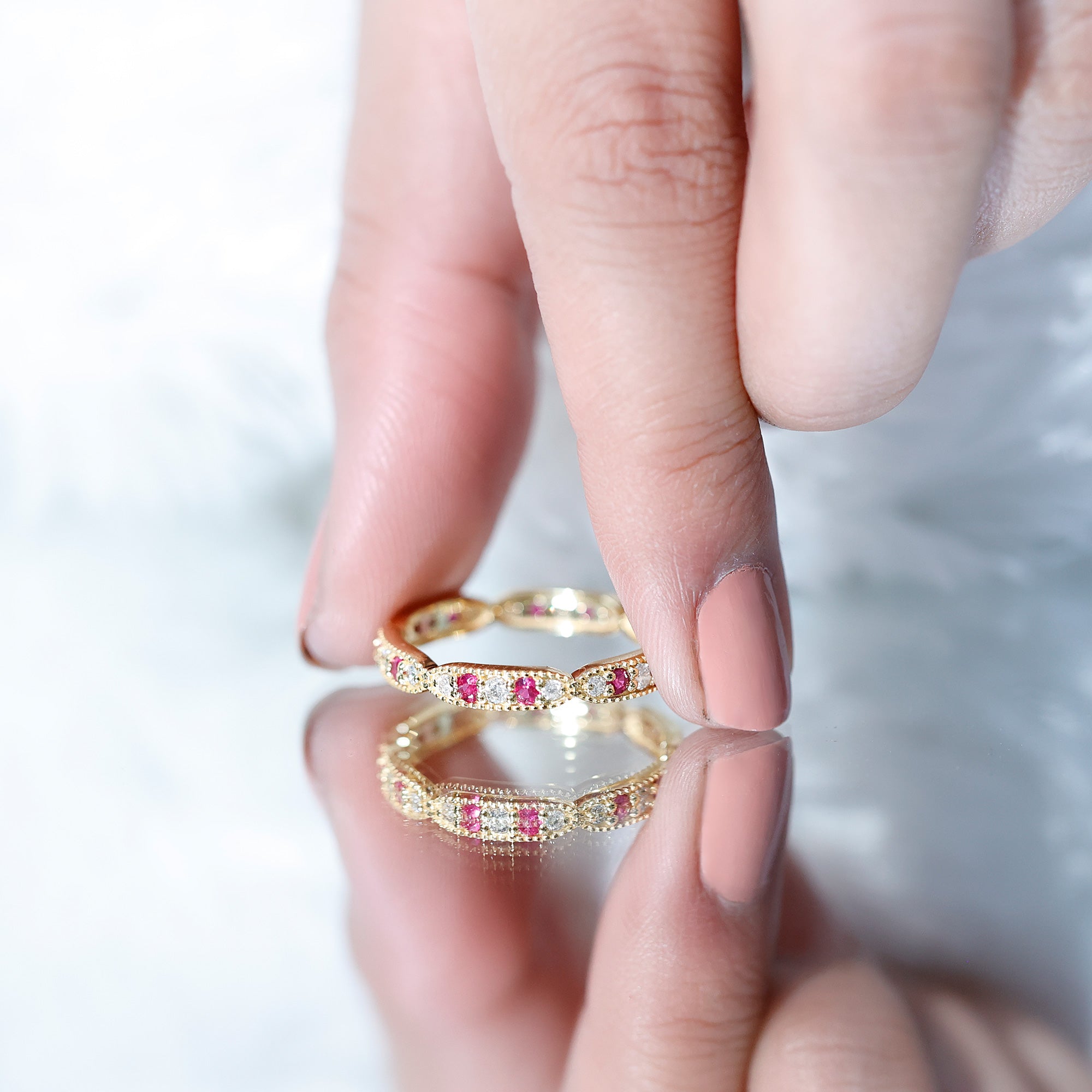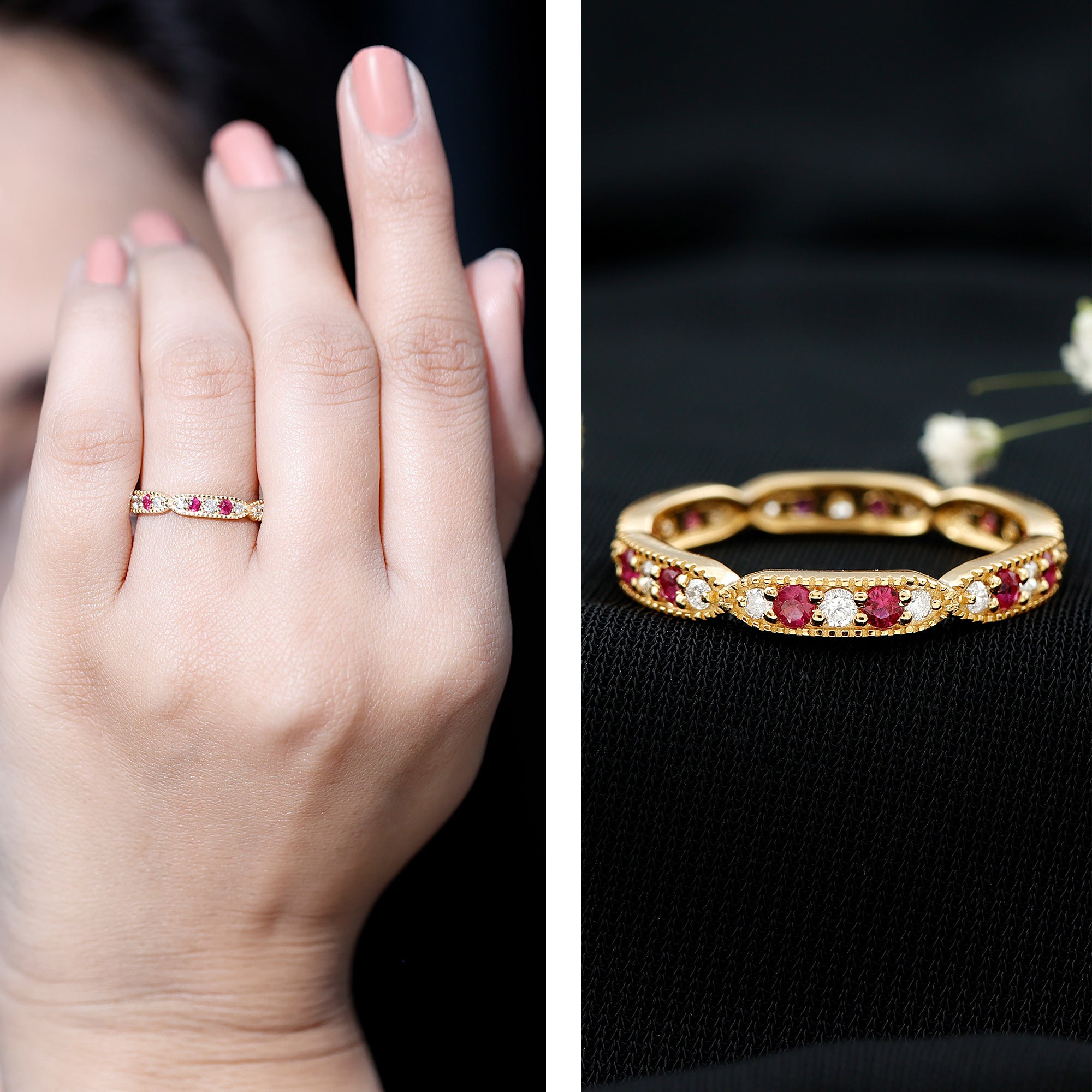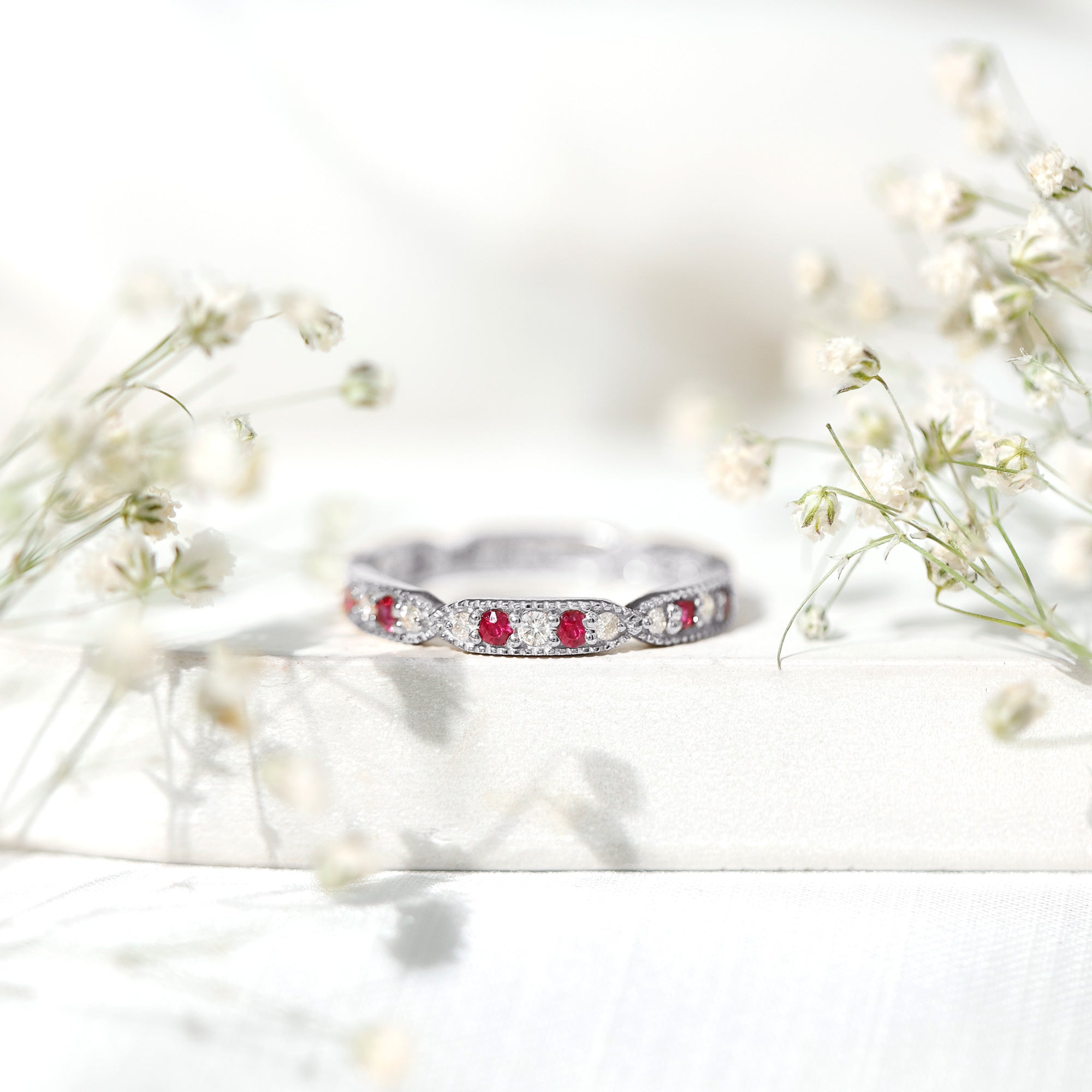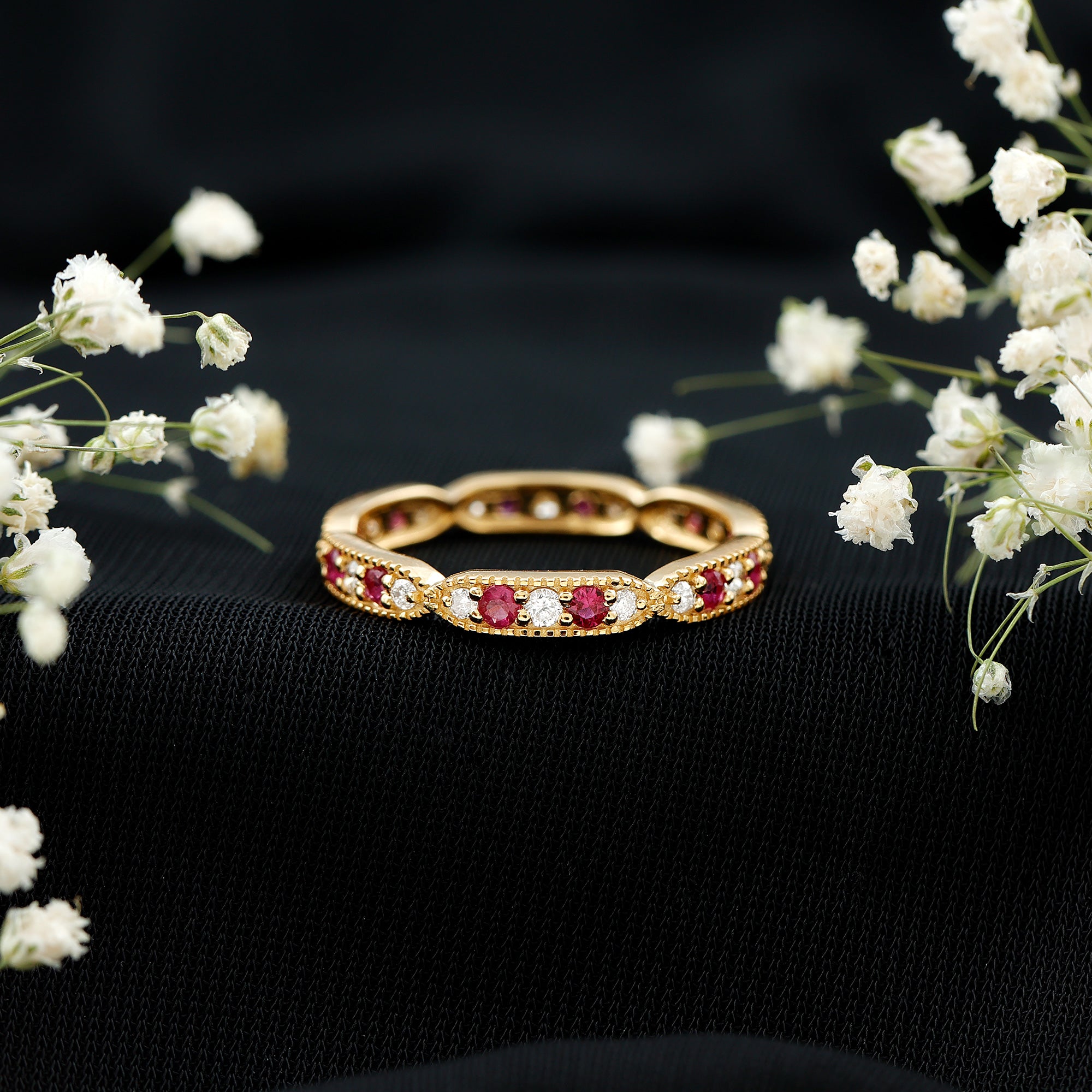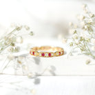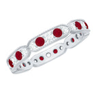 Ruby and Diamond Band Ring with Milgrain Details