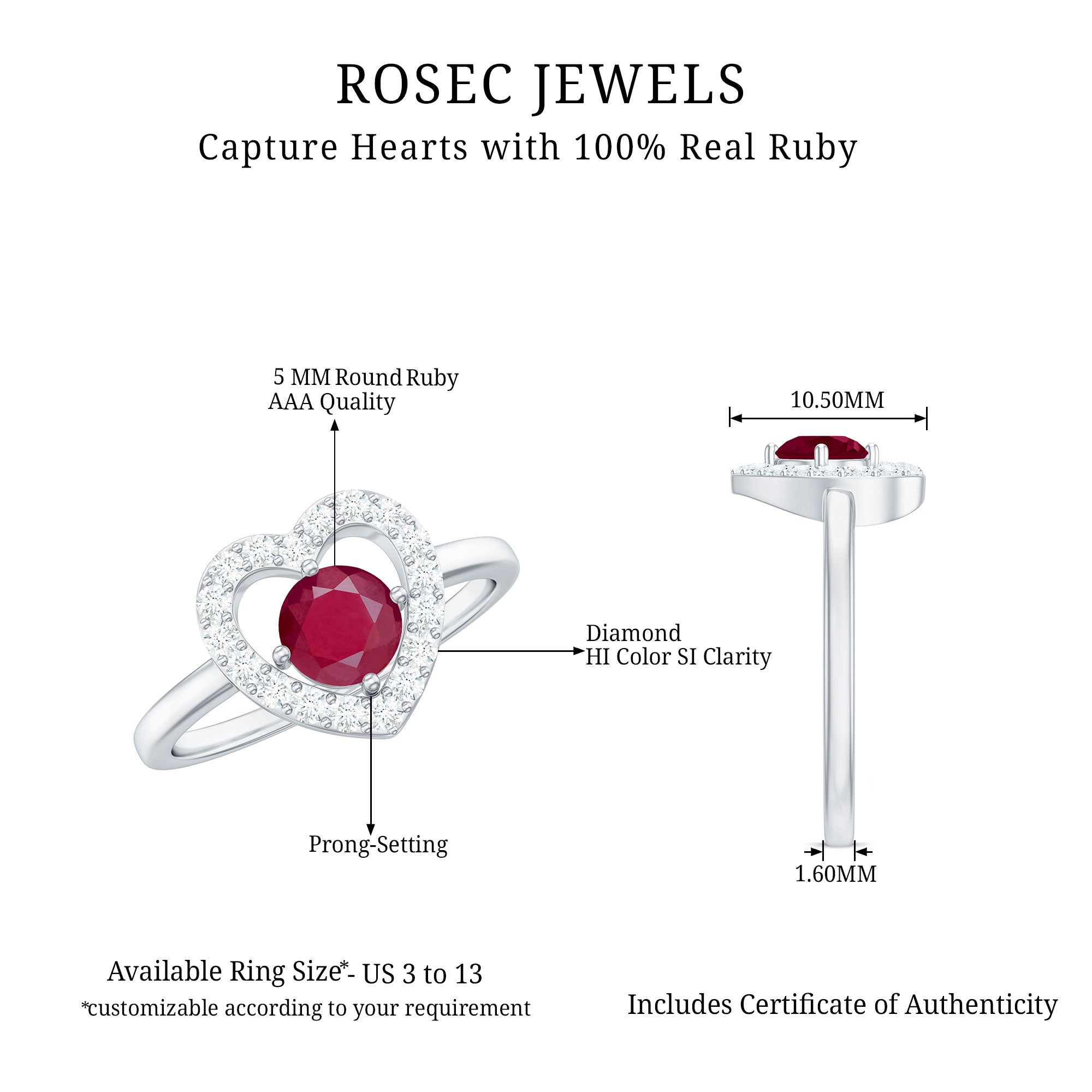 Make a bold declaration of love with this breathtaking Ruby and Diamond Ring. This exquisite piece features a stunning 5 MM Round Shape Ruby in Prong Setting encircled by a dazzling halo of brilliant Heart Shape Diamond, creating a mesmerizing display of romance and elegance. The vibrant red hue of the ruby symbolizes passion and vitality, while the sparkling diamonds exude timeless sophistication. Meticulously crafted this Ruby Heart promise Ring is a symbol of enduring love and affection. Whether it is a gift for a special someone or a treat for yourself, this radiant piece is sure to captivate hearts and turn heads. Perfect for engagements, anniversaries, or any occasion where love takes center stage, this Red Ruby Promise Ring for Her is a testament to the enduring power of love.