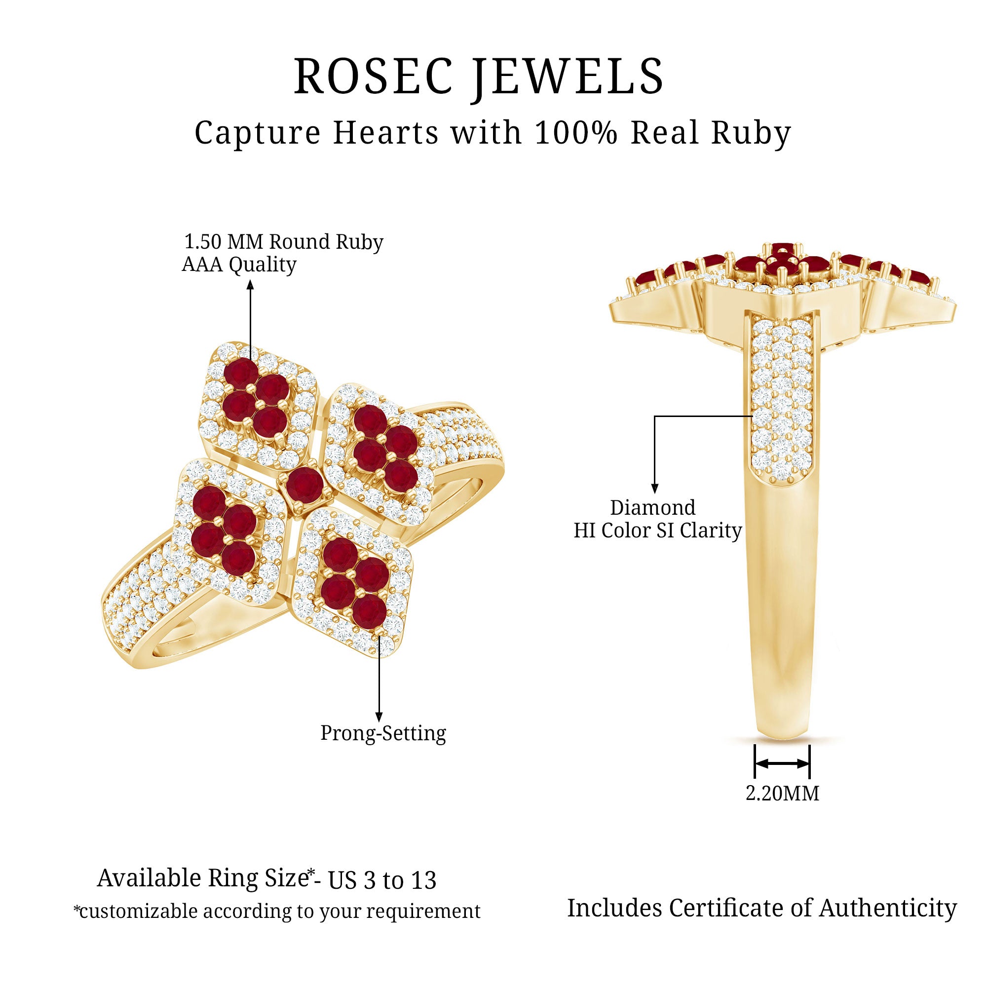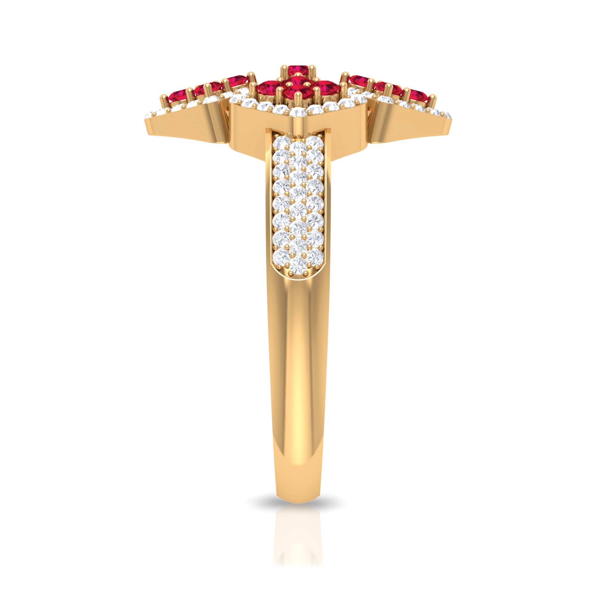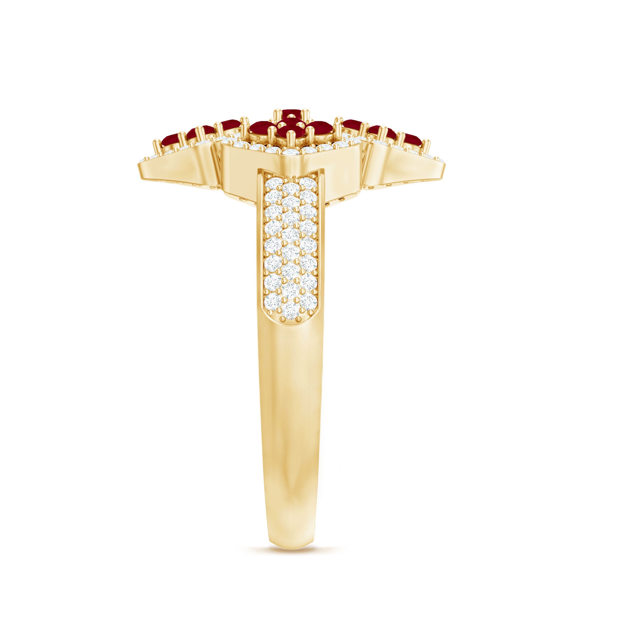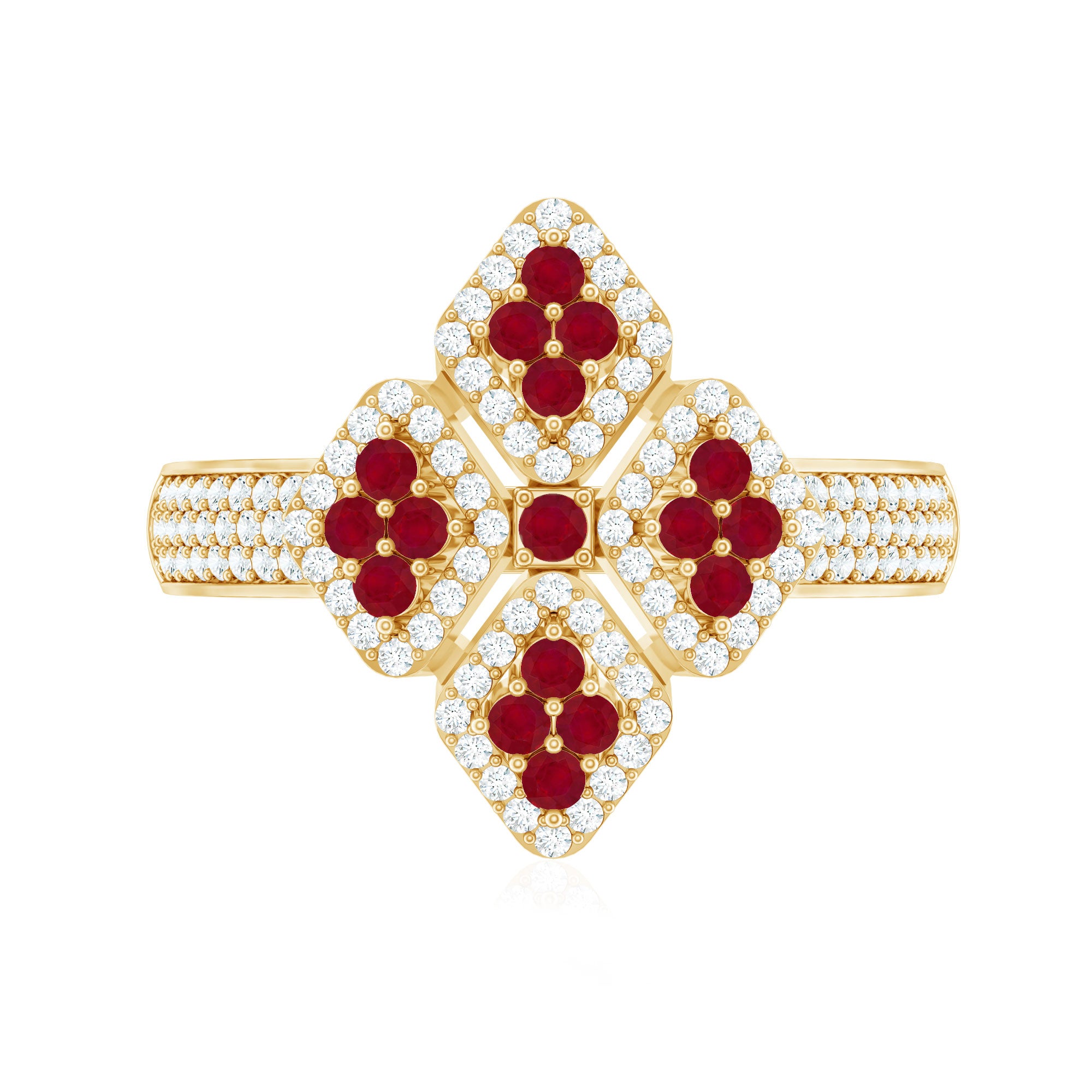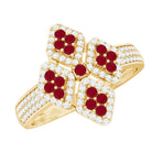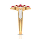 Experience beauty in an unique way with our Statement Ring, designed for Women as an Engagement Ring featuring an Round Shape Ruby and Diamonds are set in a Prong Setting, crafted in a Solid Gold Metal.