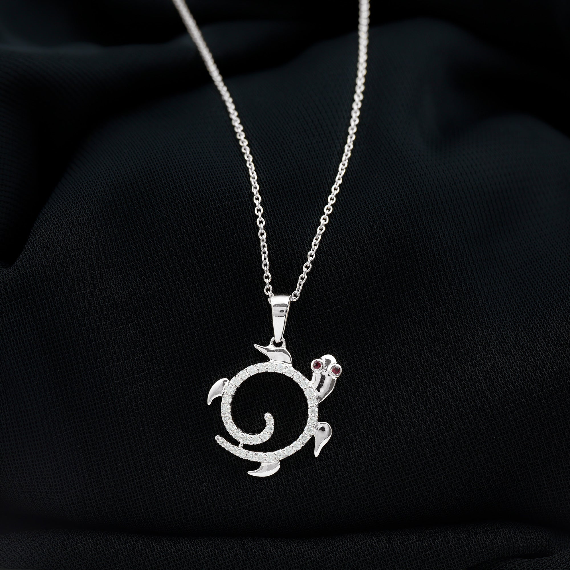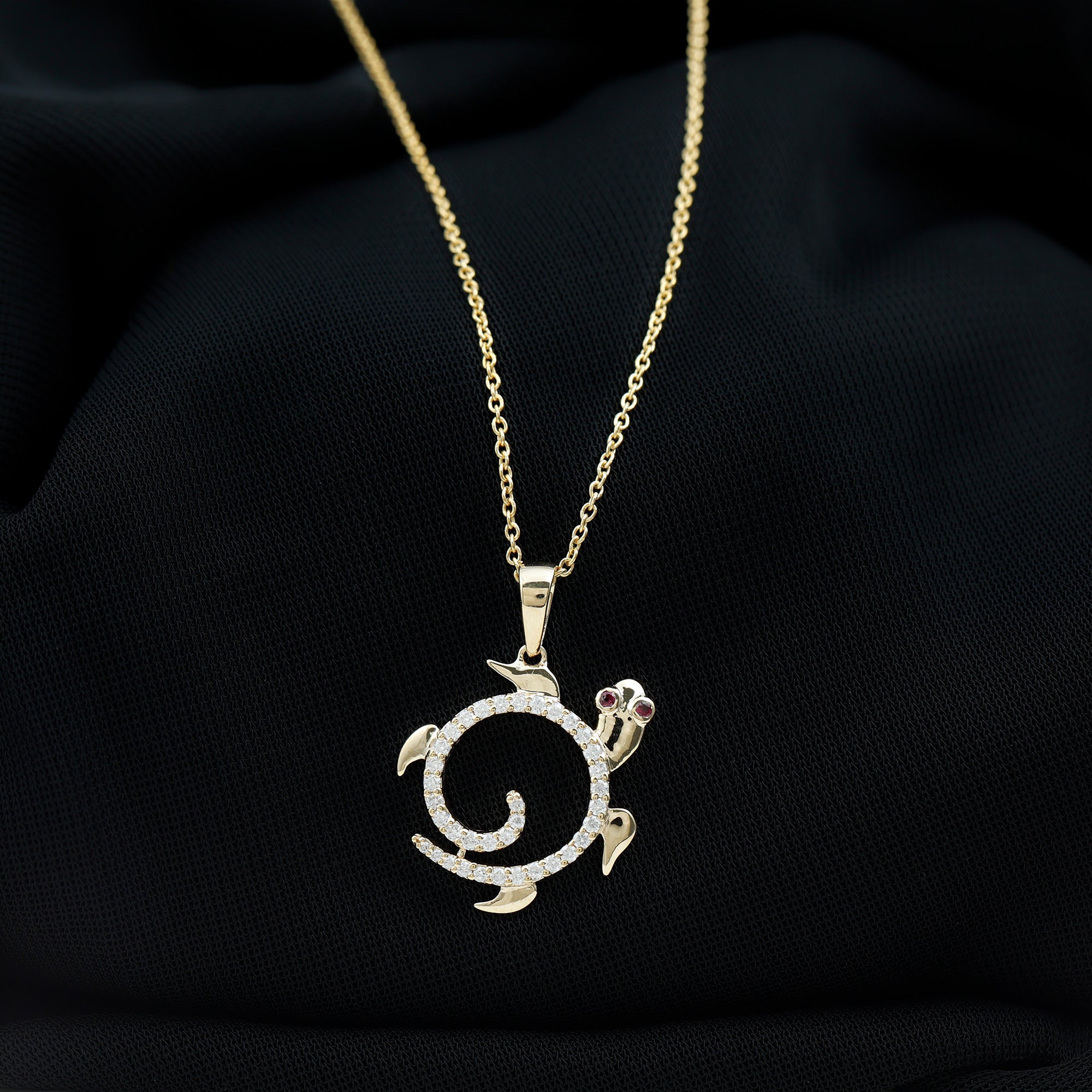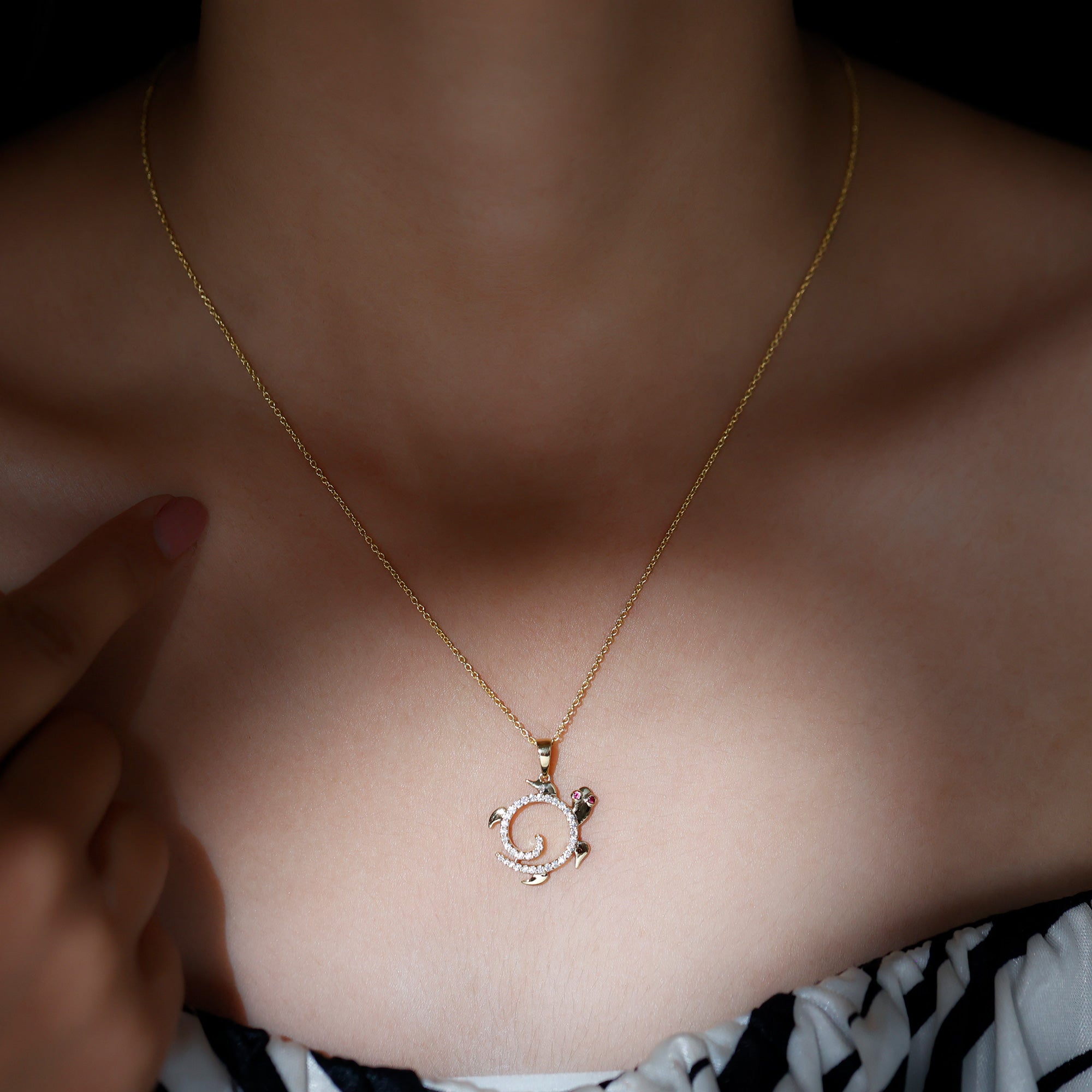 Bring a touch of fun and charm to your jewelry collection with this adorable Turtle Pendant Necklace. Designed to be cute and full of personality, this Animal Pendant features a playful turtle shape that instantly brings a smile. The turtle’s eyes are decorated with bright round rubies set in bezel setting, giving the pendant a lively and cheerful expression. The swirl shaped shell is beautifully highlighted with sparkling pave set diamonds. These tiny stones create a dazzling shine that catches the light from every angle, adding elegance without losing the fun look. The Ruby and Diamond Necklace hangs from a classic cable chain, making it easy to wear with everyday outfits or special looks. Its lightweight design ensures comfort, while its charming style makes it a lovely choice for any woman of any age who loves cute and meaningful jewelry. This Ruby Turtle Necklace is perfect for anyone who enjoys playful accessories with a touch of sparkle. Whether given as a gift or added to your own collection, it is a piece that brings joy, warmth, and a bit of whimsy to any day.