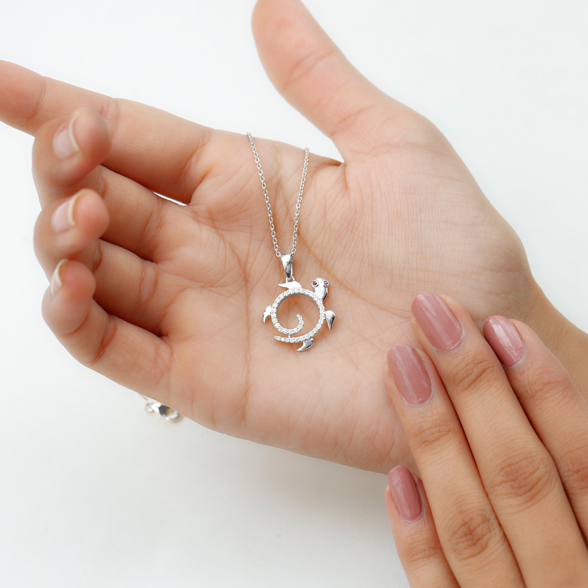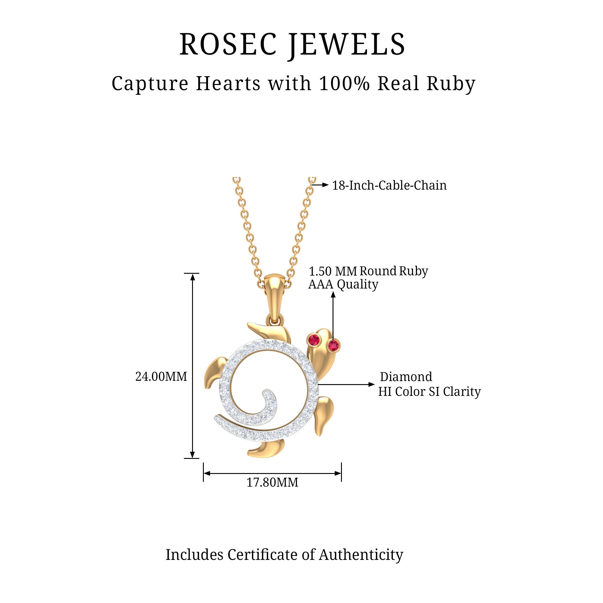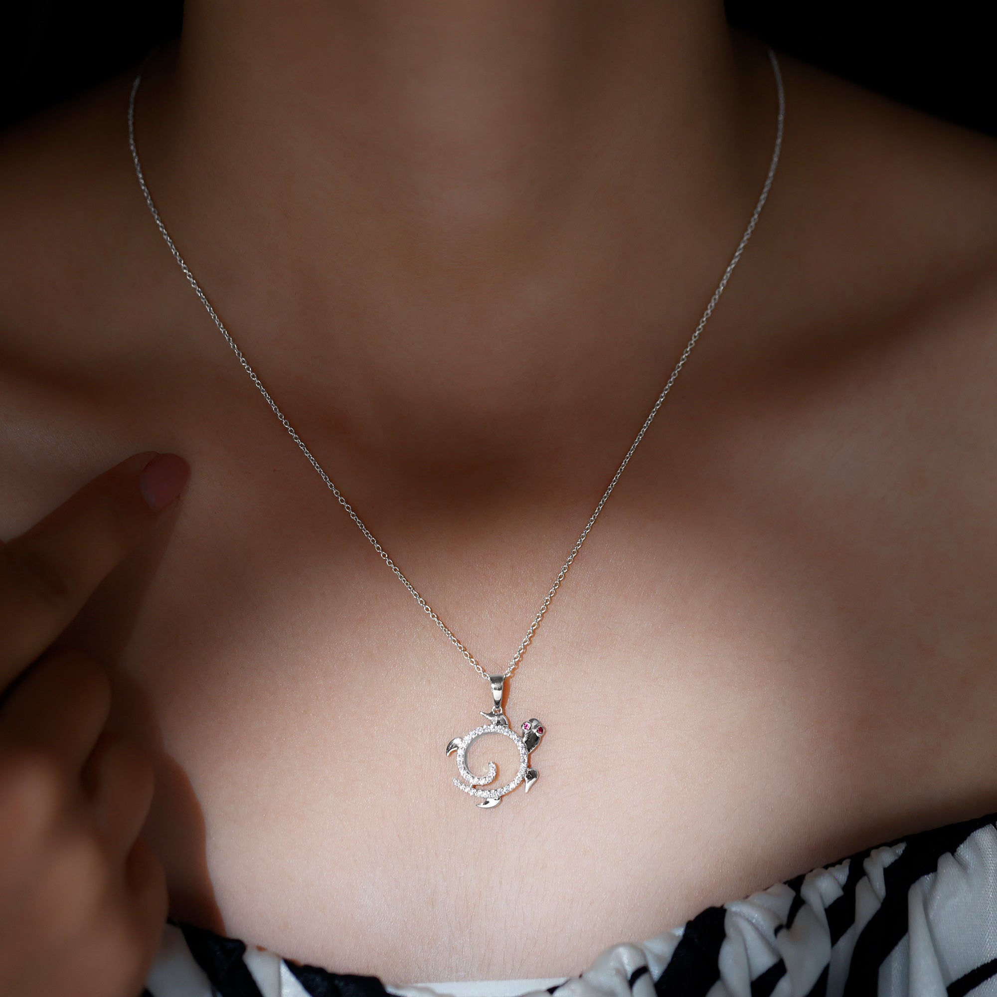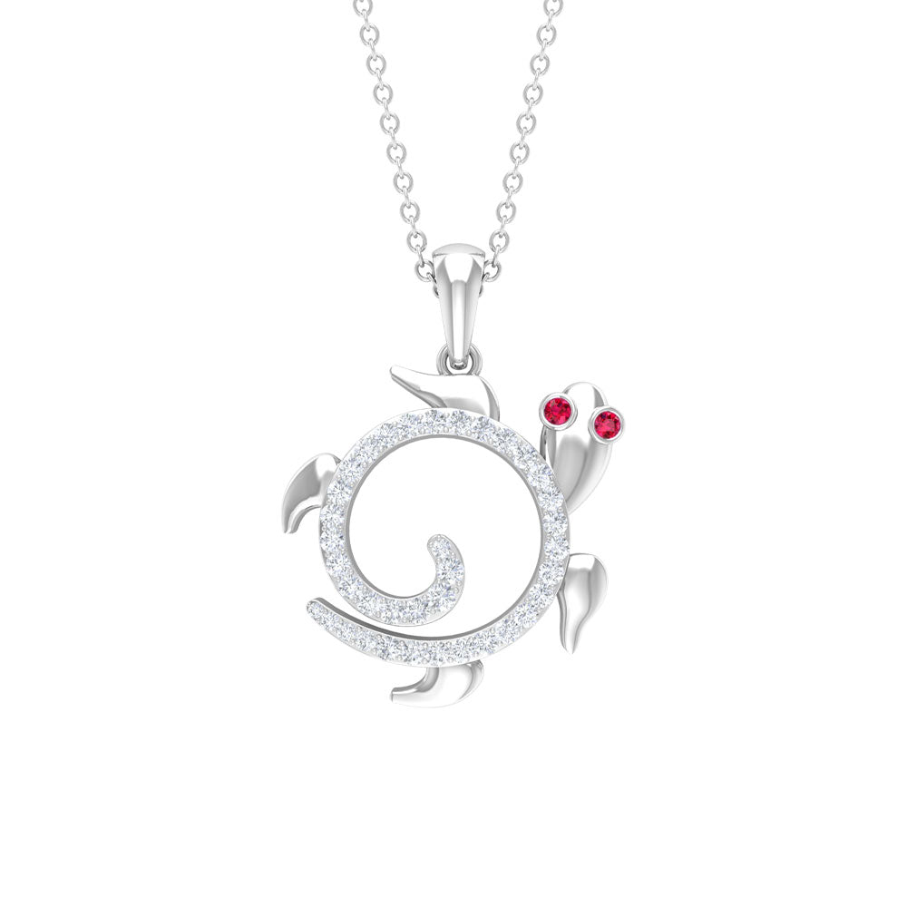 Bring a touch of fun and charm to your jewelry collection with this adorable Turtle Pendant Necklace. Designed to be cute and full of personality, this Animal Pendant features a playful turtle shape that instantly brings a smile. The turtle’s eyes are decorated with bright round rubies set in bezel setting, giving the pendant a lively and cheerful expression. The swirl shaped shell is beautifully highlighted with sparkling pave set diamonds. These tiny stones create a dazzling shine that catches the light from every angle, adding elegance without losing the fun look. The Ruby and Diamond Necklace hangs from a classic cable chain, making it easy to wear with everyday outfits or special looks. Its lightweight design ensures comfort, while its charming style makes it a lovely choice for any woman of any age who loves cute and meaningful jewelry. This Ruby Turtle Necklace is perfect for anyone who enjoys playful accessories with a touch of sparkle. Whether given as a gift or added to your own collection, it is a piece that brings joy, warmth, and a bit of whimsy to any day.