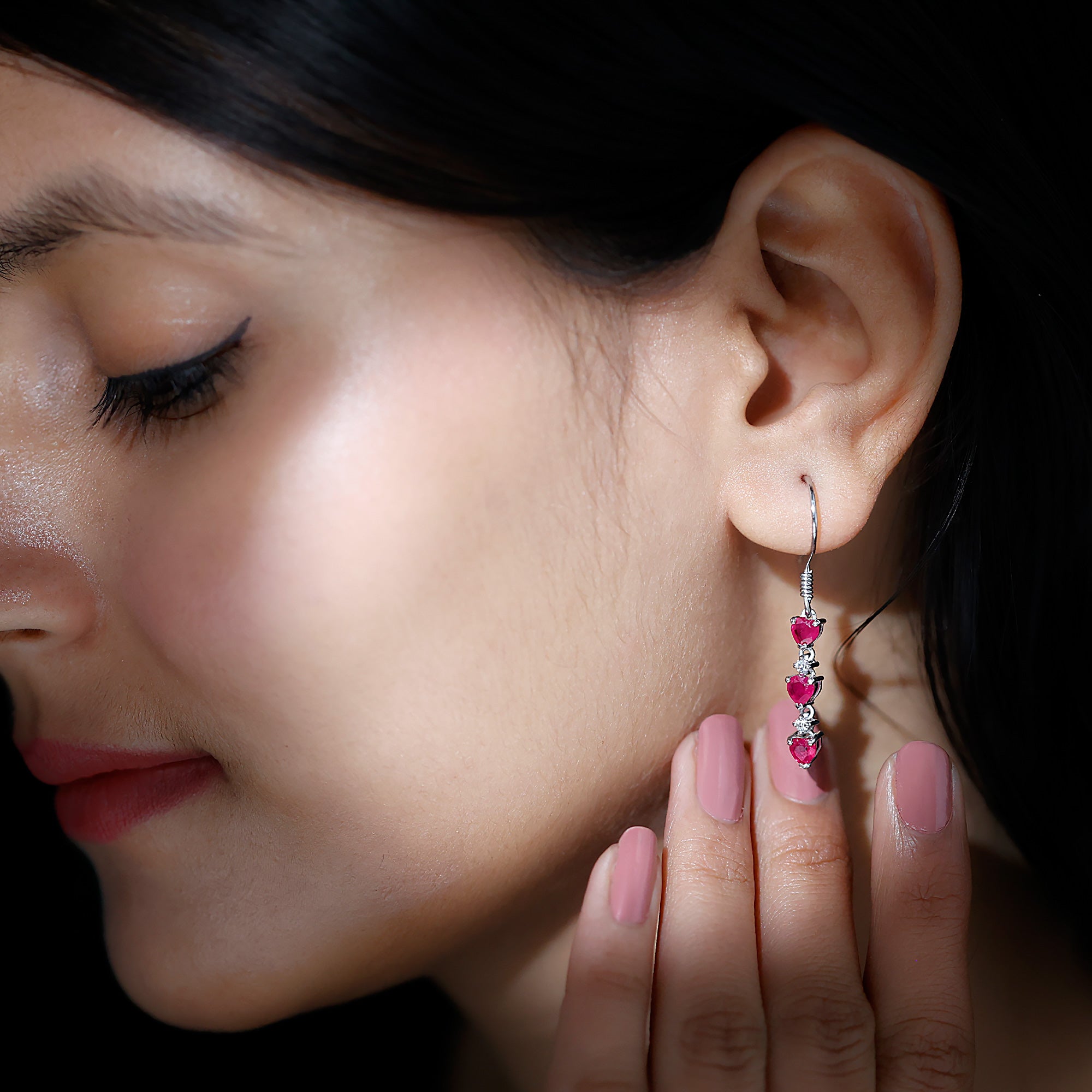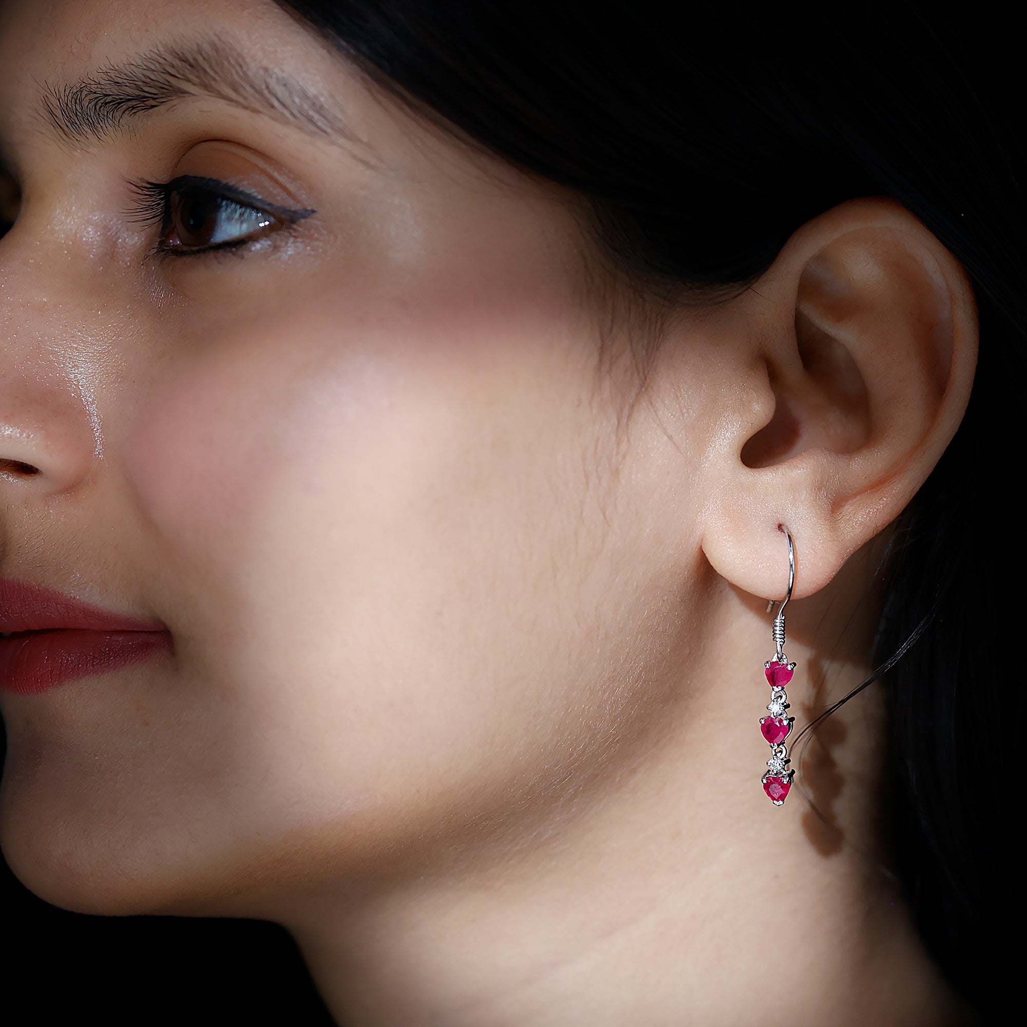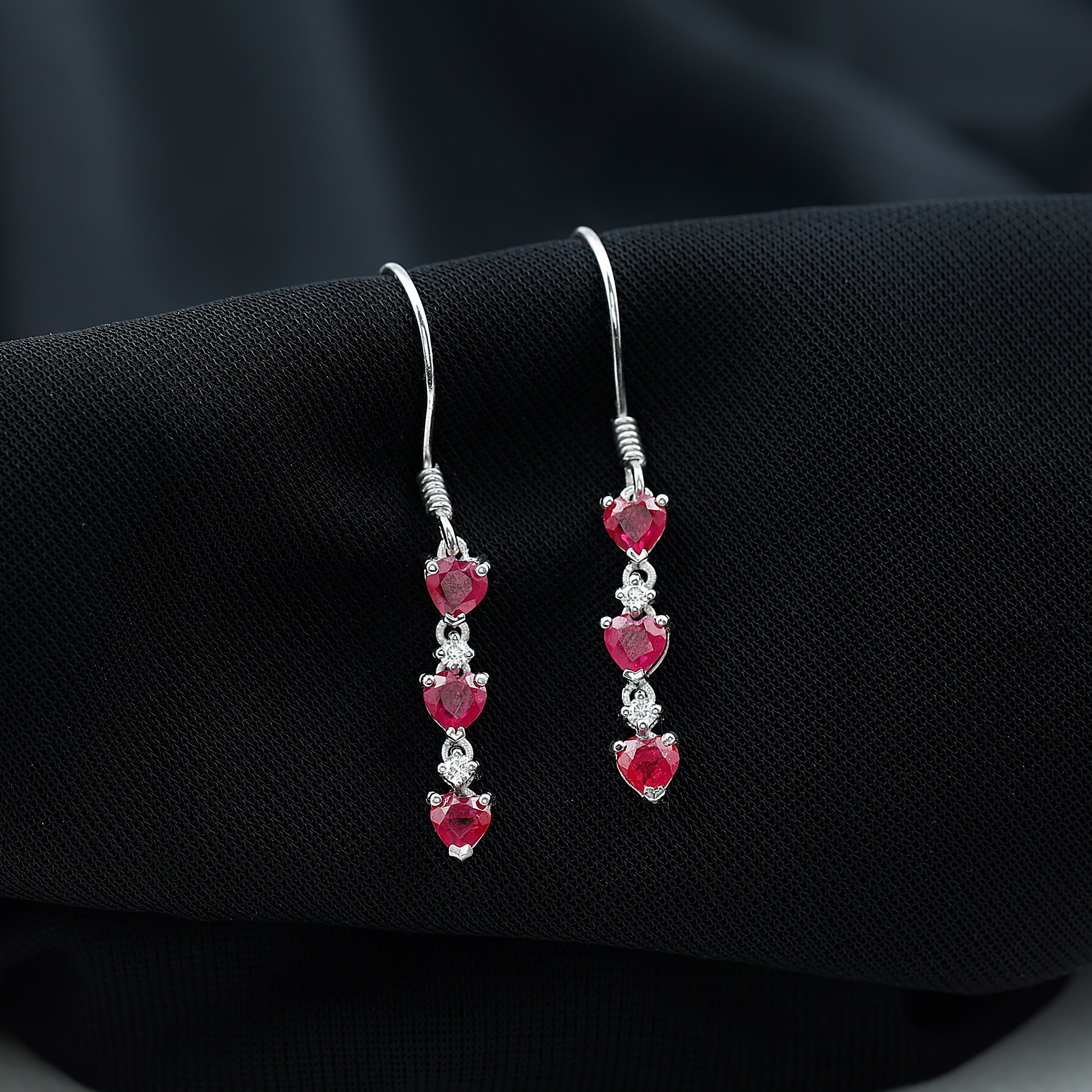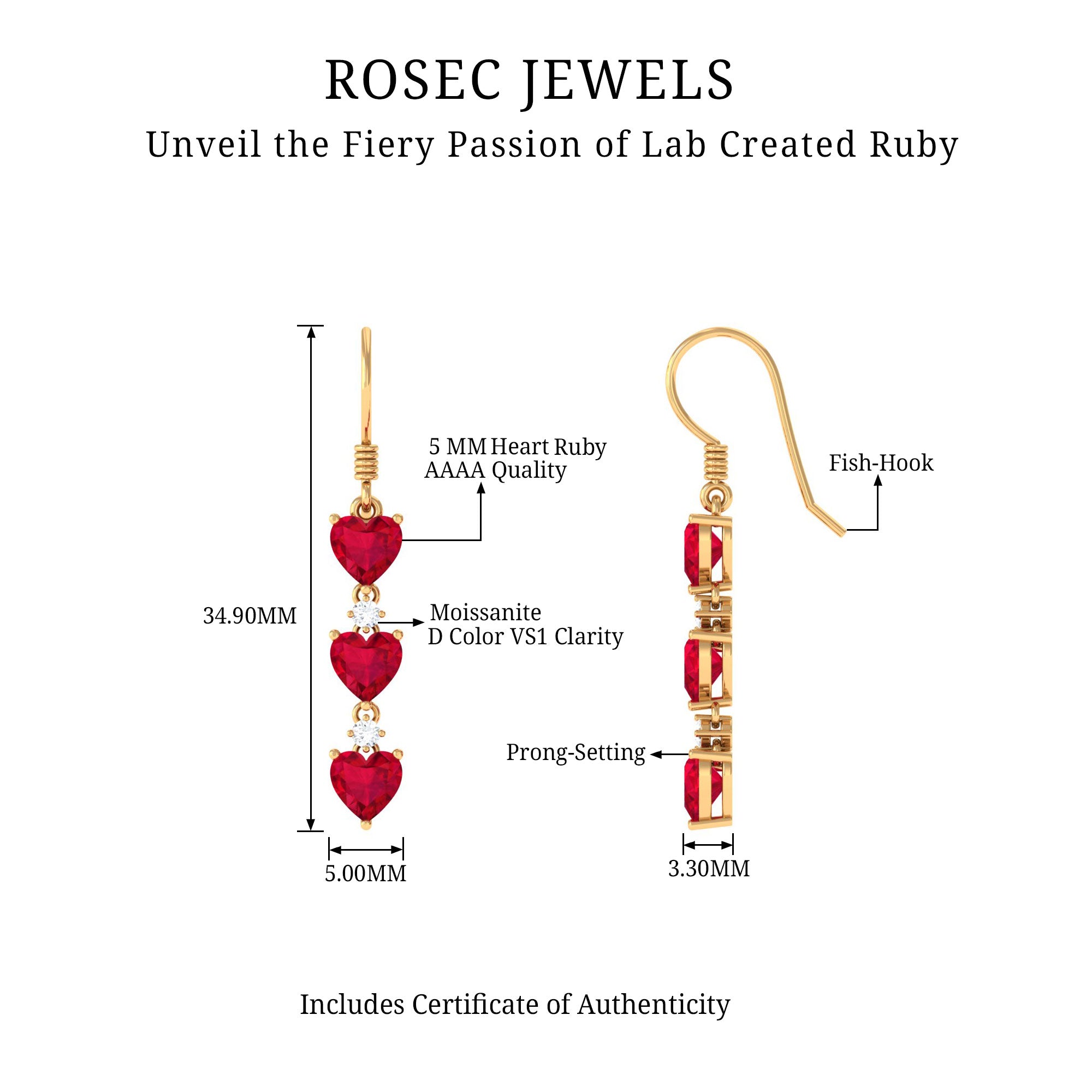 Fall in love with these Heart Dangle Earrings, symbolizing enduring love and devotion. These Fine Earrings showcase three 5 MM Heart Shape Lab Created Ruby gemstones held in Prong Setting, complemented by gleaming Moissanite gemstones. Hanging delicately from a Fish Hook, they capture the essence of romance and elegance.