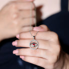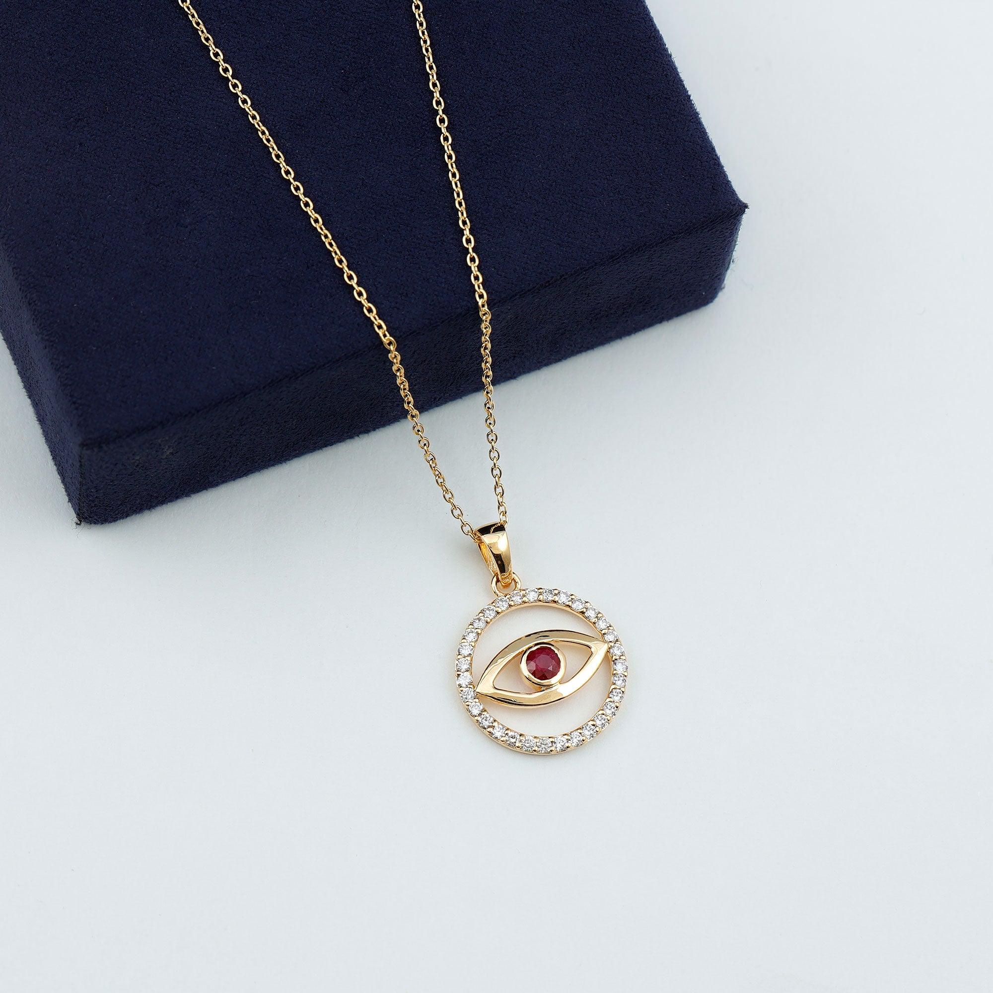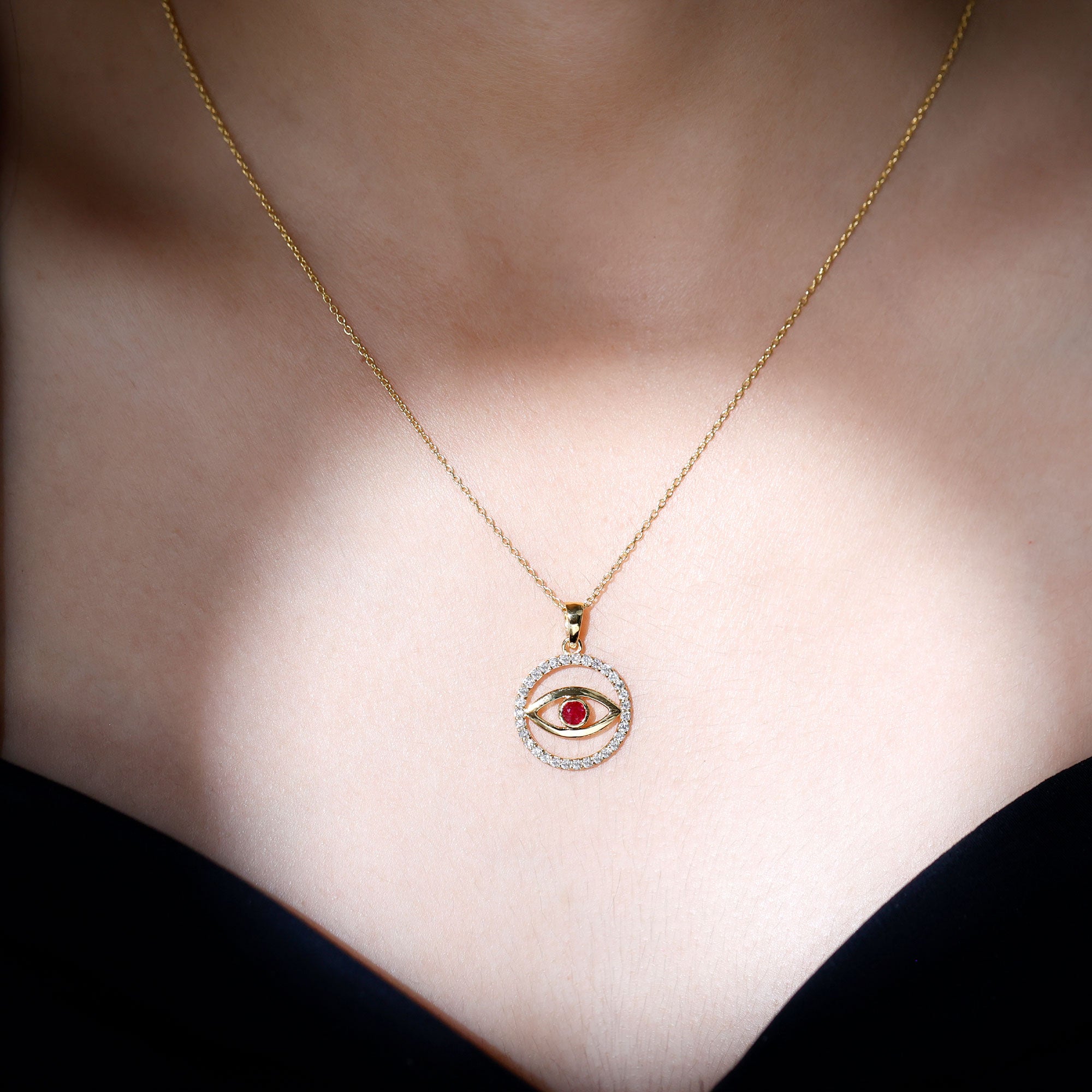 The Evil Eye Pendant is a striking piece of jewelry that exudes just the perfect level of allure and makes an excellent present for someone special. The Eternity Pendant Necklace showcases a Round Shape Ruby that sits in a Bezel Setting at the center of the Eternity Circle. The circle is embellished with Brilliant Cut Diamond, creating a stunning and refined appearance. Wearing this pendant will elevate your outfit and bring a touch of sophistication to your overall look.