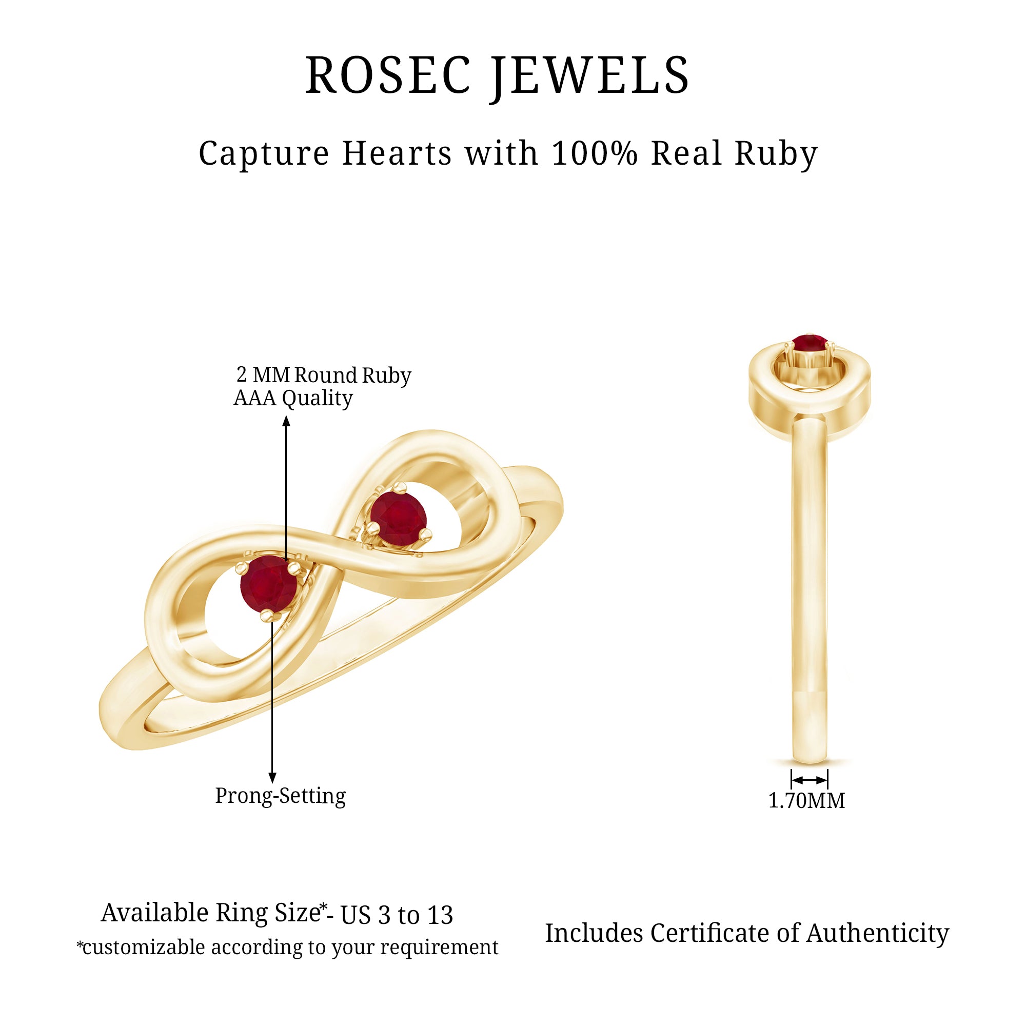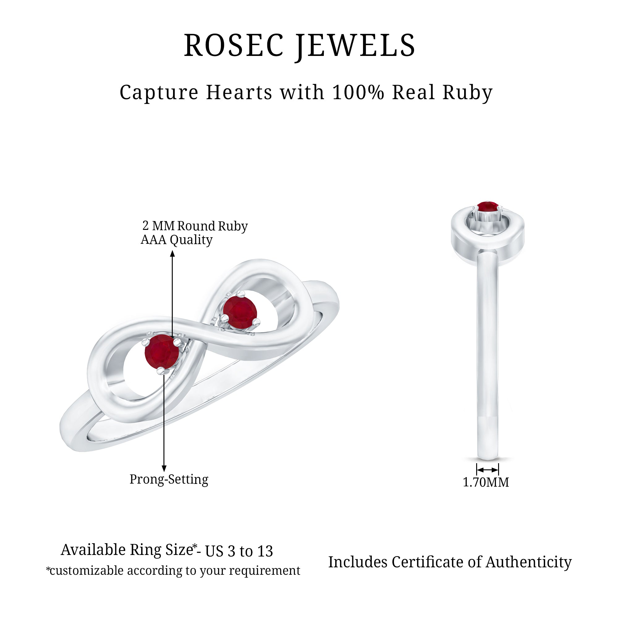 The Lab Ruby Infinity Promise Ring encapsulates the essence of eternal love and beauty with its dazzling design. This exquisite piece of July Birthstone Ring elegantly combines the timeless infinity symbol with the concept of everlasting love. The boundless love and the beautiful infinity symbolize an unbreakable bond between two individuals. Adorned with 2 Round Shape Rubies in Prong Setting, this Promise Ring for Her is a beautiful celebration of individuality and style. This ring serves as a meaningful emblem of enduring bonds, cherished memories, and the unique qualities that contribute to a relationship.