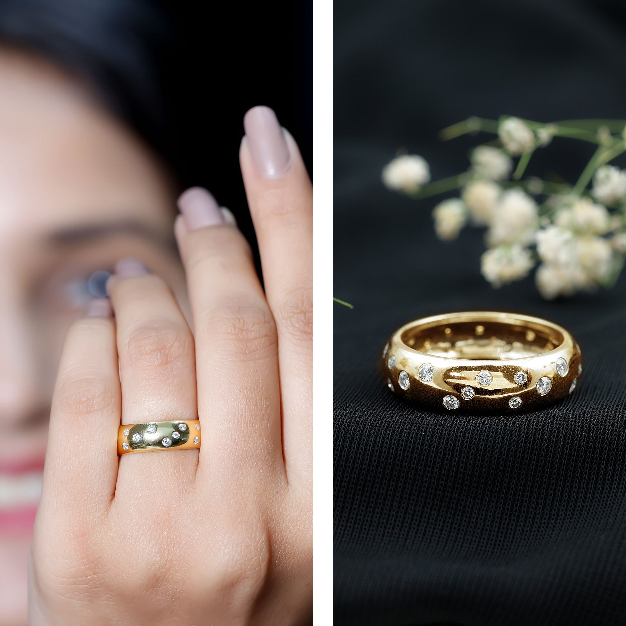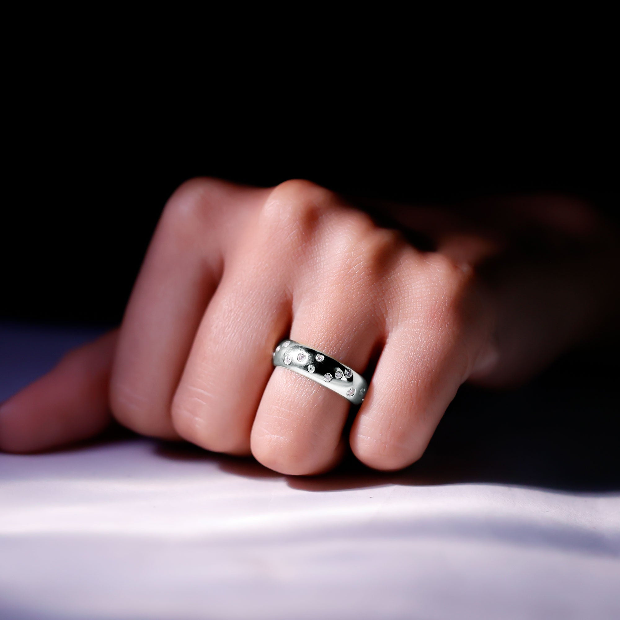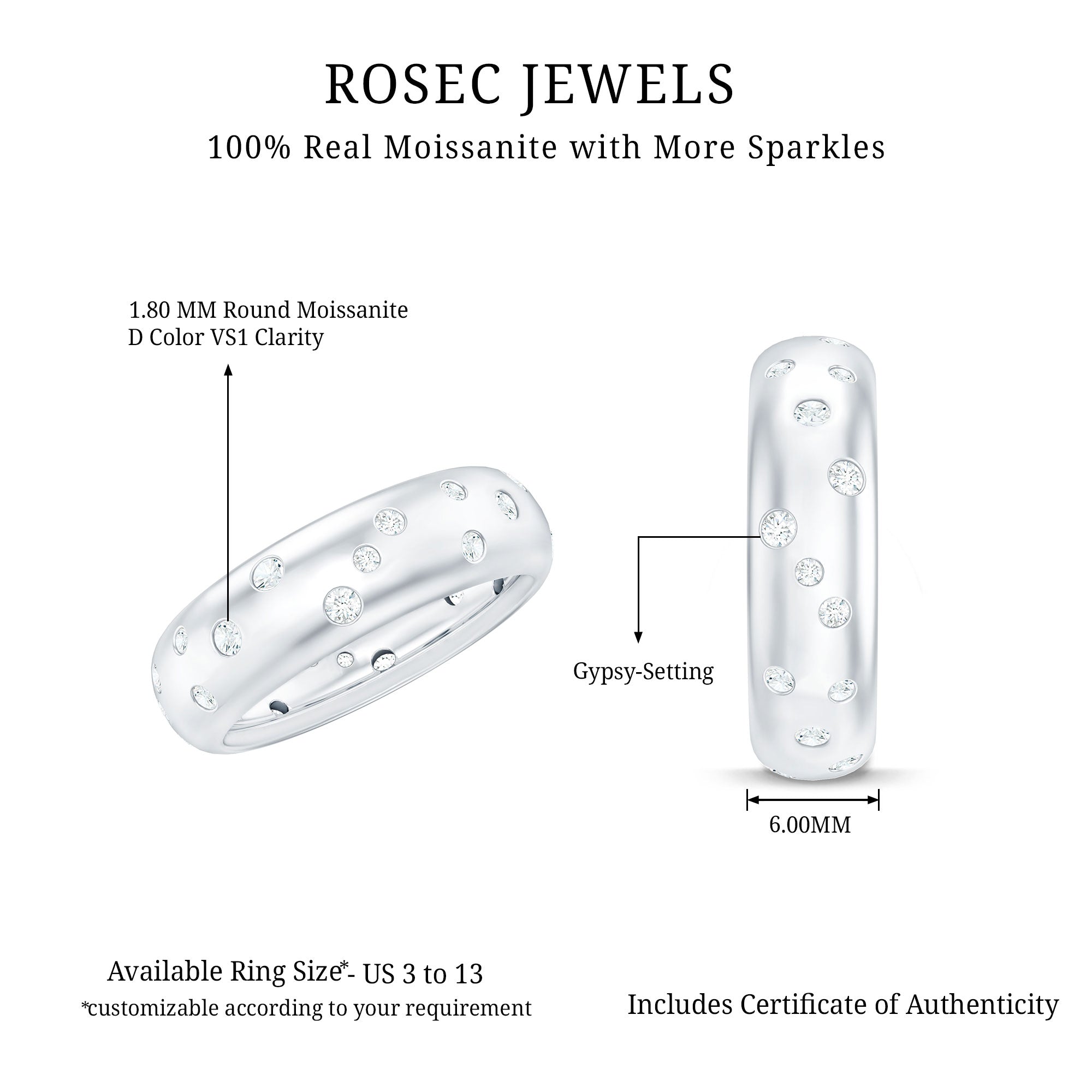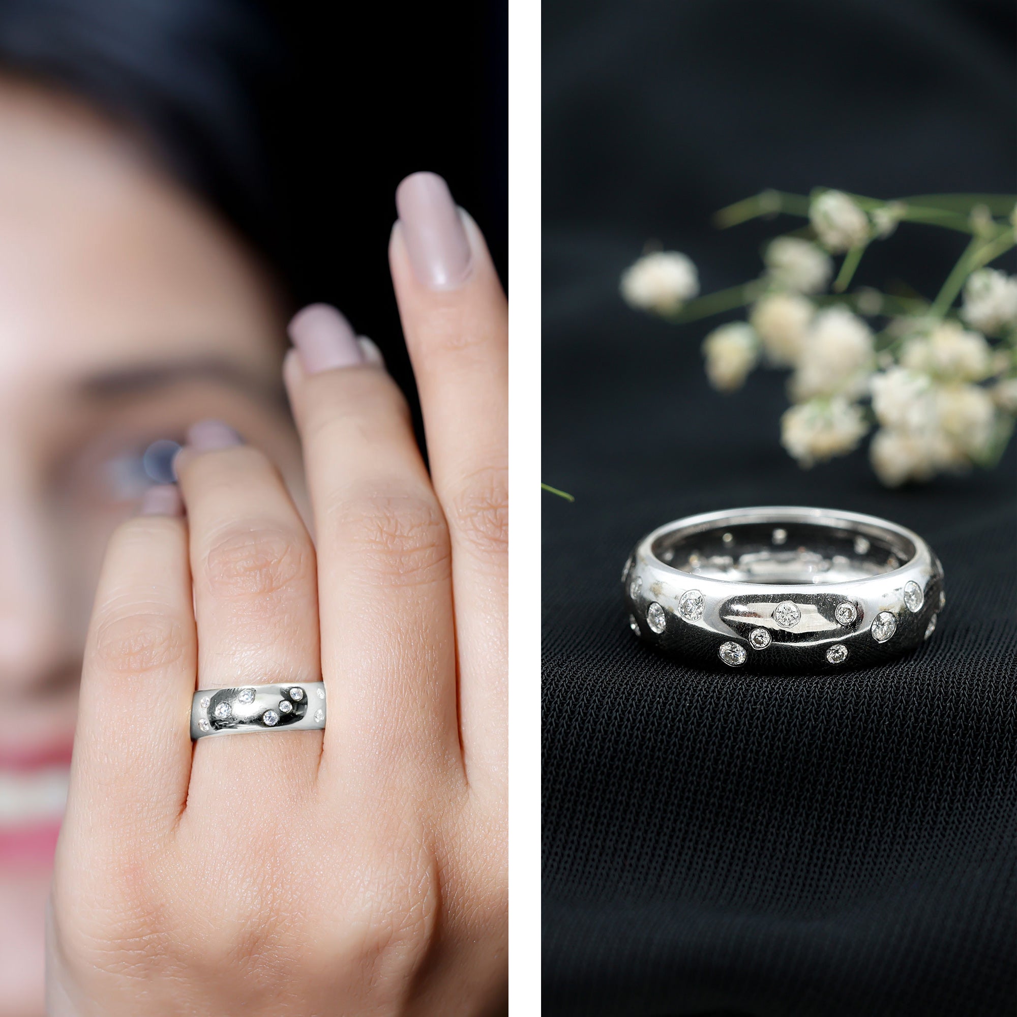 This beautiful Wide Wedding Band features round cut moissanite stones set in unique gypsy setting. The stones are scattered all over the wide band, creating a sparkling and eye-catching effect from every angle. The design is modern yet elegant, perfect for those who want a wedding band that stands out without being too flashy. Each moissanite stone in this band is of D-VS1 quality, meaning they are nearly flawless and extremely clear. This high quality ensures the Moissanite Band Ring shines brilliantly and lasts a lifetime. This Moissanite Wedding Band offers a comfortable fit and a bold look, making it an excellent choice for everyday wear or special occasions. It will come with a certificate of authenticity, guaranteeing the quality and value of the moissanite stones. It will be beautifully presented in a jewelry box, ready for gifting or safekeeping. This Scatter Band combines style, comfort, and quality in one stunning piece. It is perfect for anyone looking for a unique and sparkling band that shines with brilliance and durability.