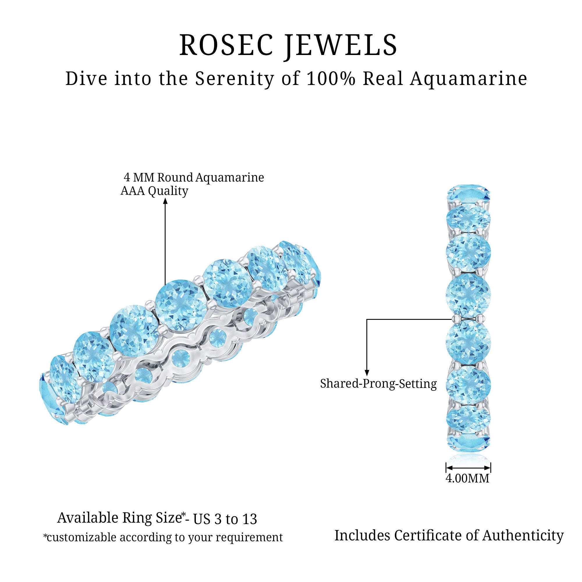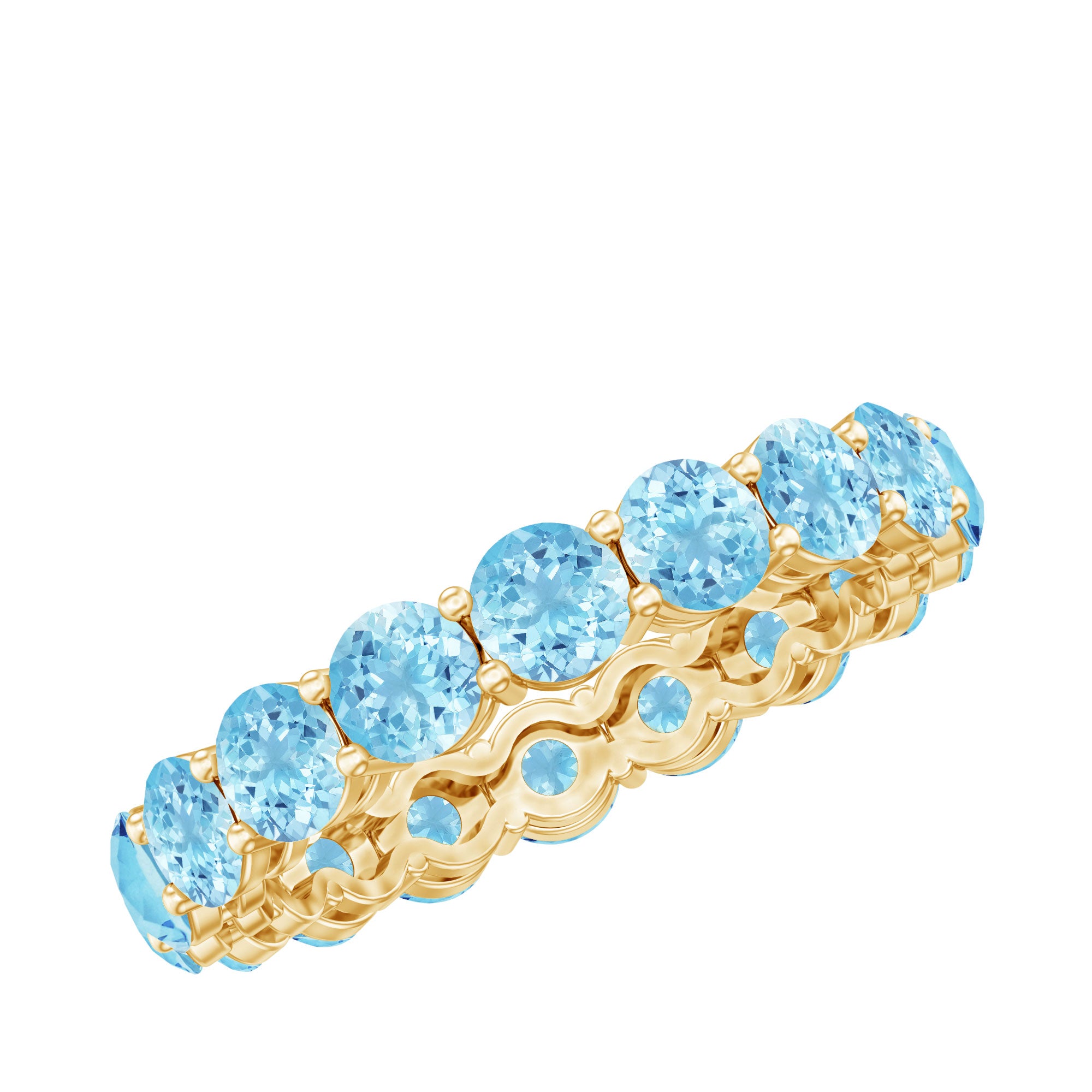 Commemorate your wedding anniversary with the gift of an Aquamarine Eternity Ring. Round-cut aquamarine stones adorn the shared prong setting, encircling the entire ring, ensuring it radiates brilliance and makes her shine with joy.