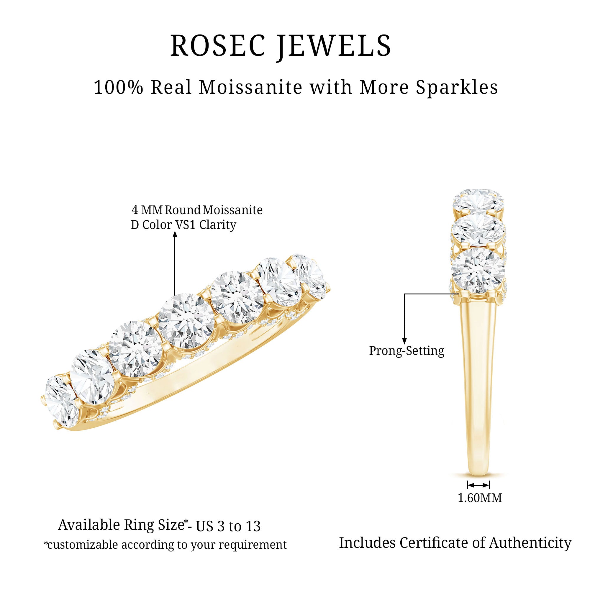 This Moissanite studded Elegant Wedding Ring beholds a shimmering presence that radiates a sense of refined charm. Alongside, the coastal crescent designs, adorned with dainty moissanite stones, introduce a distinctive touch to the border, amplifying its brilliance. Make your lady a surprise with this 7 Stone Ring which symbolizes your prominent commitment to her. The brightness of the D-VS1 Quality Moissanite embedded in this ring will be reflected in her eyes when you present it to her. This Certified Band Ring will be delivered to you in the signature jewelry box with the certificate of gemstone authentication.