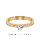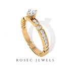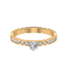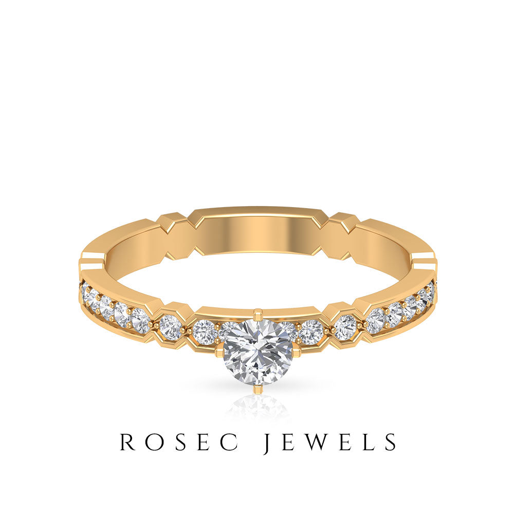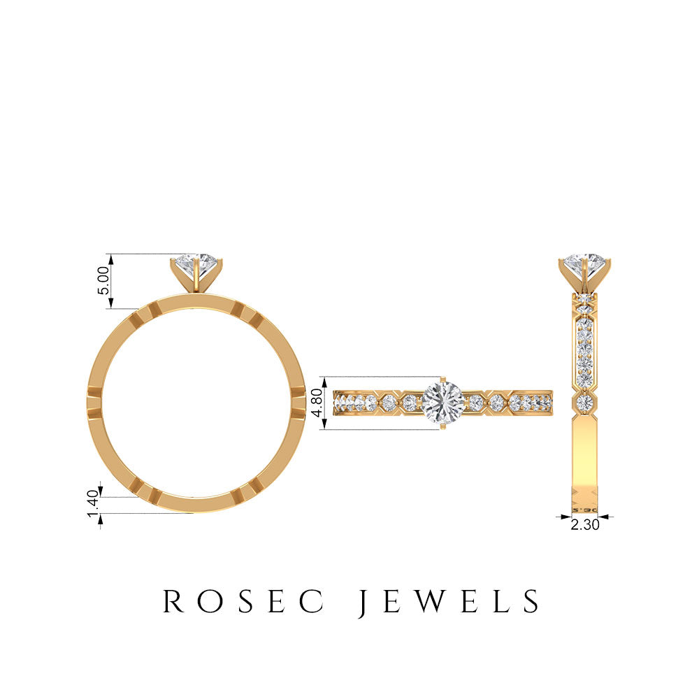 Modern and Classic Diamond Solitaire Engagement Ring is embellished with the Round Shape Solitaire Diamond as a centerpiece and small Round Shape Diamonds engraved in 4 Prong Diagonal Peg Head Setting. Antique Women Statement Ring is composed of 14K Gold. An ideal accessory for women.