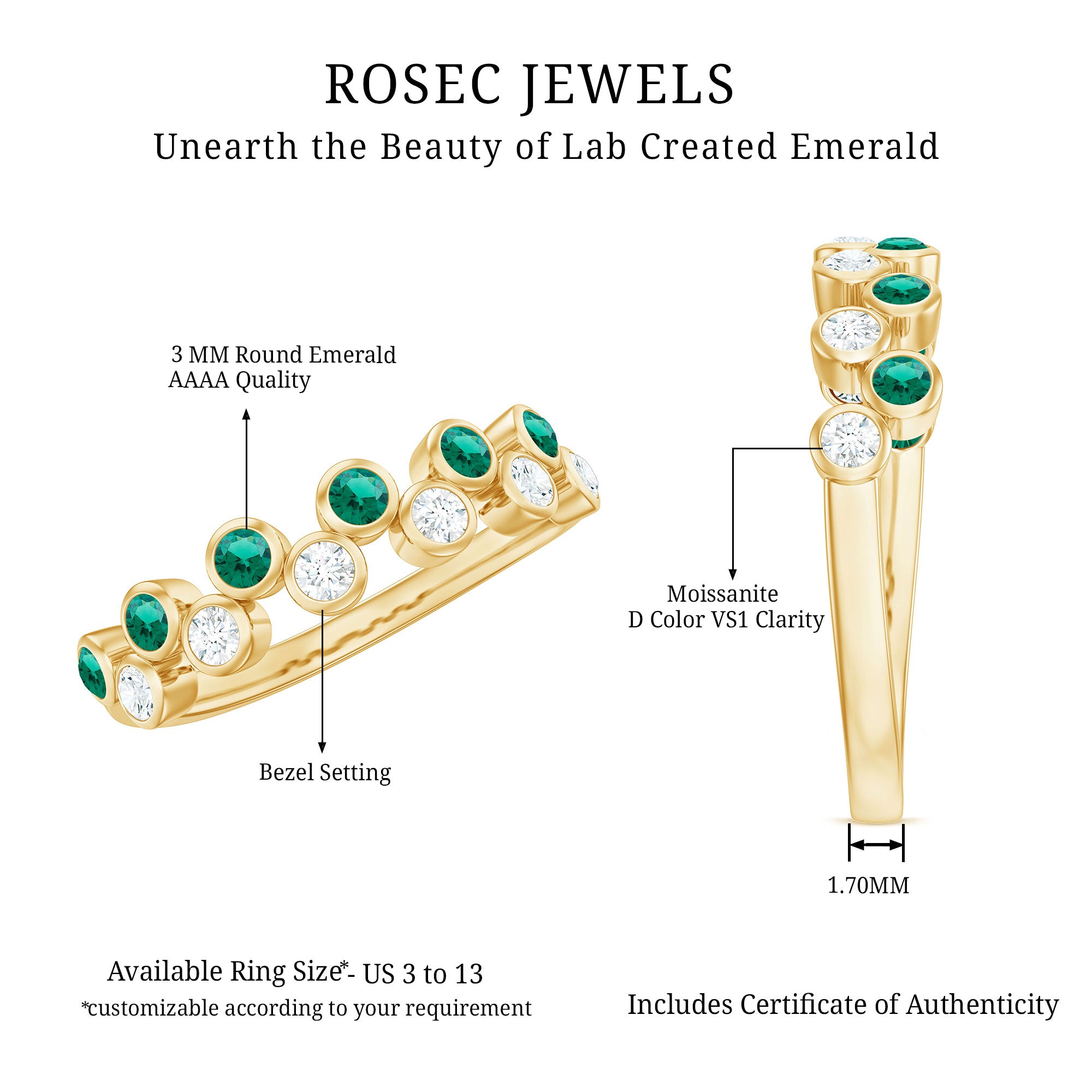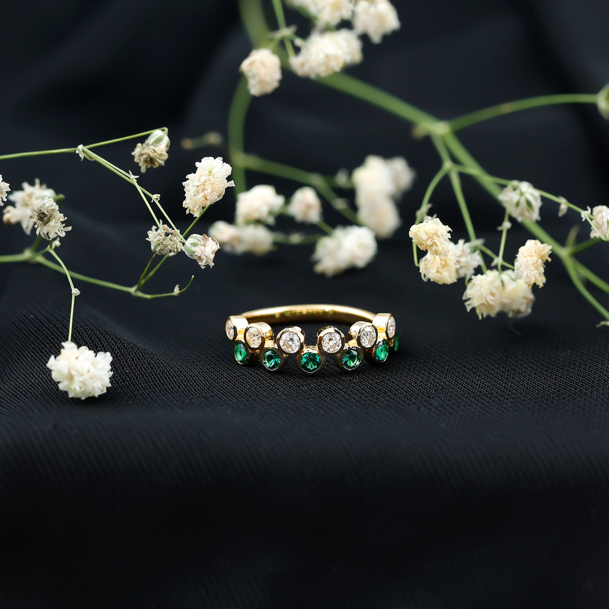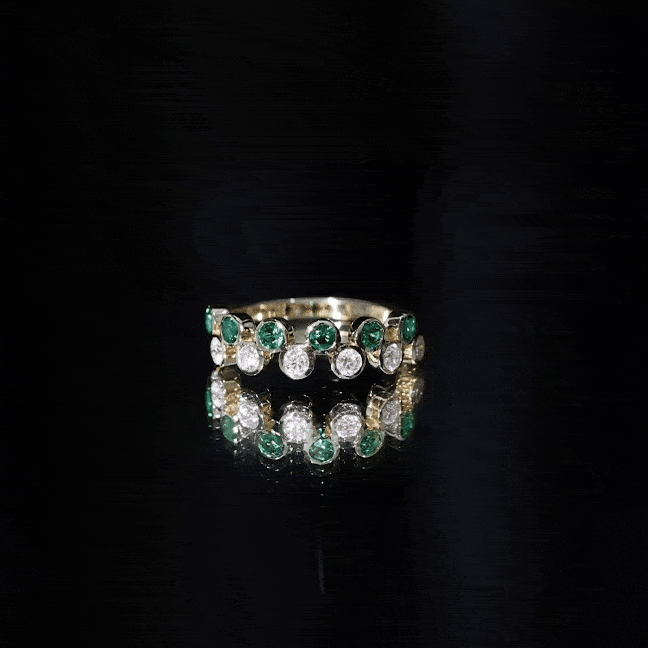 This simple yet elegant half eternity ring features alternating round cut created emerald sapphire and Moissanite in bezel setting in a gleaming gold band. The bezel setting provides a secure and understated backdrop for the gems, letting their natural beauty take center stage. The band ring is perfect for everyday wear or as a stackable piece with other rings. The combination of the rich created emerald and sparkling Moissanite creates a stunning and timeless look that is sure to be treasured for years to come.