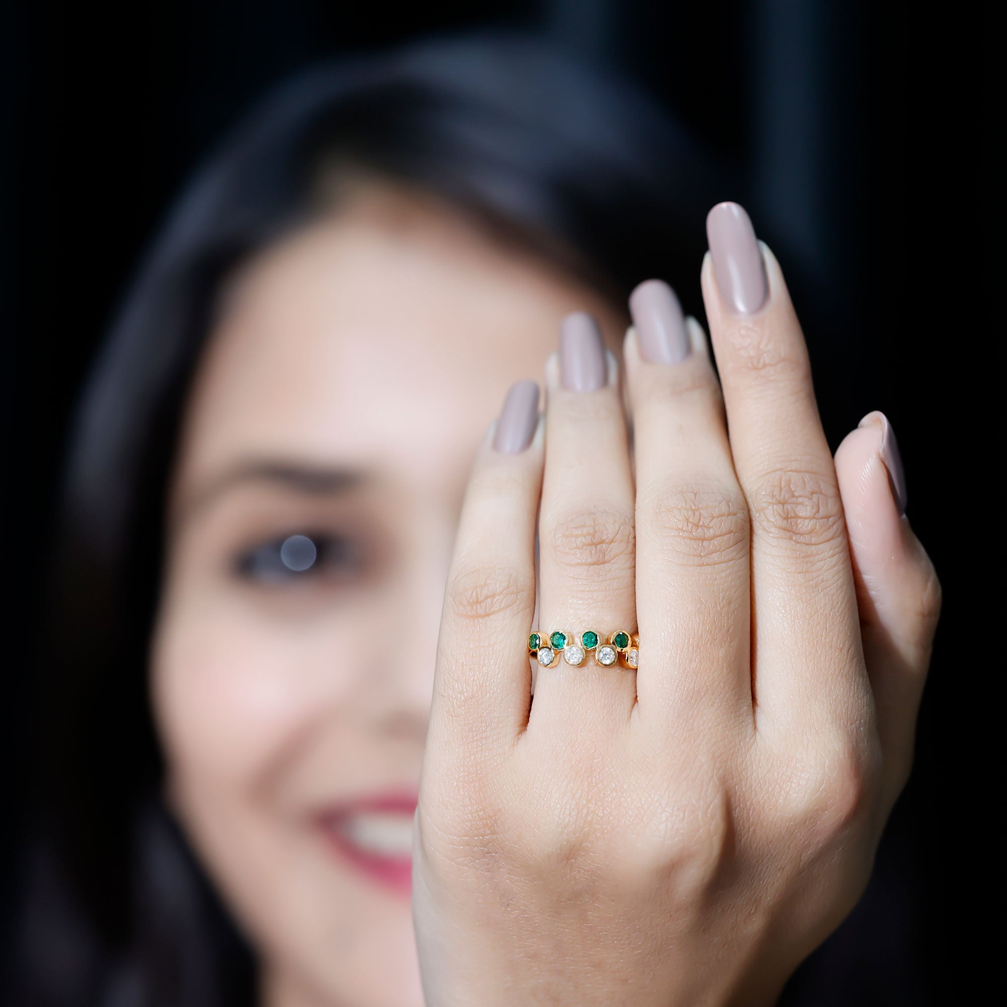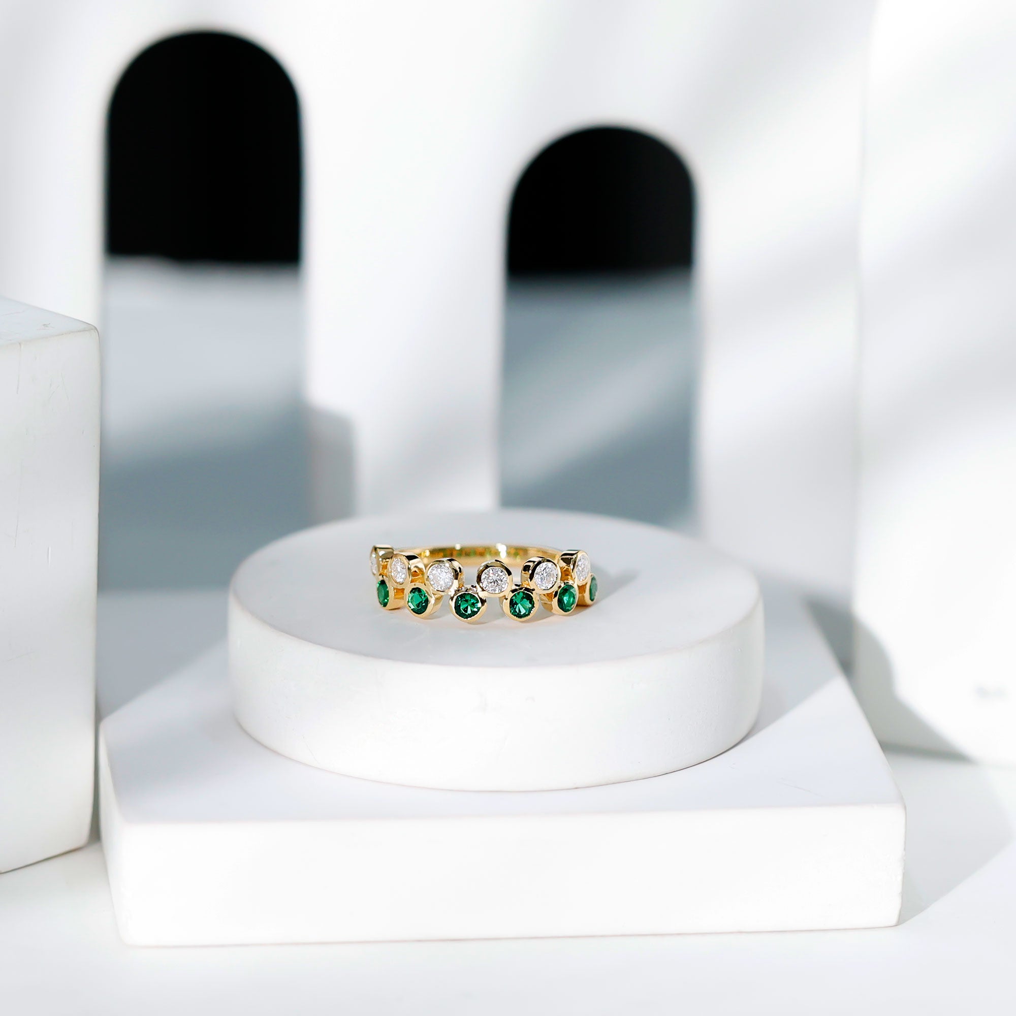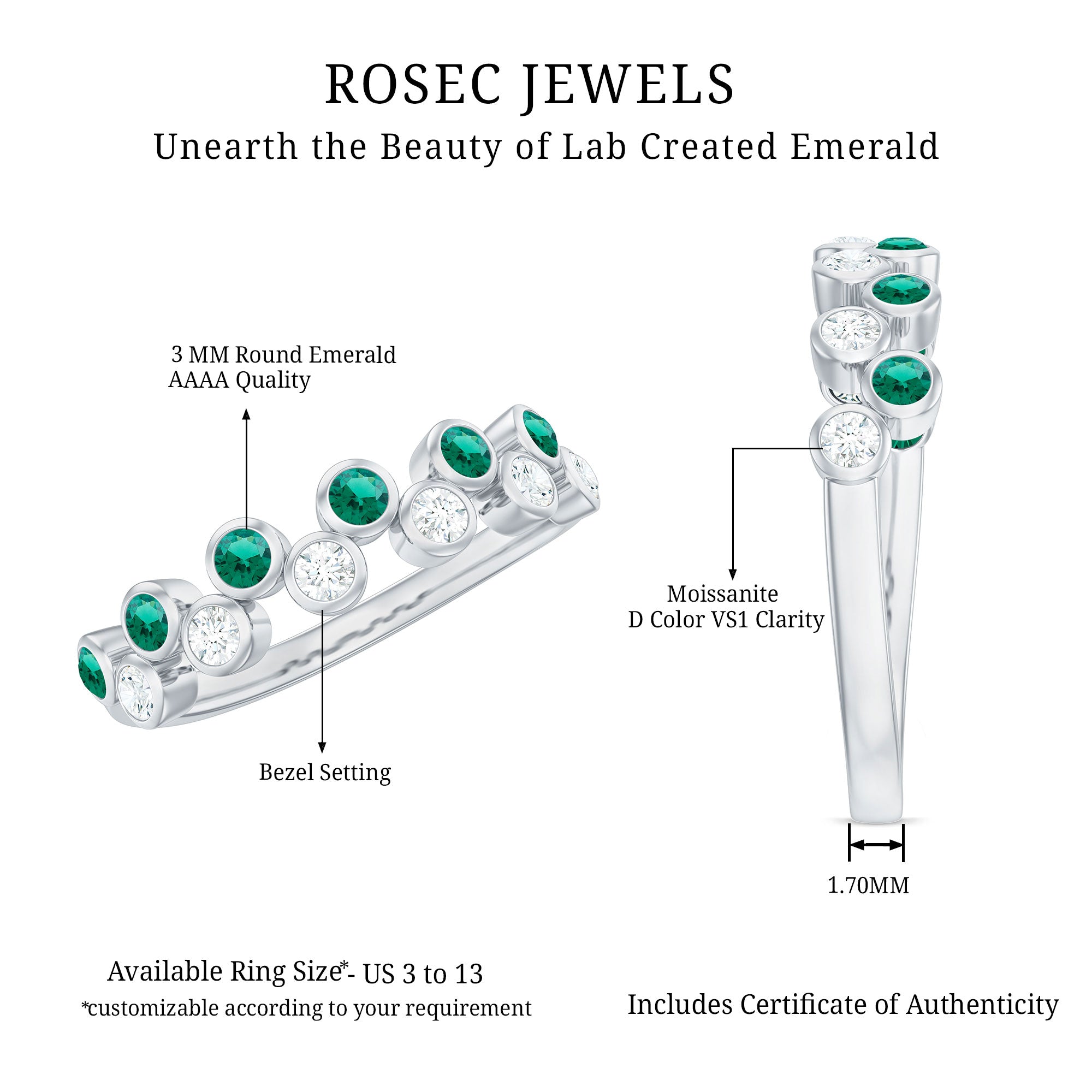 This simple yet elegant half eternity ring features alternating round cut created emerald sapphire and Moissanite in bezel setting in a gleaming gold band. The bezel setting provides a secure and understated backdrop for the gems, letting their natural beauty take center stage. The band ring is perfect for everyday wear or as a stackable piece with other rings. The combination of the rich created emerald and sparkling Moissanite creates a stunning and timeless look that is sure to be treasured for years to come.