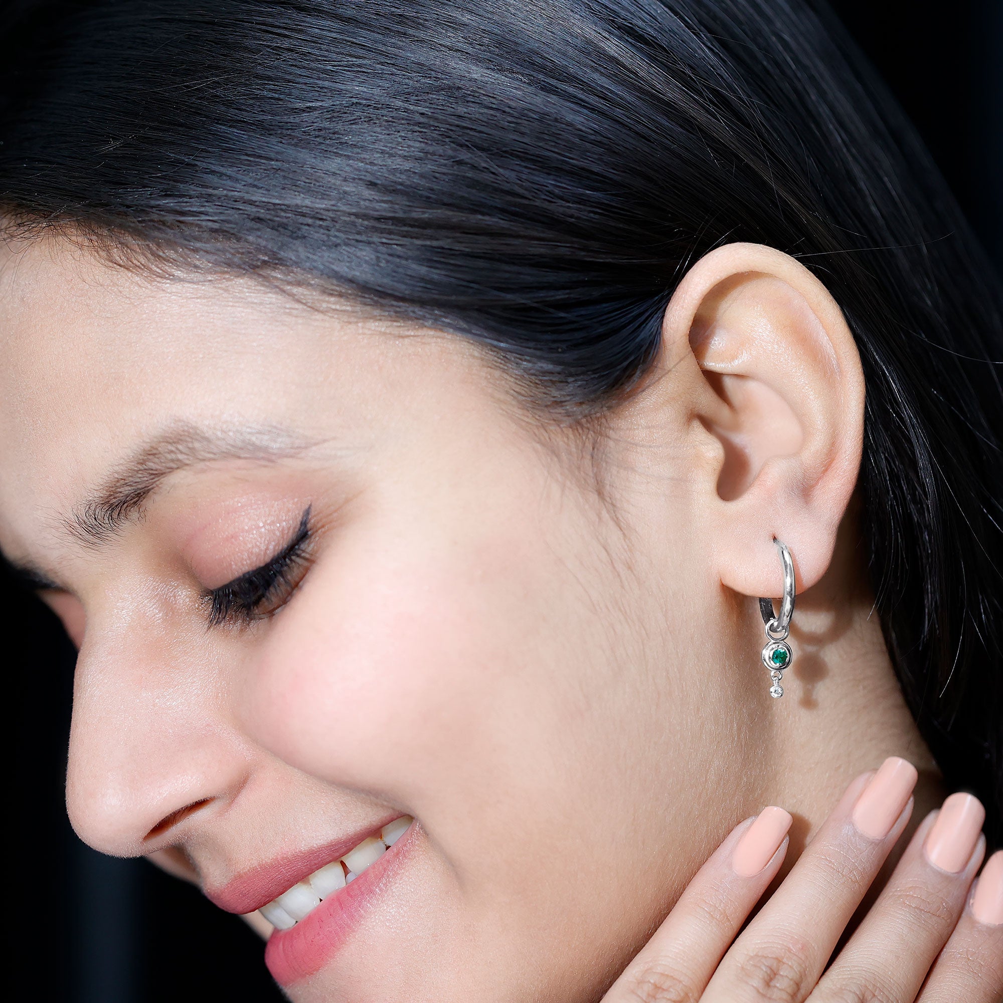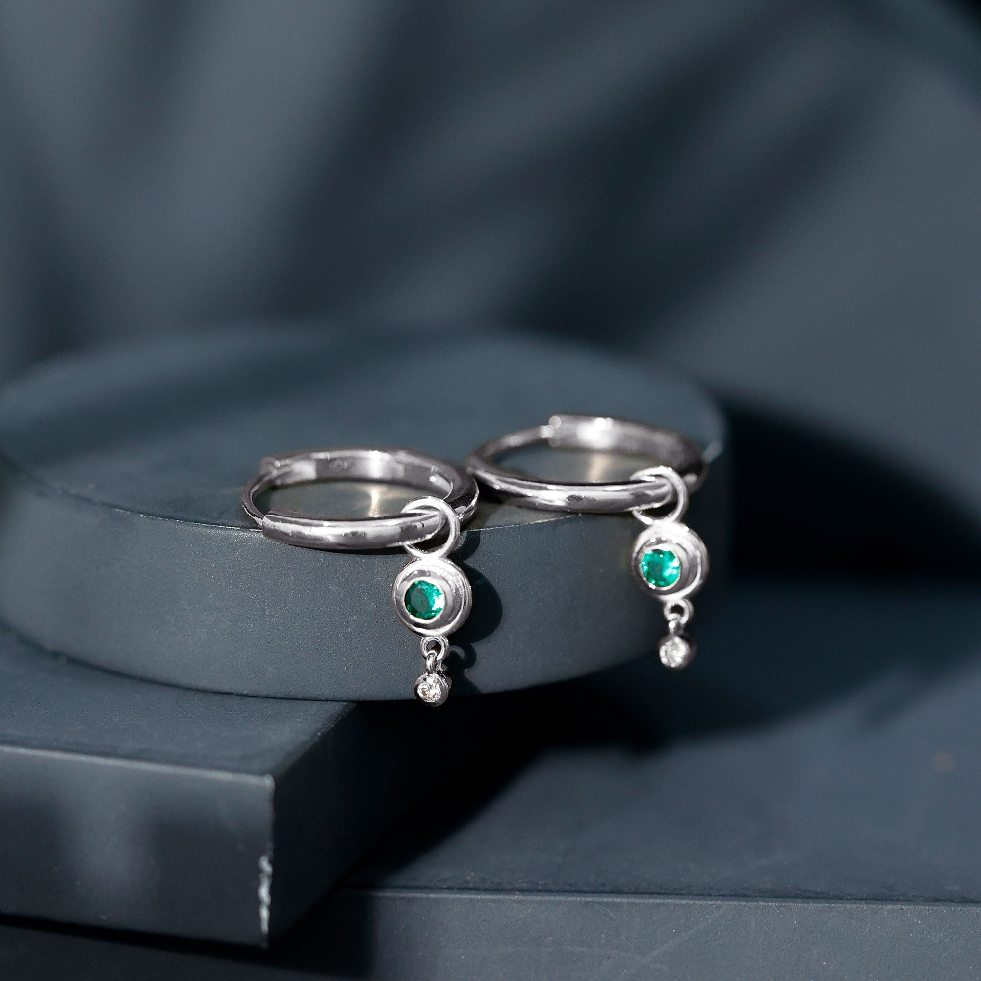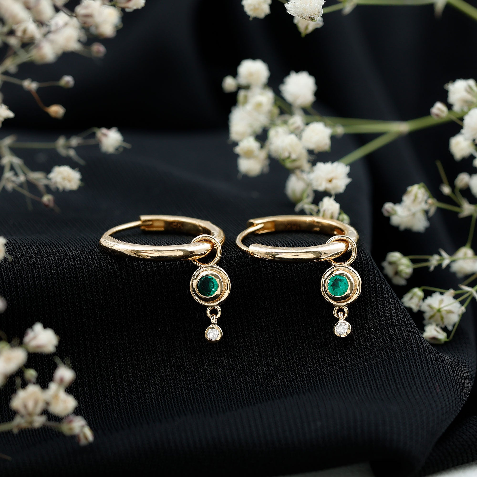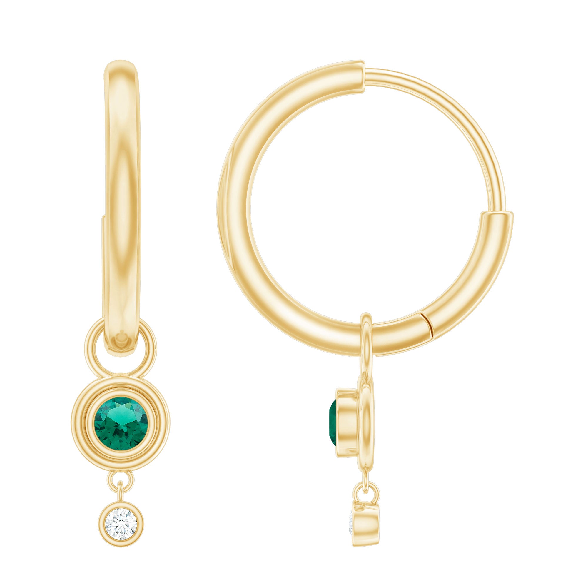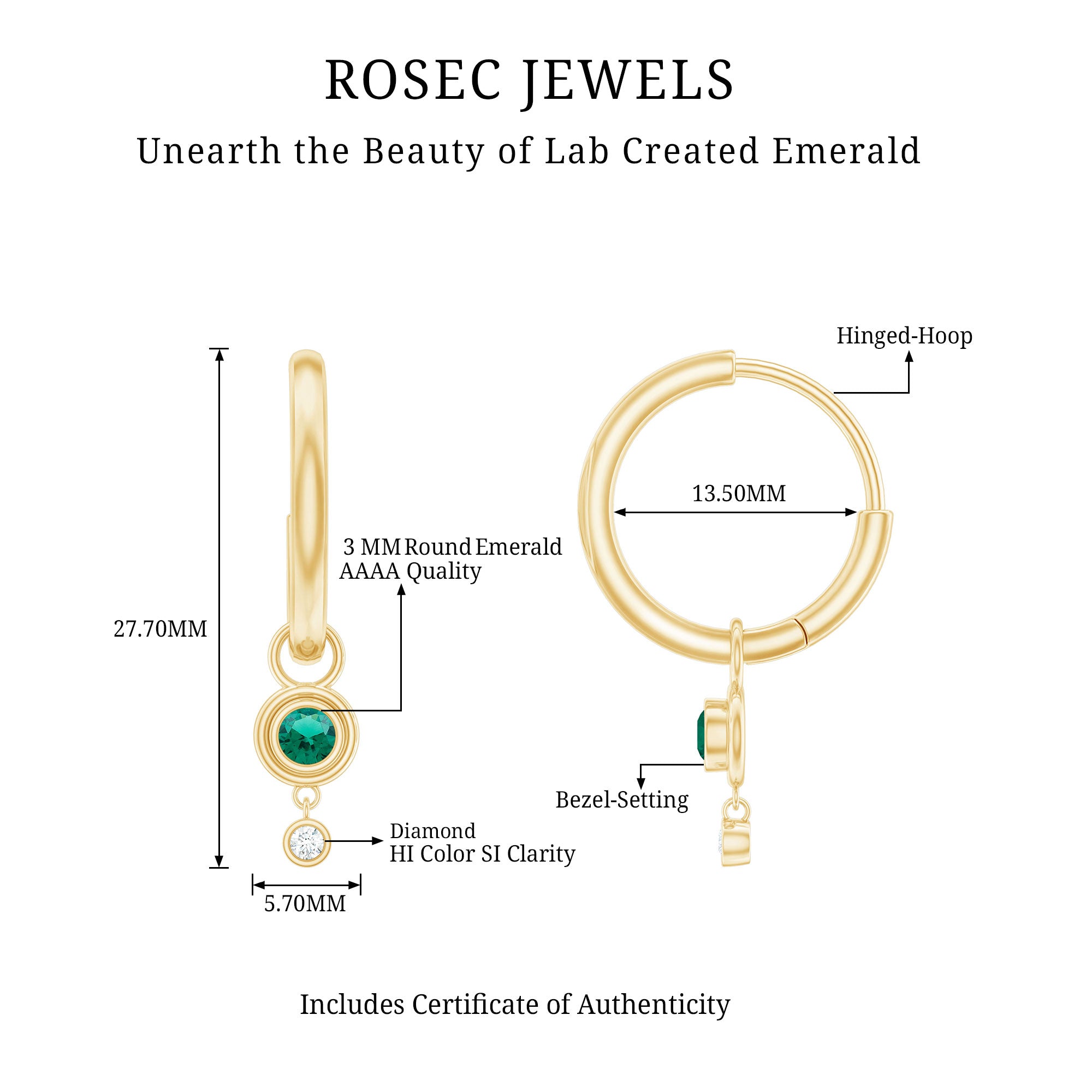 Create a delightful surprise for your beloved with these elegant Simple Hoop Drop Earrings, meant to make her feel truly cherished. These exquisite earrings showcase a Round Shape Created Emerald paired with a Diamond Drop, both delicately secured within a stylish Bezel Setting. Their convenient Hinged Hoop Back finding ensures both security and comfort.