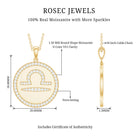 Embrace protection and style with our captivating Starsign jewelry featuring the exquisite Libra Zodiac Symbol adorned with a Round Cut Moissanite. This Libra Zodiac Disc Pendant serves as a profound October Zodiac Necklace, symbolizing your unique personality and offering a meaningful accessory to cherish.