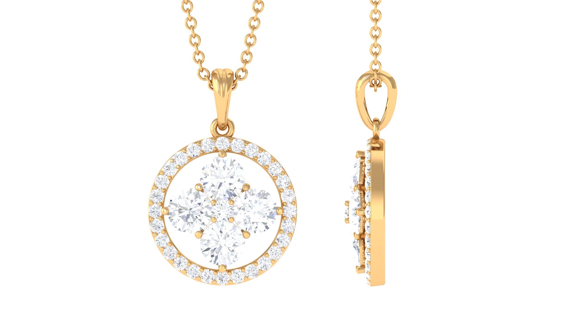 This stunning Moissanite Flower Pendant is embellished with Round Shape Moissanite assembled in a Floral Shape while more dainty Round Moissanite studded on the circular frame. This Moissanite Pendant is crafted with Hallmarked Metal and could easily match your most stylish outfits for you to look breathtakingly stunning, making it a perfect birthday present.
