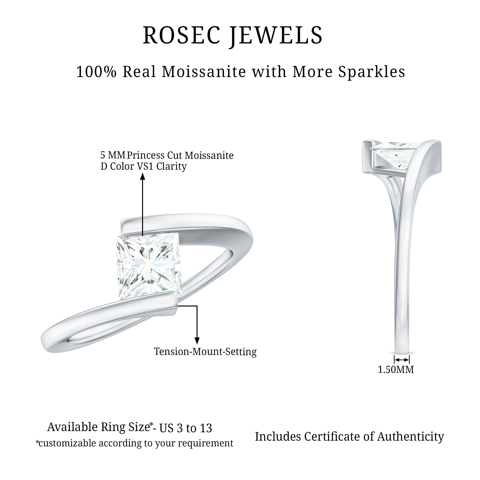Make your special occasion filled with love and promises more romantic by gifting this elegant Moissanite Ring. The Promise Ring, featuring a 5 MM Princess Cut Moissanite in a Tension Mount Setting, will bring tears of joy to her eyes and compliment her style with its glistening beauty. This Certified Moissanite Promise Engagement Ring is a piece of jewelry she will always treasure. The ring has a weight of 3/4 Carat and is of D Color and VS1 Clarity. All gemstones used undergo strict quality checks and are certified.