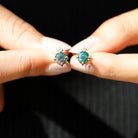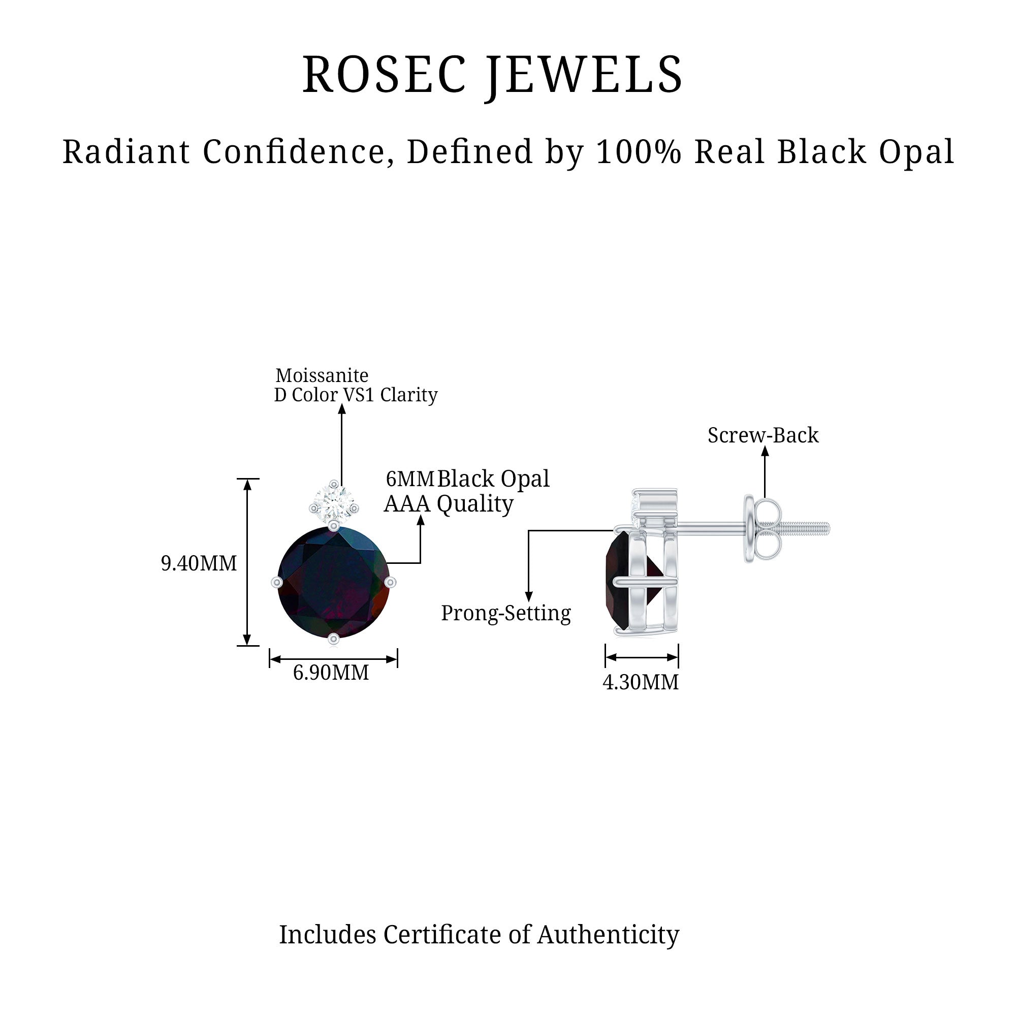 Introducing the Black Opal Earrings, the perfect everyday staple jewelry youve been searching for. Mesmerizing and captivating, these earrings feature a round cut Black Opal in a secure prong setting, with a charming Moissanite shining at the top. The solitaire design exudes elegance and sophistication. The earrings are equipped with a screw-back closure, ensuring a snug and secure fit.