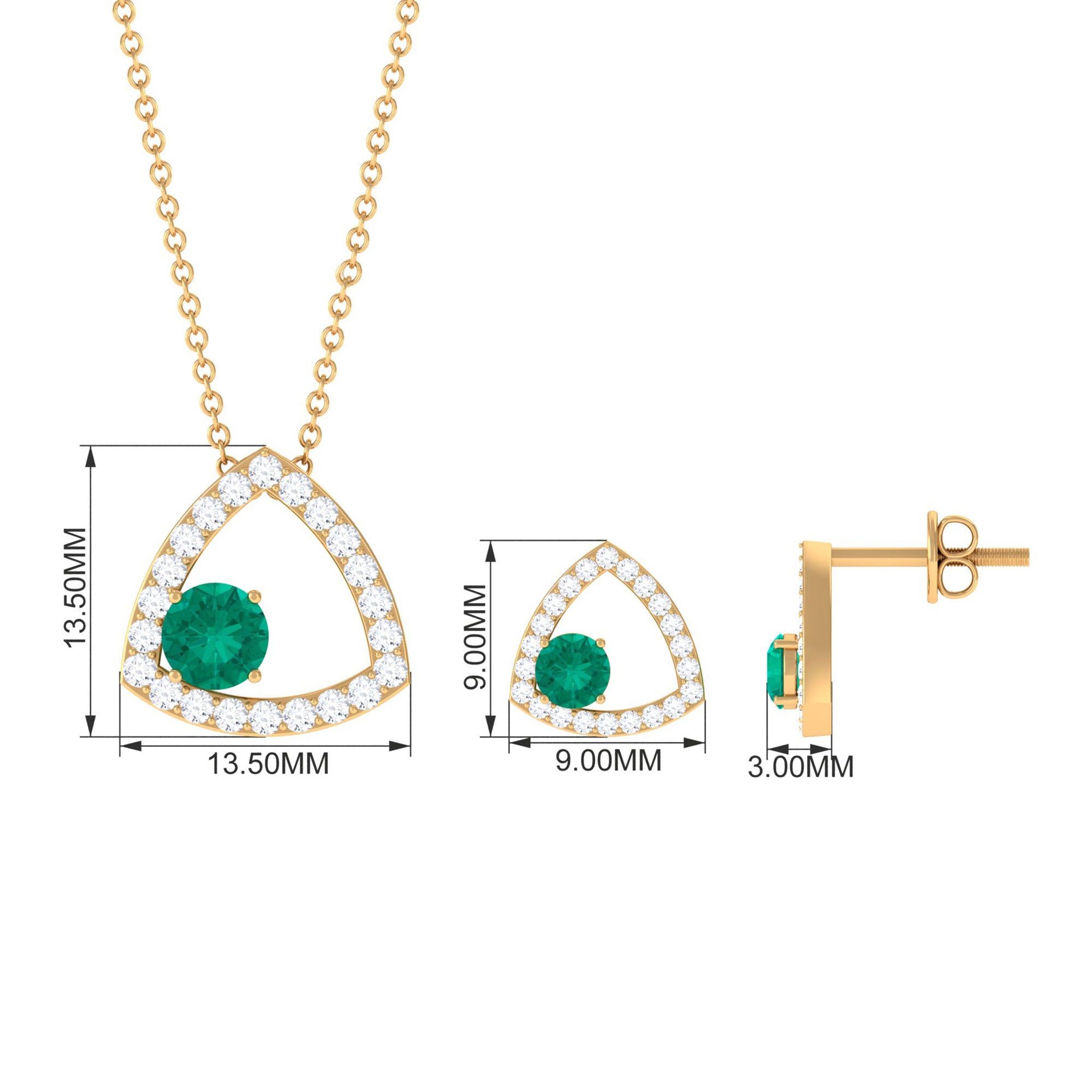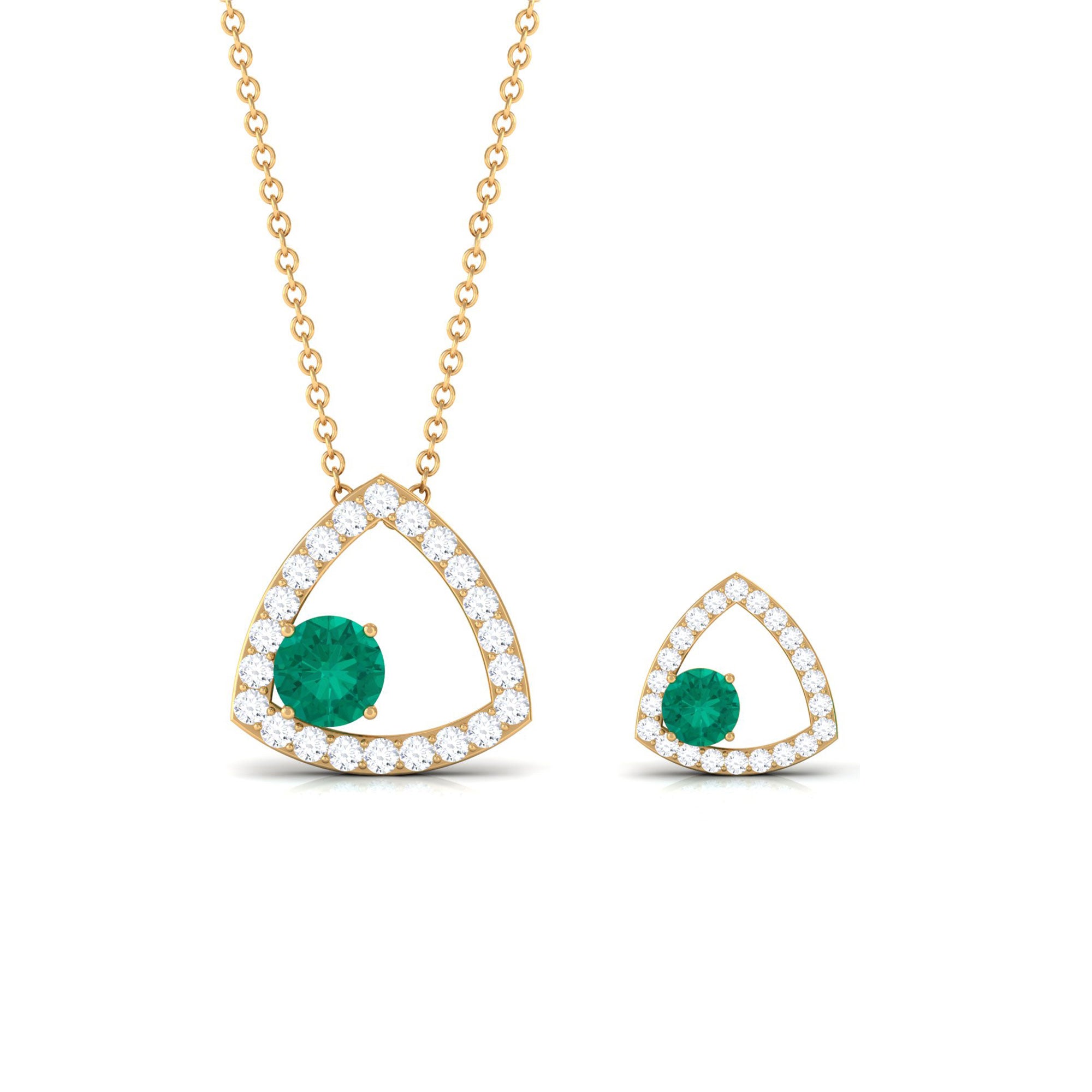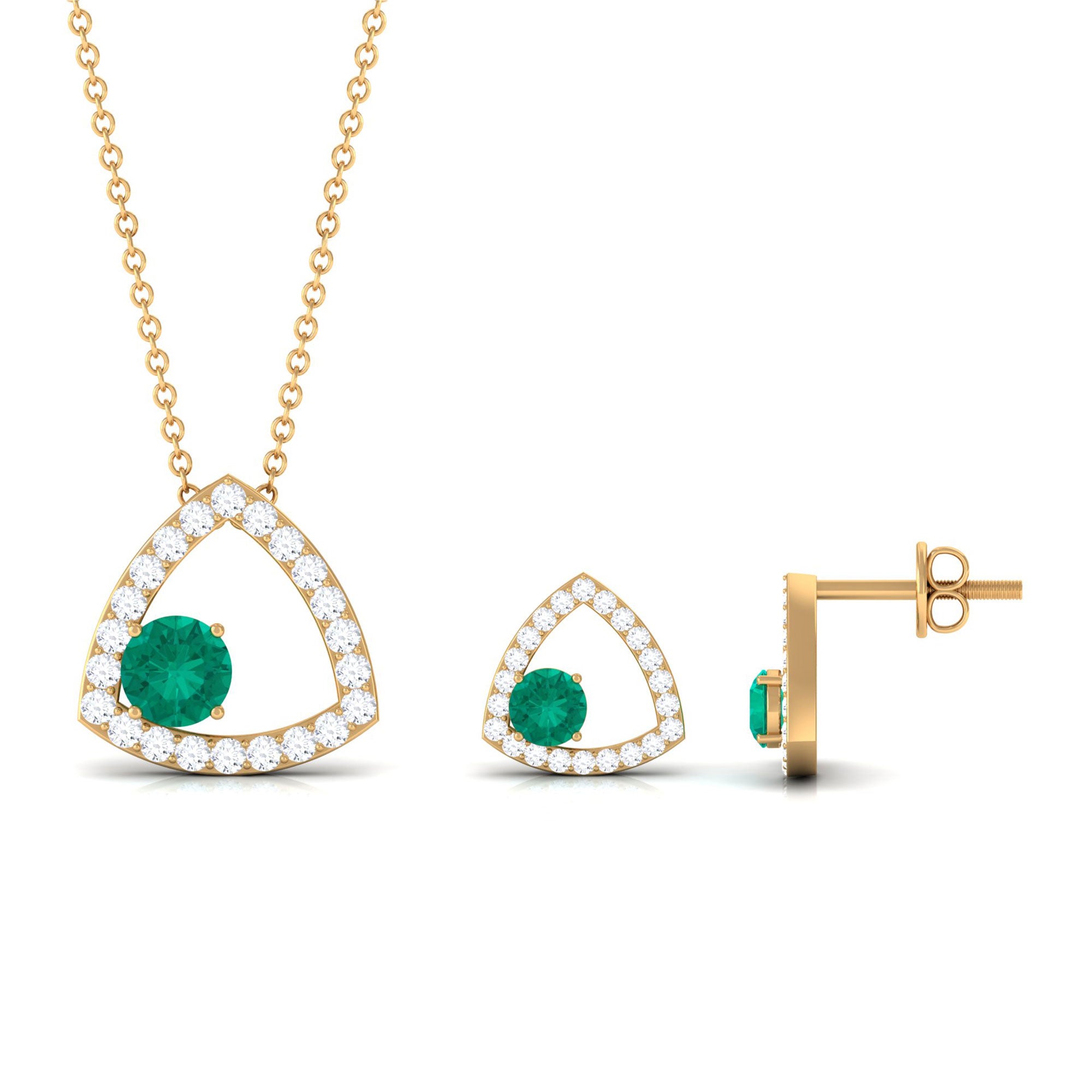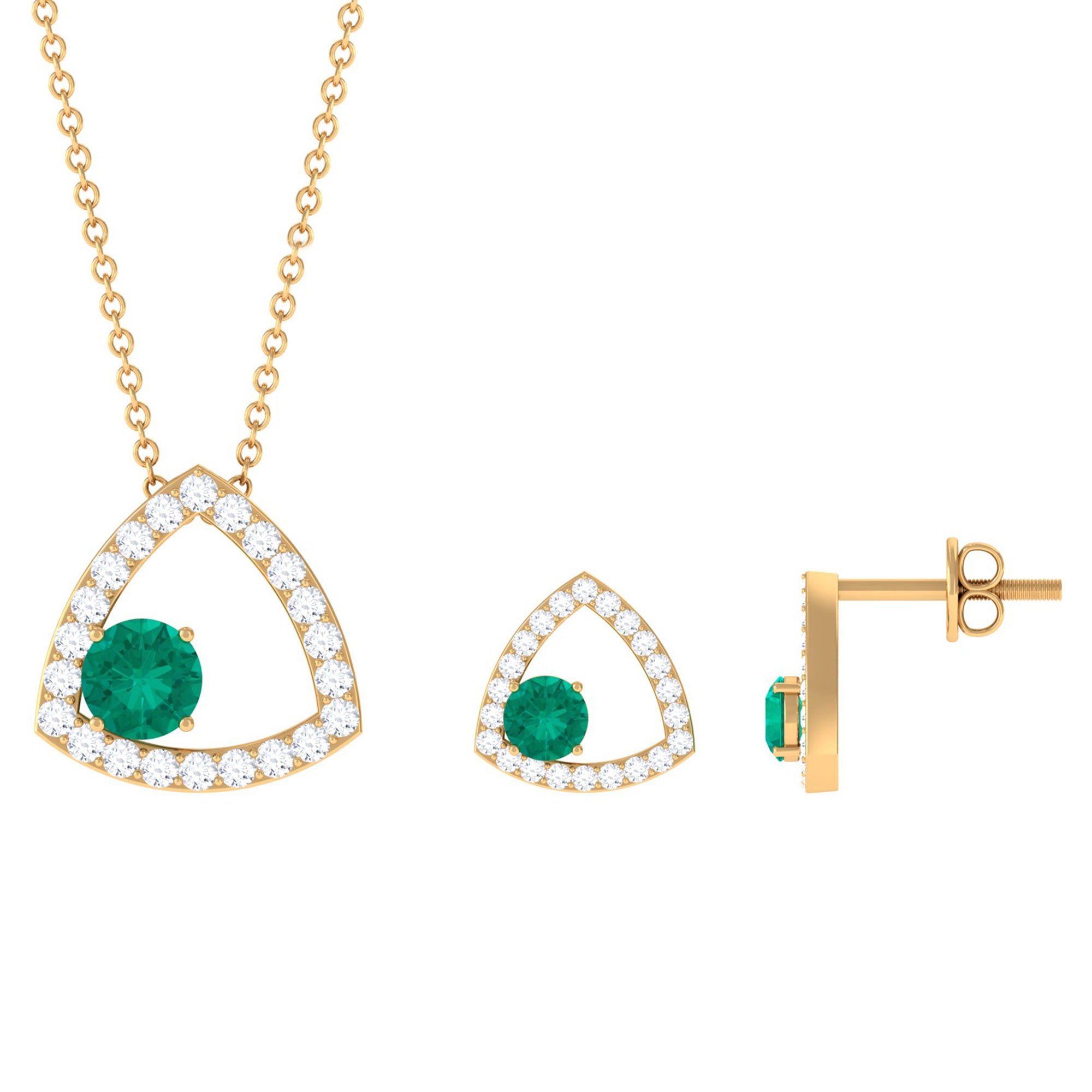 This Necklace and Earrings Set is adorned with Round Cut Emerald at one side of the Triangle Shape which is studded with moissanite stones. Get your lady this Emerald and Moissanite jewelry Set crafted with Solid Gold.
