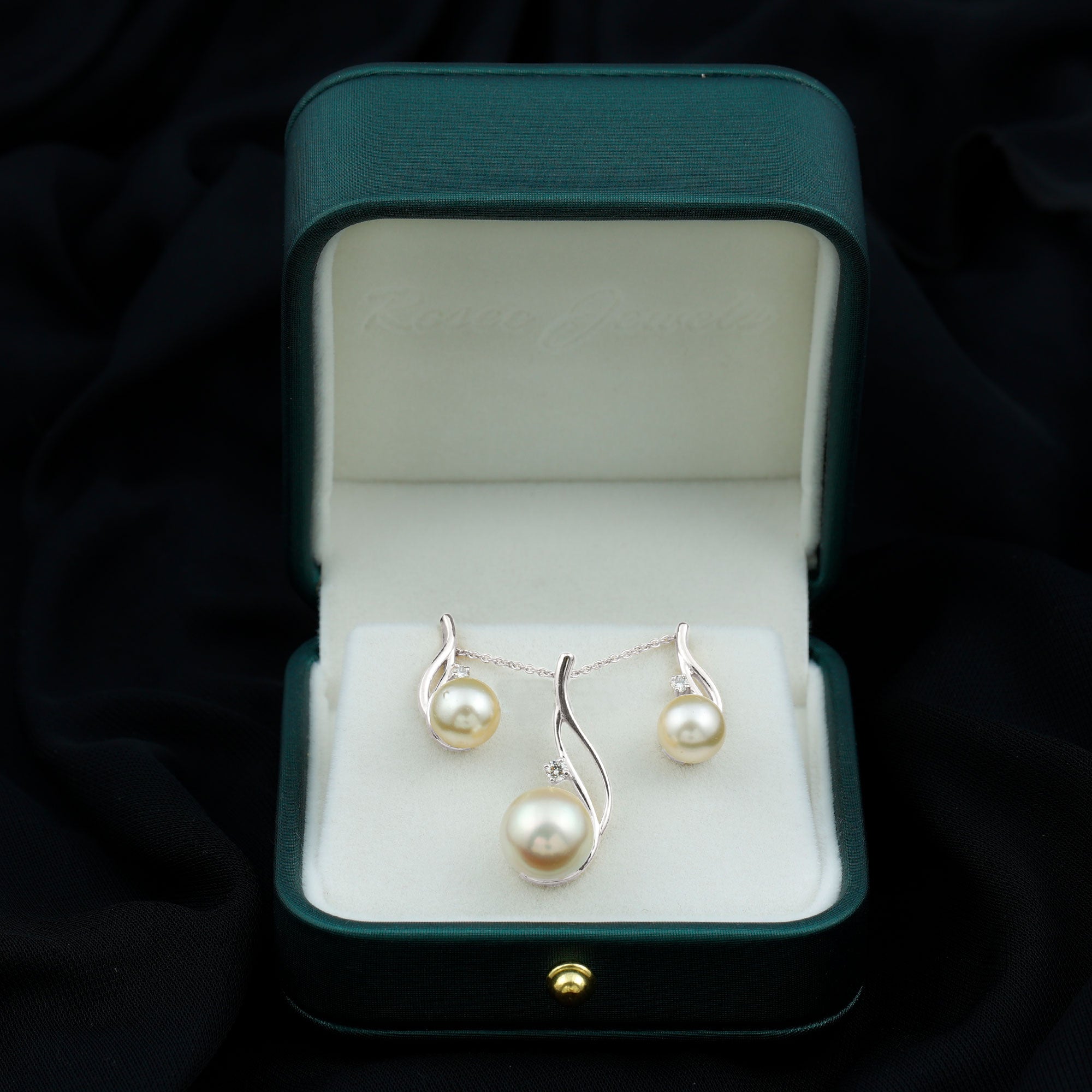 Simple and elegant, our exquisite Pendant and Earrings Set features metal leaf-shaped adorned with a single, lustrous Round South Sea Pearl and a brilliant Diamond stone. The matching earrings complement the necklace perfectly, creating a stunning ensemble. What makes it even more special is the range of metal options available, allowing you to customize this set to your unique style.
