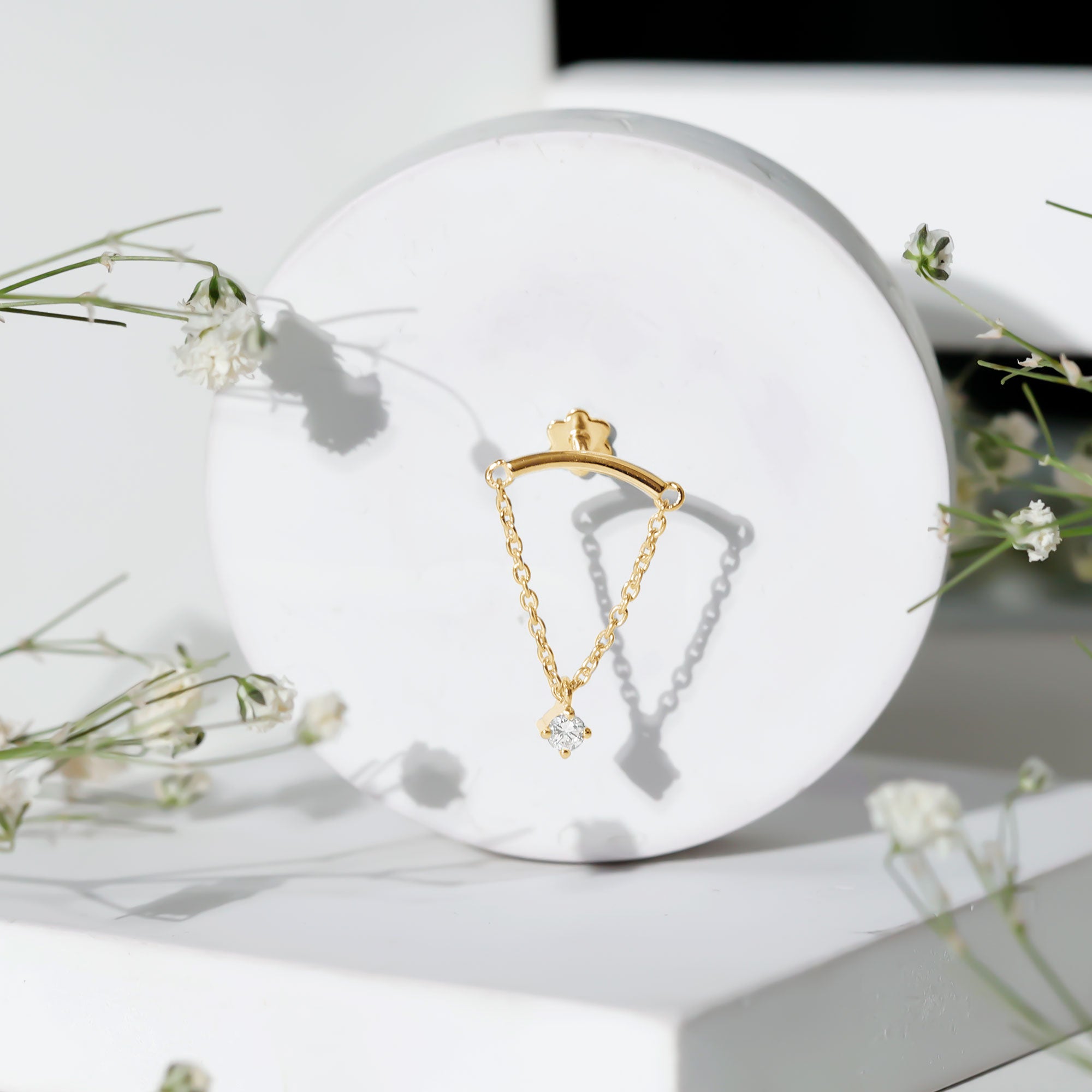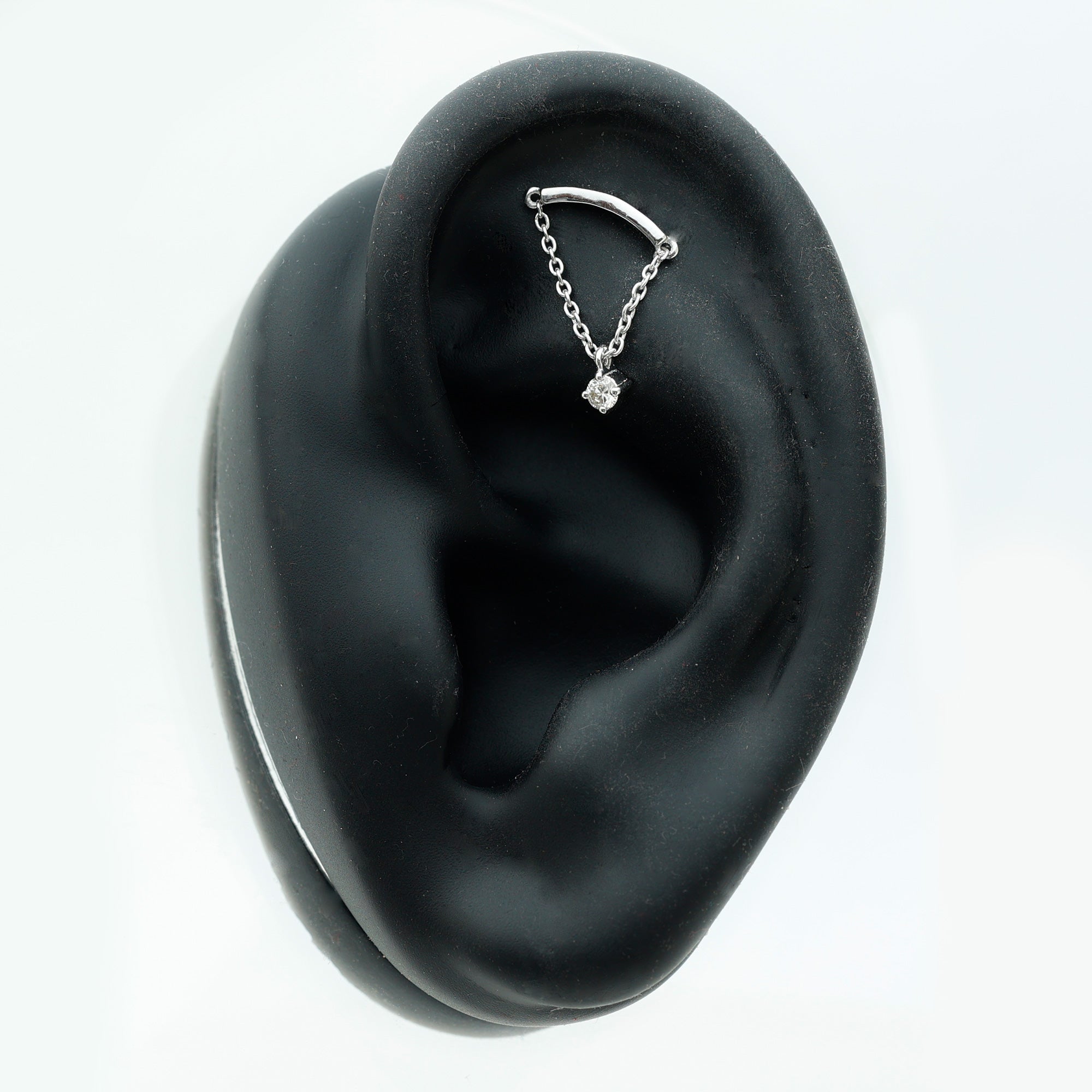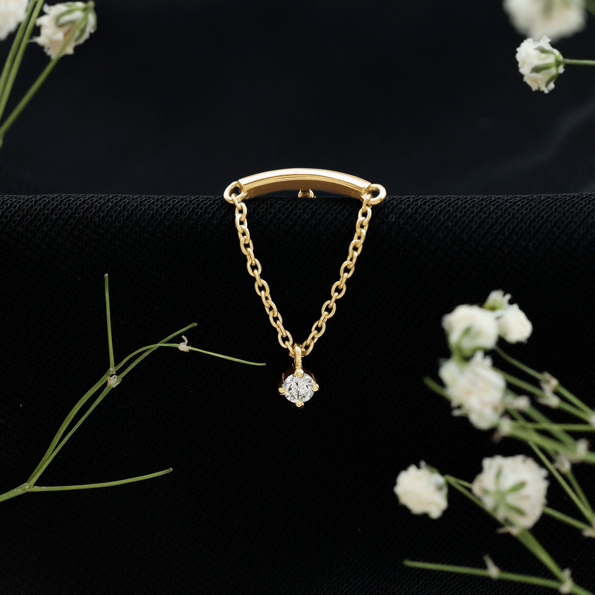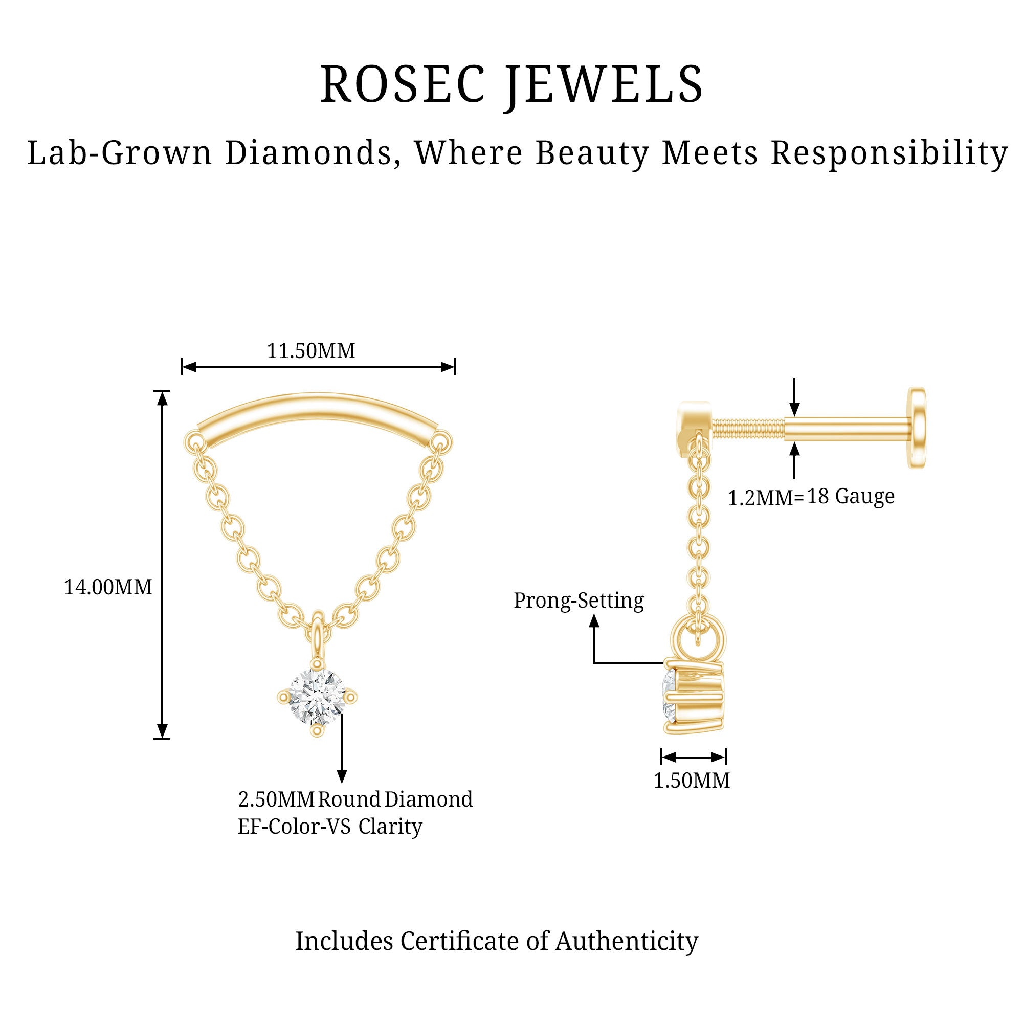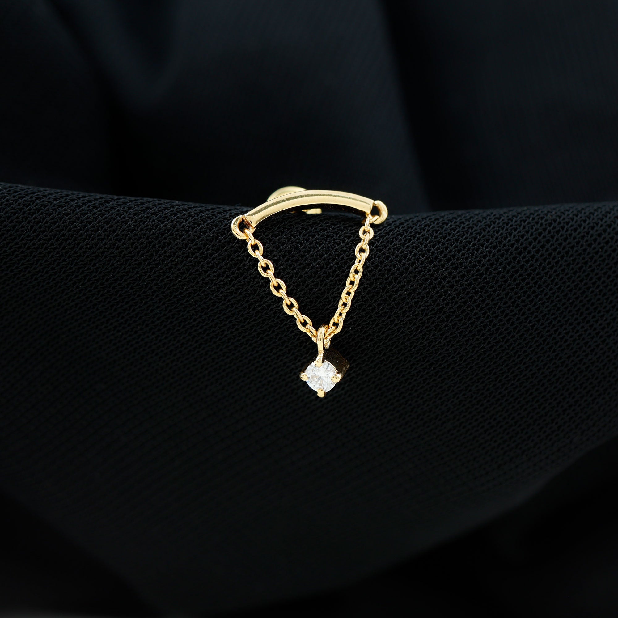 Here is something that will totally make you fall in love with piercing jewelry! Check out this Diamond Helix Earring that will help you shine and stand out. It features a curved bar on top that fits snugly into the fold of your ear, with a metal chain dangling a delicate Round Diamond held in place by prong setting, giving it a lovely dangly vibe. To take your look up a notch, mix this Diamond Chain Earring with your other piercing jewelry to nail your ear stack game. Flaunt your uniqueness and create a minimalist yet chic fashion statement with this Hidden Helix Earring, guaranteed to catch eyes with its dazzling sparkle or be admired for its distinct beauty. The striking simplicity of this classic earring is free from unnecessary frills, making it a sophisticated pick for any jewelry enthusiast who wants to carry themselves with elegance. Gift this Minimalist Dangle Earring to your daughter, sister, wife, or mom, and watch her face light up with joy.