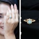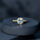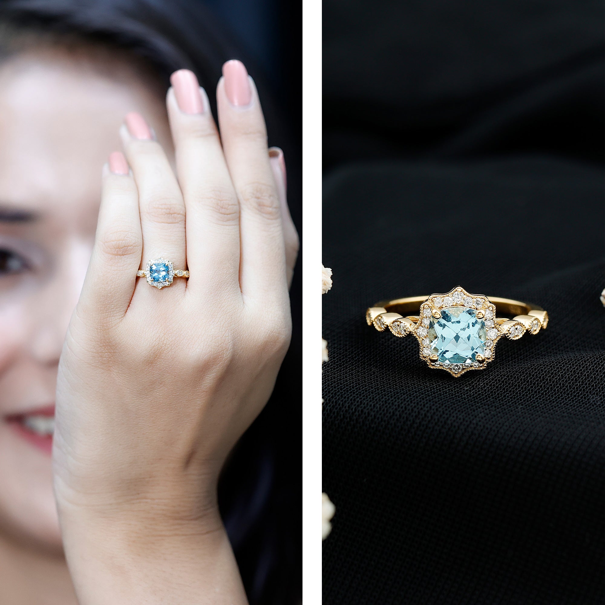 Celebrate love, milestones, or meaningful moments with this Sky Blue Topaz Engagement Ring, crafted to enchant and impress. Designed in 14K yellow gold plated silver, this exquisite piece blends old-world charm with fresh, modern elegance, perfect for engagements, anniversaries, birthdays, or any unforgettable occasion. At the heart of the design lies a 6 MM cushion cut Sky Blue Topaz. Secured in prong setting, the topaz captures and reflects light beautifully, creating a soft yet vibrant glow that draws the eye instantly. Surrounding the center stone is a halo of brilliant round lab grown diamonds, arranged to form a flower like frame. These sustainable, high-clarity diamonds add dazzling contrast to the sky blue centerpiece, bringing a luxurious shimmer without overshadowing the stone’s natural beauty. What truly sets this ring apart is its intricate detailing. A fine line of vintage style beaded detailing outlines the halo and continues along the band, giving the Halo Engagement Ring a delicate, handcrafted look. The shank features scalloped patterns, each accented with sparkling lab grown diamonds, adding depth, movement, and a romantic antique flair. Whether its worn as an engagement ring, a statement piece for special occasions, or a sentimental gift, this Vintage Engagement Ring speaks of style, grace, and thoughtful love. Wrapped in charm and rich with detail, this Blue Topaz and Diamond Ring is not just jewelry, it is a memory, a promise, and a celebration waiting to be worn.