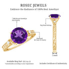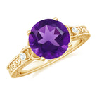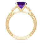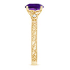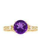 Classic with a touch of old-world glamour, this Amethyst Solitaire Celtic Ring is a true work of art. The Royal Single Stone of 7 MM Round Shape Amethyst secured by Peg Head Setting sits pretty at the center, complemented by Round Shape Diamond on either side to subtly bring out its shine. The ornate engraving of Celtic Knots all over the band lends it a vintage allure, which is just what it needed to go from classic to grand. Whats more, each gemstone in this Certified Amethyst Solitaire Ring has been rewarded with a premium quality grade.