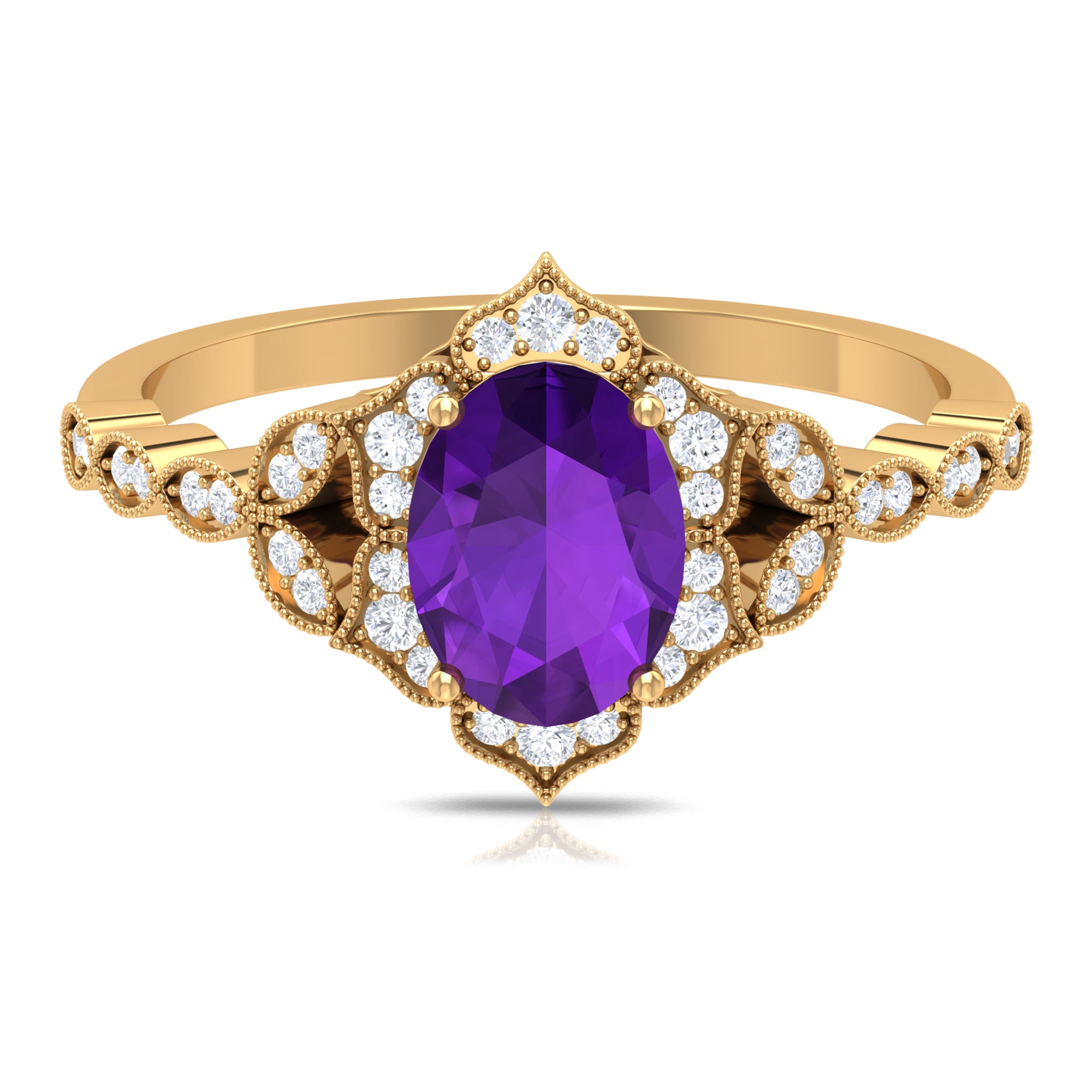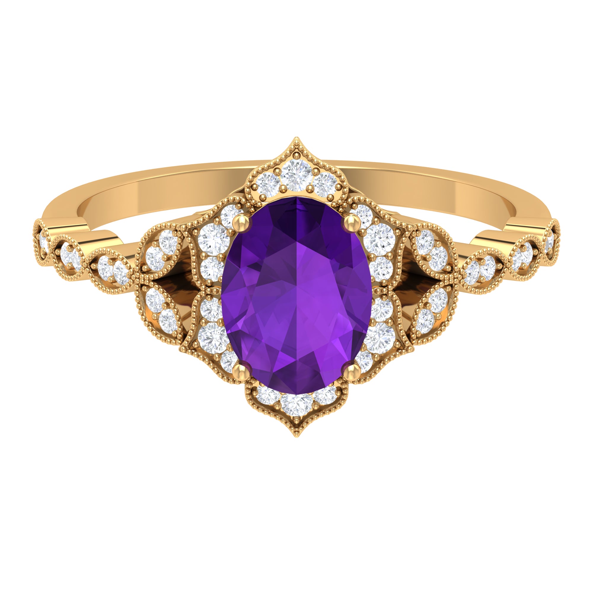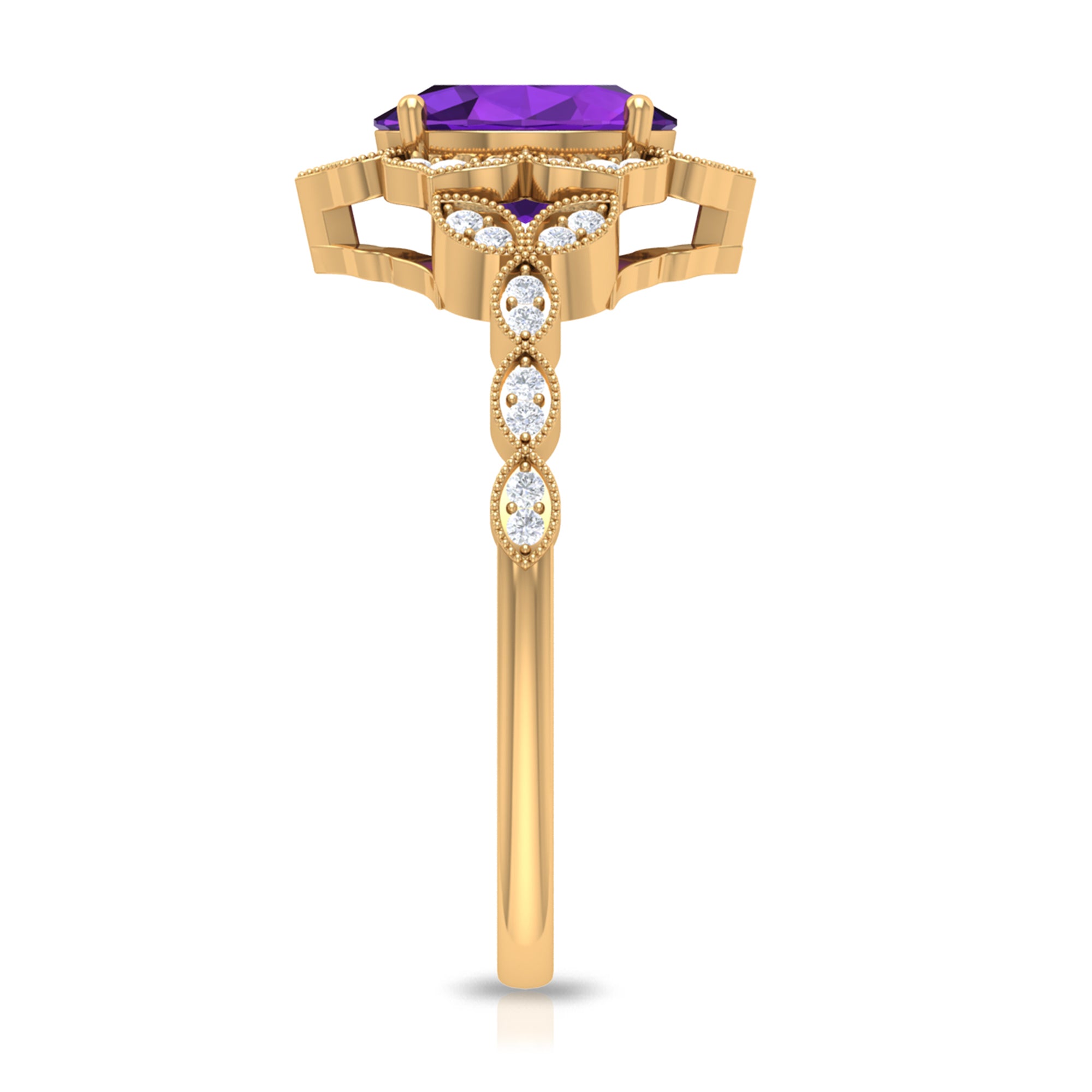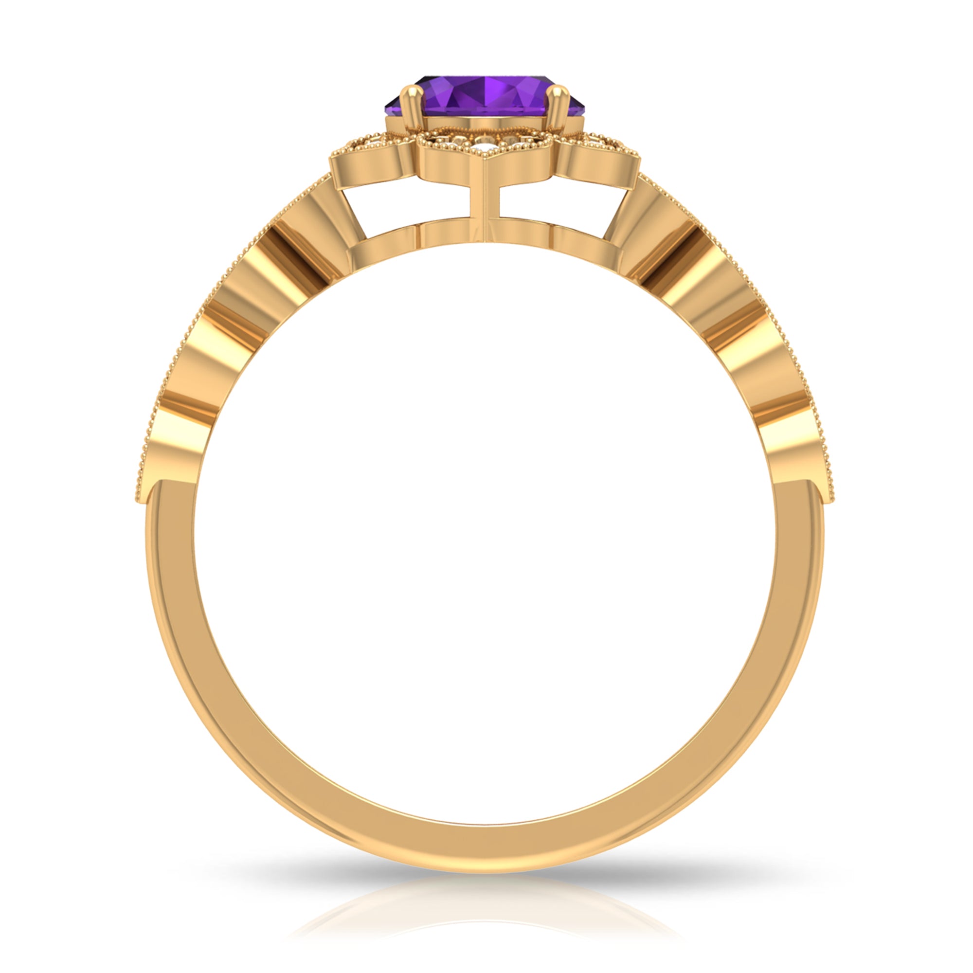 Iconic Amethyst Engagement Ring is embellished with Round Diamond. Enchanting piece of fine jewelry, this Amethyst Solitaire Engagement Ring is mesmerizing and it will definitely elate your lady with its fine charm. An excellent choice of Vintage Ring if want to opt for Gemstone Engagement Ring.