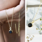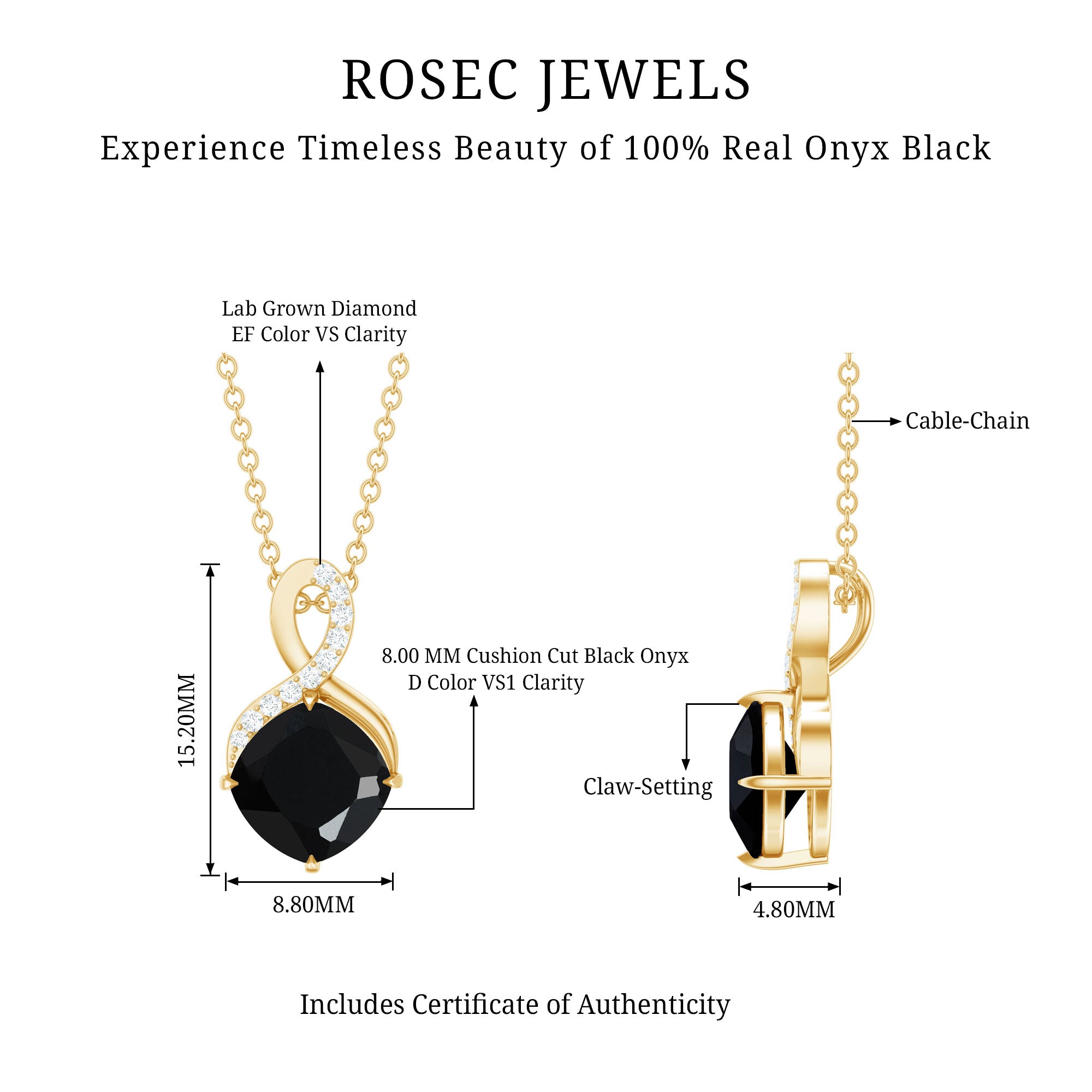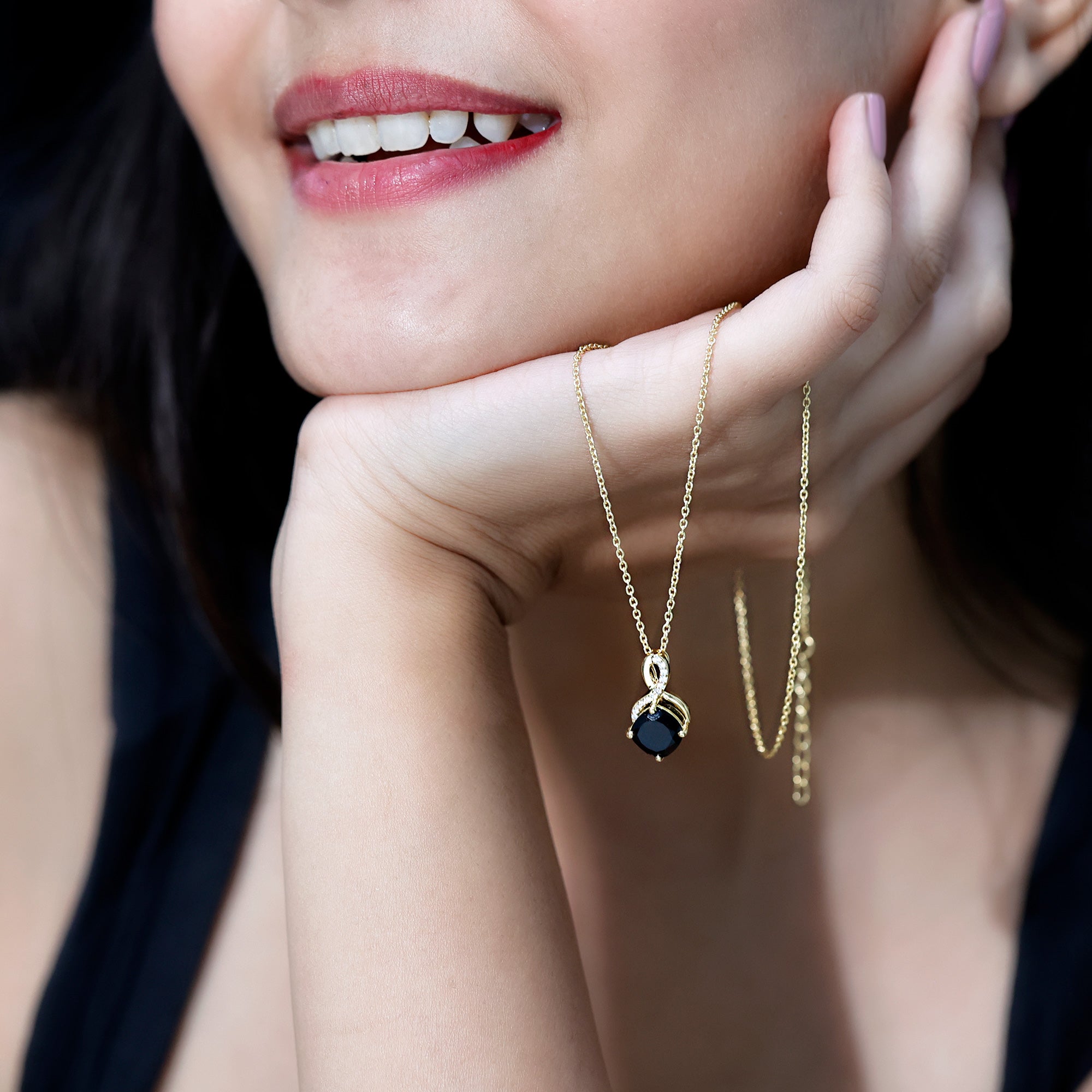Celebrate strength, love, and timeless elegance with this beautifully crafted Black Onyx Necklace. Handmade in yellow gold plated silver, this meaningful Solitaire Pendant features a bold 8 MM cushion cut Black Onyx, securely set in prongs. Above the center stone sits a graceful infinity symbol, delicately accented with round lab grown diamonds, adding a hint of sparkle and symbolism. Together, they form a pendant that is both modern and meaningful, a gentle reminder of forever love and unbreakable bonds. The combination of AAA quality Black Onyx and EF color VS clarity lab grown diamond gives this Infinity Pendant Necklace an elegant contrast, dark and mysterious with a soft sparkle that catches the light just right. The Cushion Cut Pendant dangles from a sleek chain, resting beautifully along the neckline, whether worn alone or layered with other favorites. Perfect for everyday wear or special occasions, this Black and White Necklace makes a heartfelt gift for birthdays, anniversaries, or simply to show your love.