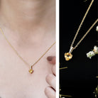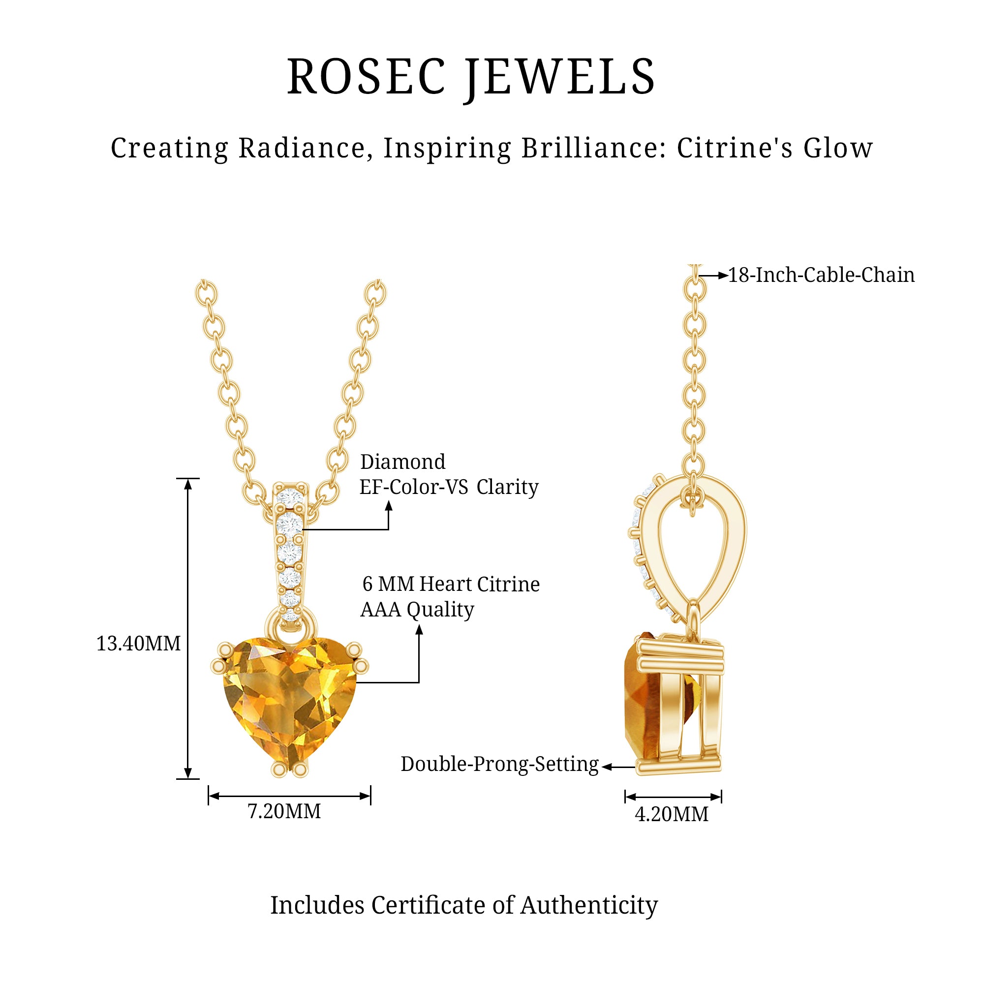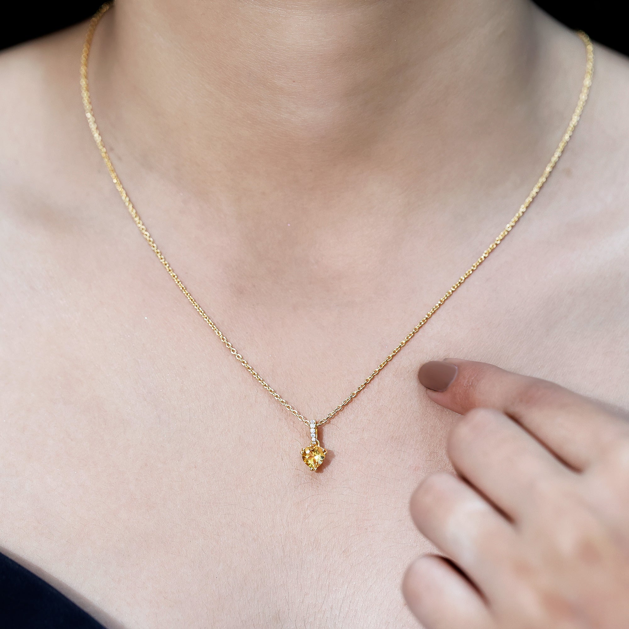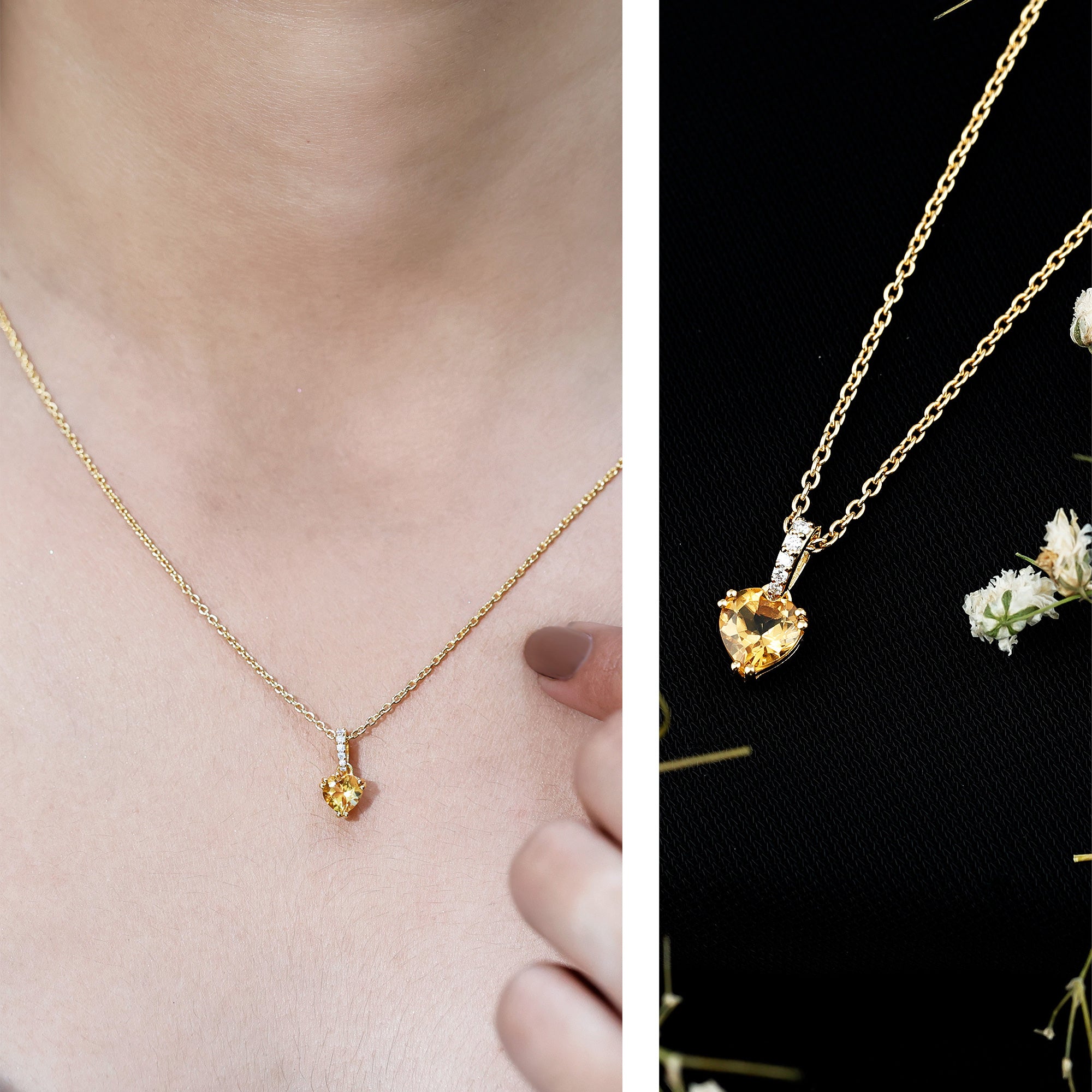 This radiant Solitaire Pendant Necklace features a stunning 6MM Citrine, the vibrant November birthstone, nestled in secure double prong setting that allows its sunny hue to shine from every angle. Crafted in luxurious 14k yellow gold plated sterling silver, the Heart Pendant glows with a rich warmth that beautifully complements the golden tones of the gemstone. A touch of sparkle comes from round cut lab grown diamonds, delicately set along the bail, adding elegance and brilliance without taking attention away from the heart of the design. The sleek, gold plated chain is designed for effortless wear, allowing the Citrine Pendant to sit gracefully at the neckline, perfect for everyday elegance or meaningful gifting. Whether you are celebrating a birthday, a milestone, or simply want to share a symbol of love and positivity, this Citrine and Diamond Necklace is designed to leave a lasting impression. Presented in a signature jewelry box, this Citrine Heart Necklace makes a thoughtful and meaningful gift for someone special, or a cherished piece for yourself. It is a celebration of warmth, joy, and golden moments.