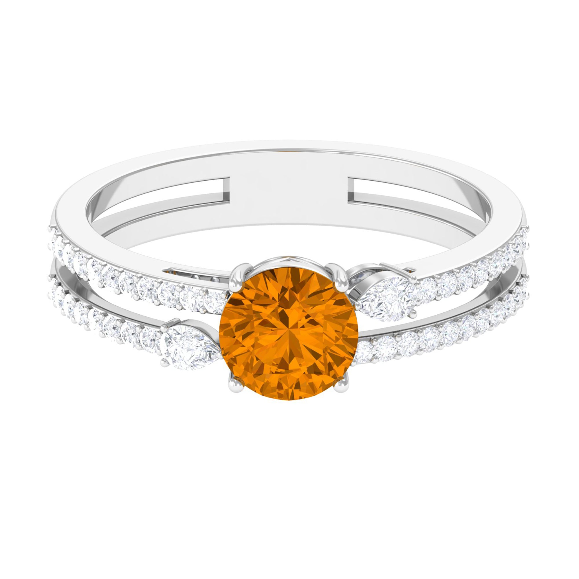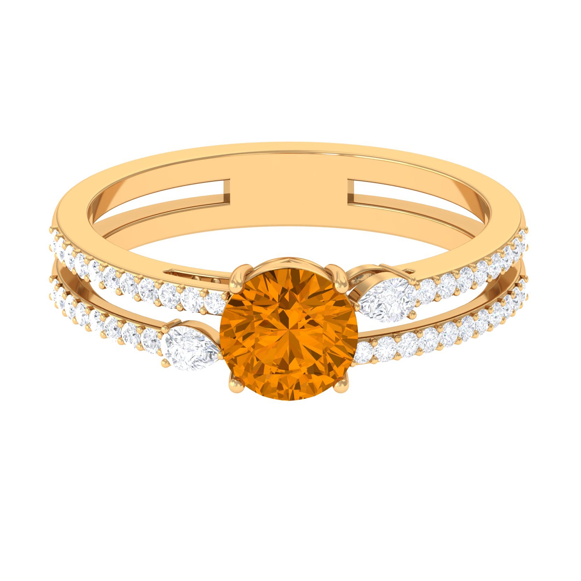 Make her feel special with this breathtaking Citrine Engagement Ring. The Solitaire ring features a dazzling round Citrine solitaire on a double band shank delicately decorated with sparkling pear and round Diamond stones. This stunning double-band ring is the perfect symbol of your love and commitment, sure to take your partners breath away. Celebrate your future together with this beautiful and meaningful piece of jewelry.