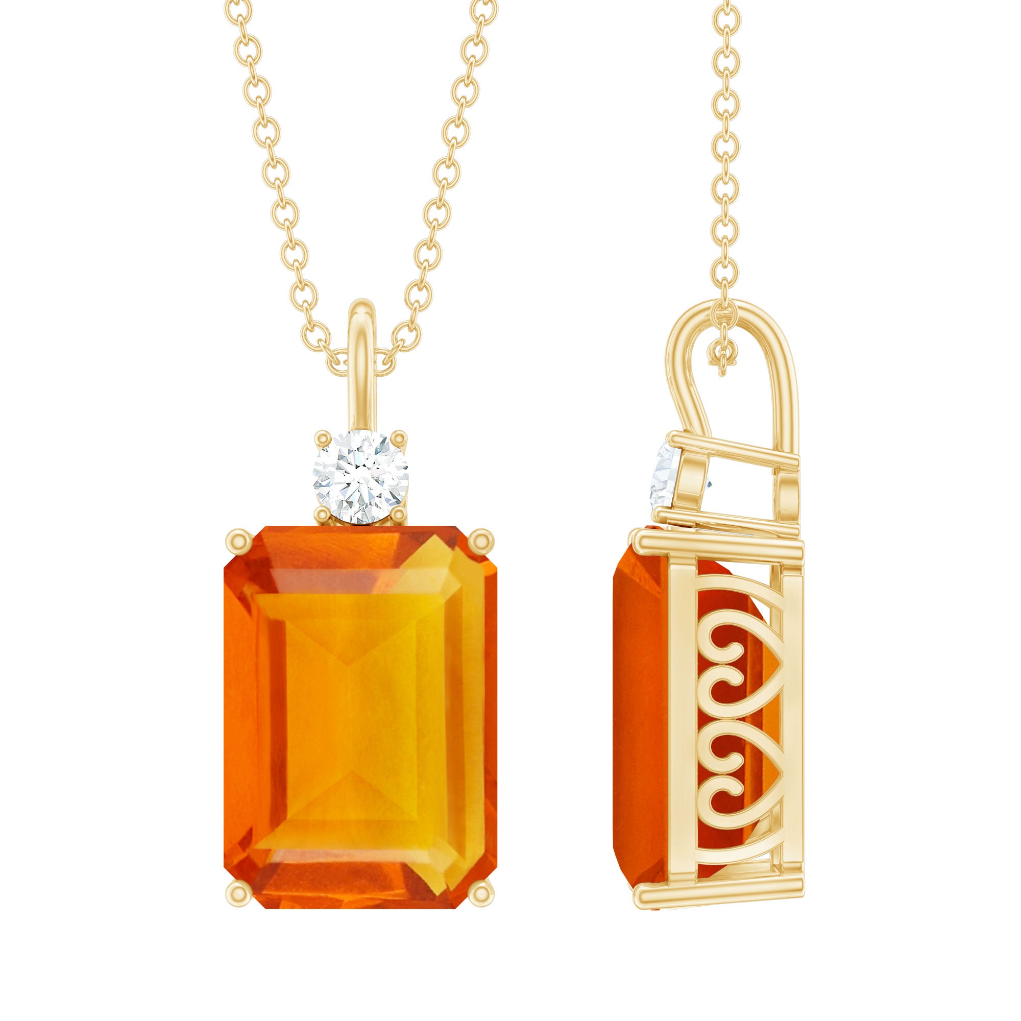 Elevate your elegance with the Solitaire Pendant, featuring a striking Emerald Cut Created Orange Sapphire Gemstone in a Prong Setting. Brilliant Round Cut Moissanite accents highlight meticulous craftsmanship and captivating color combination, exuding sophistication, and timeless allure. Complement any ensemble with grace using this perfect accessory.