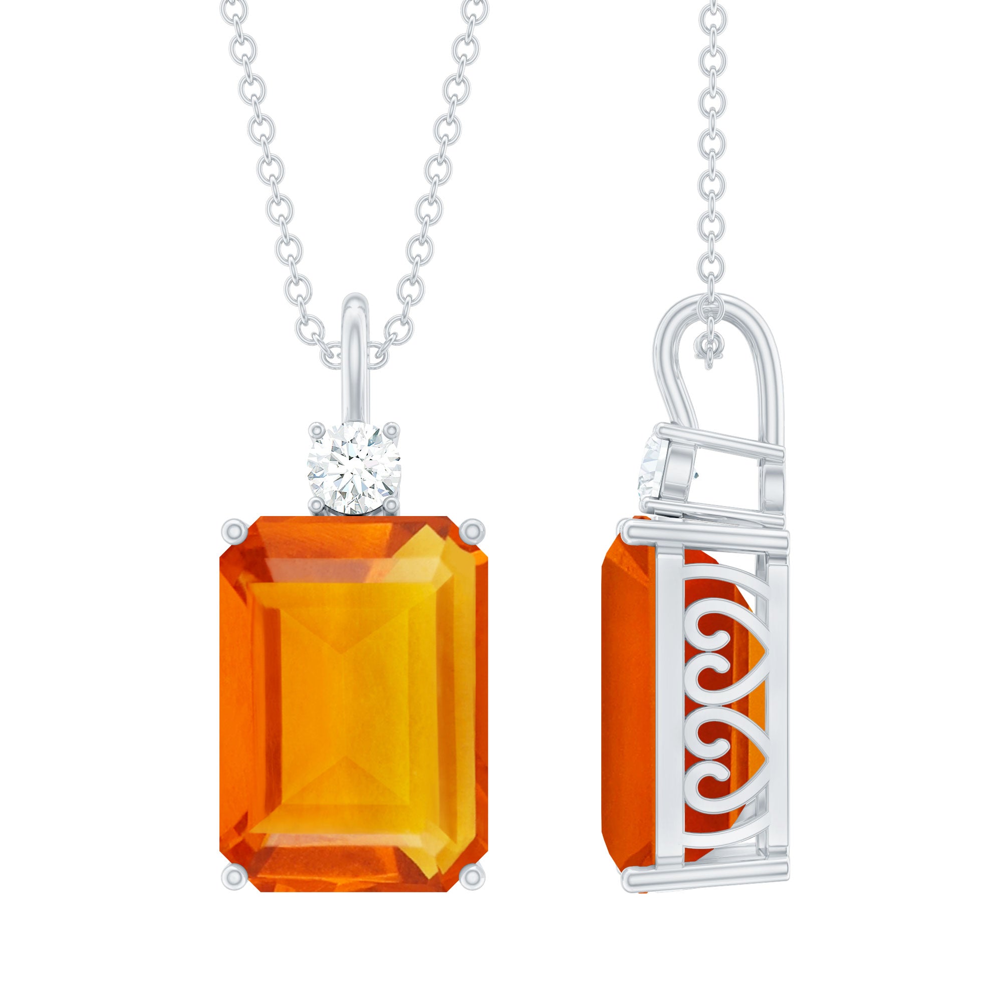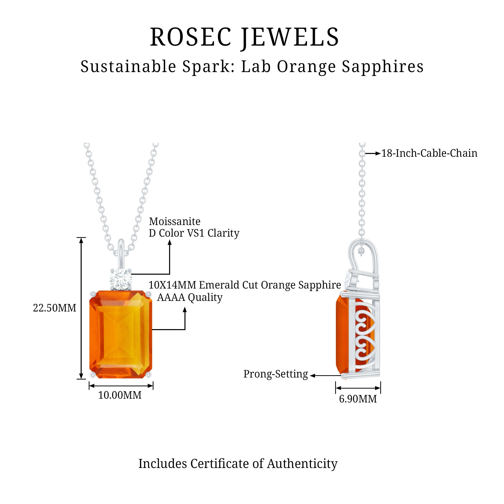Elevate your elegance with the Solitaire Pendant, featuring a striking Emerald Cut Created Orange Sapphire Gemstone in a Prong Setting. Brilliant Round Cut Moissanite accents highlight meticulous craftsmanship and captivating color combination, exuding sophistication, and timeless allure. Complement any ensemble with grace using this perfect accessory.