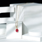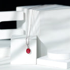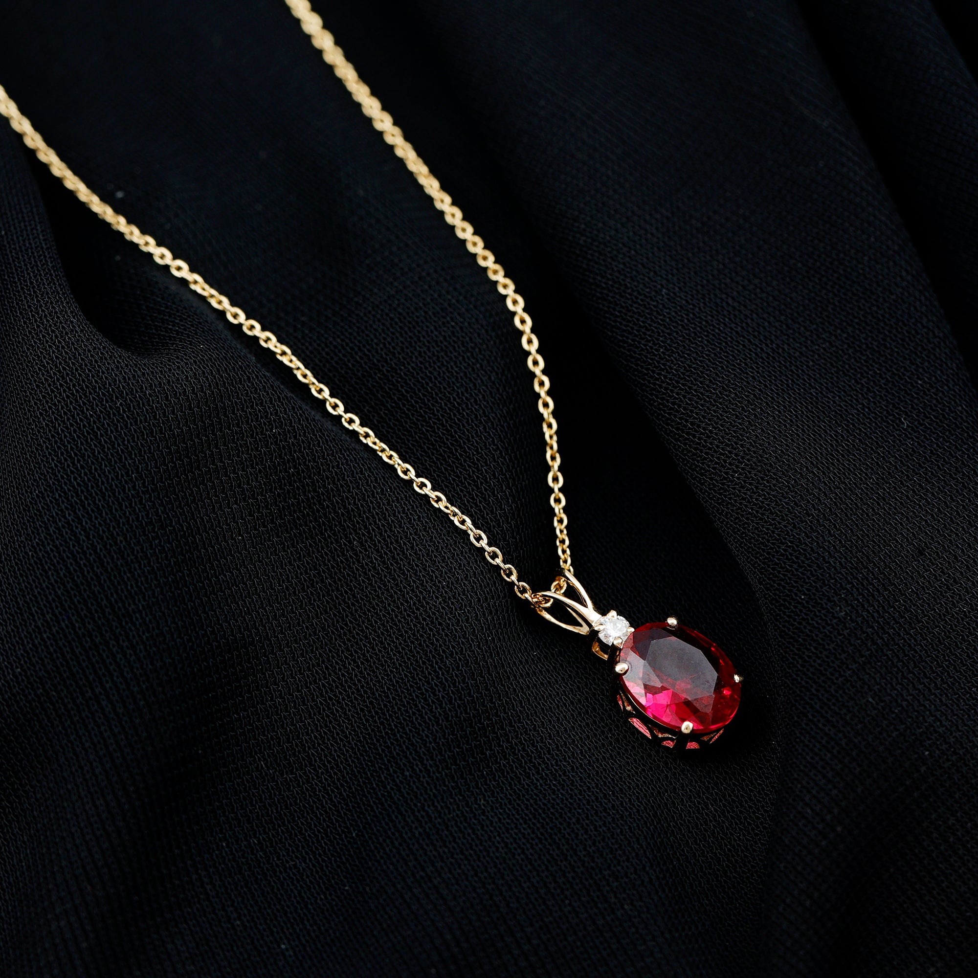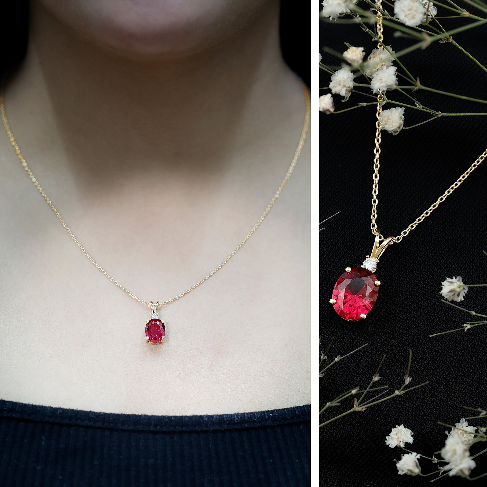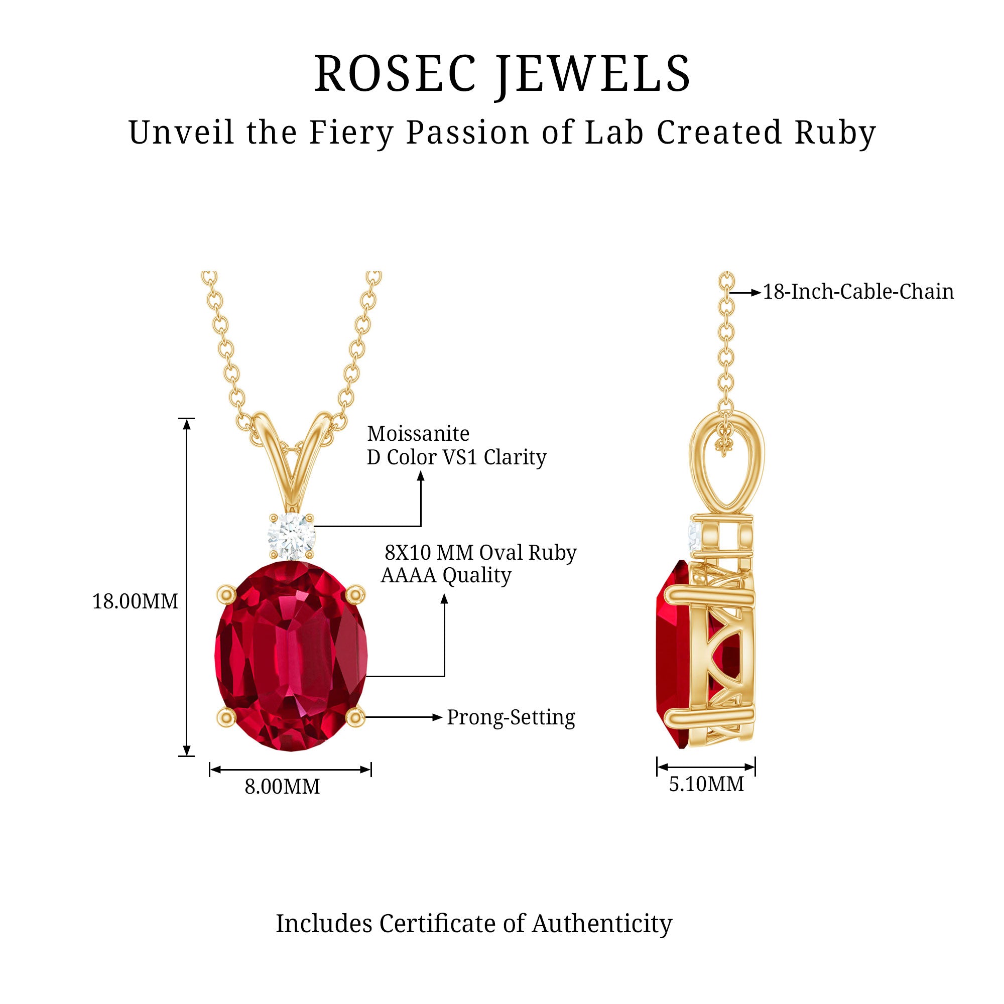 Enhance your neckline with the allure of this sophisticated Solitaire Pendant. Featuring a dazzling Oval Cut Created Ruby delicately set in a prong setting, this necklace is a true statement piece. The sparkling Moissanite accents add a touch of brilliance and charm. With its elegant design and captivating gemstone, this pendant necklace is the perfect accessory to elevate your style.