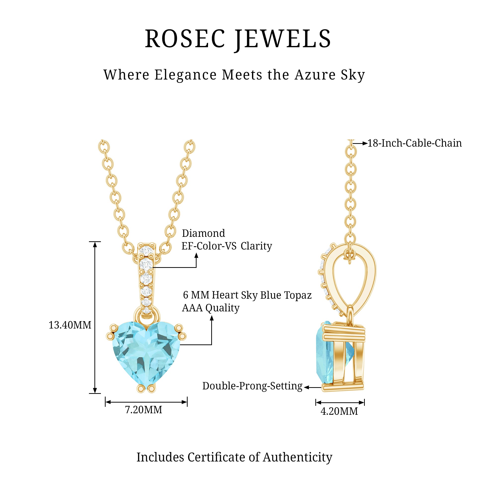 Transform every heartbeat into a stunning moment with this Sky Blue Topaz Necklace, a shimmering gem that says more than words ever could. At the center of this delicate pendant lies a beautifully faceted 6 MM heart shaped Sky Blue Topaz, set securely in double prong setting that enhances its brilliance and allows light to dance across the stone. The Heart Shaped Necklace is gracefully suspended from a cable chain by a decorative bail adorned with sparkling lab grown diamonds. Crafted in sterling silver and finished in high-polish yellow gold plating, this piece blends clean, minimal design with timeless sentiment. The heart motif, universally known as a symbol of love, makes this Blue Topaz and Diamond Necklace a thoughtful gift for anniversaries, birthdays, or simply as a reminder of someone special. Whether worn solo or layered, this Sky Blue Topaz Heart Necklace brings a soft pop of color and a romantic accent to any outfit. It arrives beautifully packaged in a signature jewelry box, making it ready to gift or keep close to your own heart.