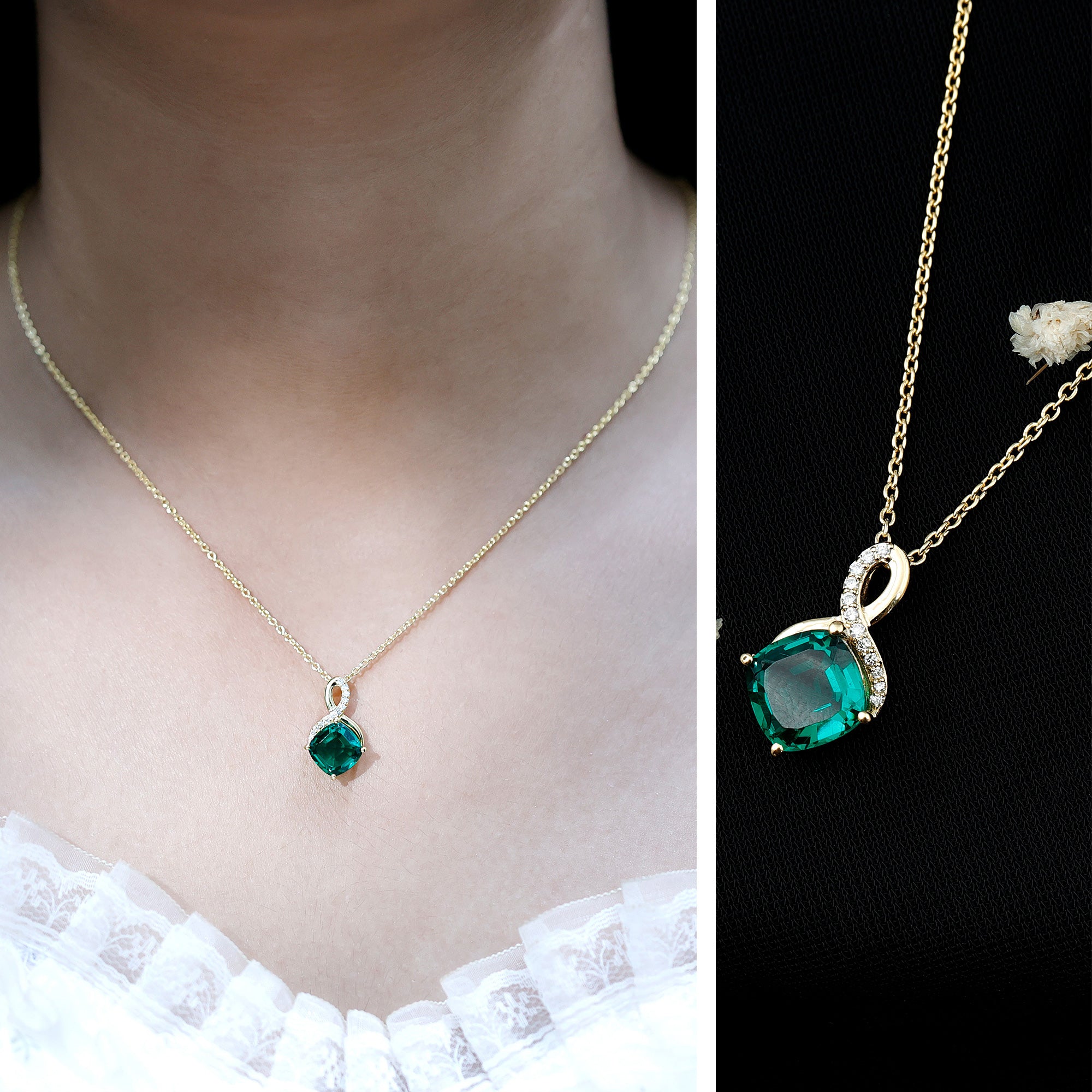 Carefully handcrafted in yellow gold plated silver, this striking piece features a rich 8 MM cushion cut lab grown emerald held in secure prong setting. Above the center stone, a delicate infinity symbol sparkles with lab grown diamonds, representing forever love and unbreakable bonds. The elegant design flows effortlessly from a cable chain, making this Emerald and Diamond Pendant perfect for layering or wearing on its own for everyday sophistication. Whether you are dressing for a special occasion or adding something meaningful to your daily look, this Infinity Pendant Necklace blends timeless symbolism with contemporary style in the most graceful way. The AAAA quality lab grown emerald and EF-VS quality lab grown diamonds offer exceptional sparkle and clarity, while being ethically made and environmentally friendly, making it a conscious and beautiful choice. This Emerald Pendant Necklace is not only a symbol of love but also a reminder of personal growth, inner peace, and strength, making it an ideal gift for birthdays, anniversaries, or simply a thoughtful self-purchase.