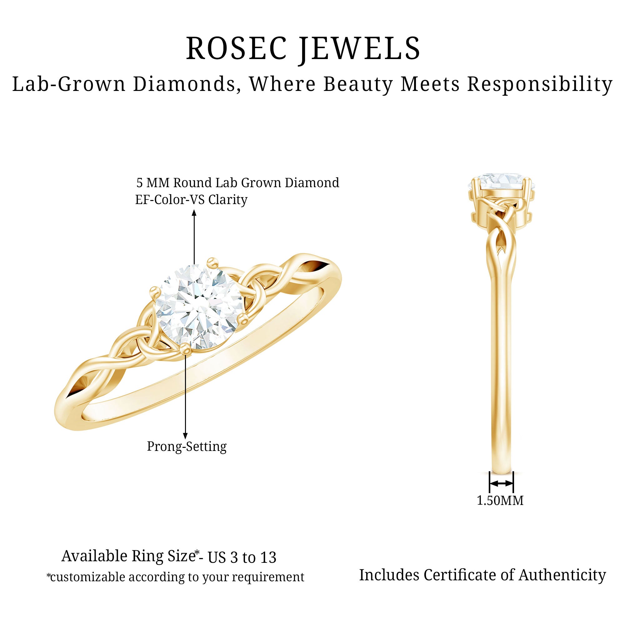 If you are searching for a Promise Ring for Her to present on Valentines Day, you have found the perfect choice! Rosec Jewels features this gorgeous Solitaire Promise Ring, made with a lab created diamond. We designed this Single Stone Ring with a 5 MM Round Cut Lab Grown Diamond, set in Prong Setting on a Celtic Shank. This Diamond Promise Ring, adorned with a trinity knot, represents your commitment in the most dazzling manner. Additionally, if you appreciate simple yet timeless styles, this Love Knot Ring can also be worn on your wedding day. It arrives in a premium jewelry box, ensuring safe delivery and creating unforgettable moments when you propose. This Celtic Knot Ring not only shines with its brilliance but also represents a meaningful style that blends classic elegance with modern sophistication. It strikes the perfect balance between timeless beauty and contemporary charm, making this Lab Grown Diamond Ring for Women a lovely tribute to modern romance. Its distinctive allure makes it perfect for any occasion, whether it is an Engagement, Valentines, or Anniversary.