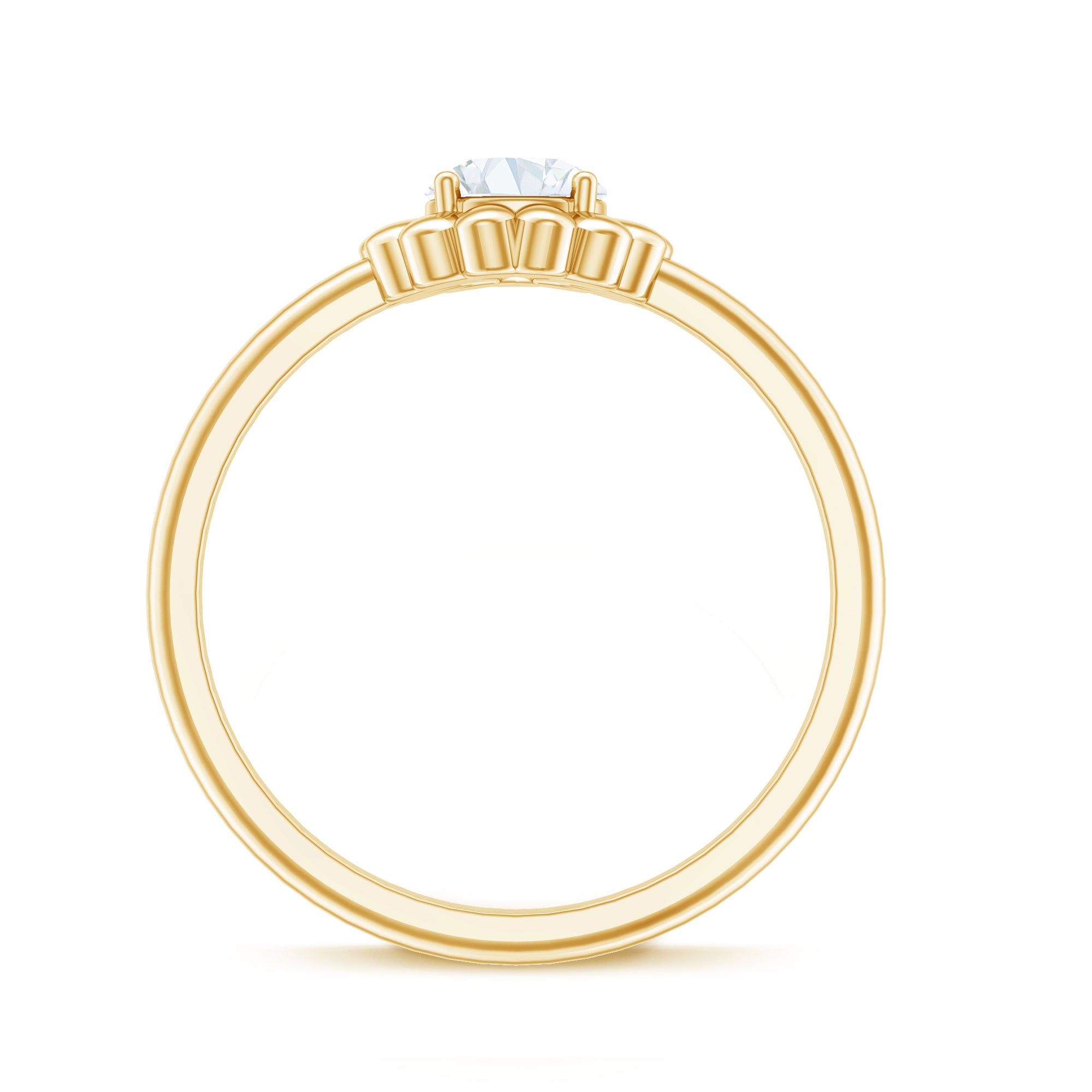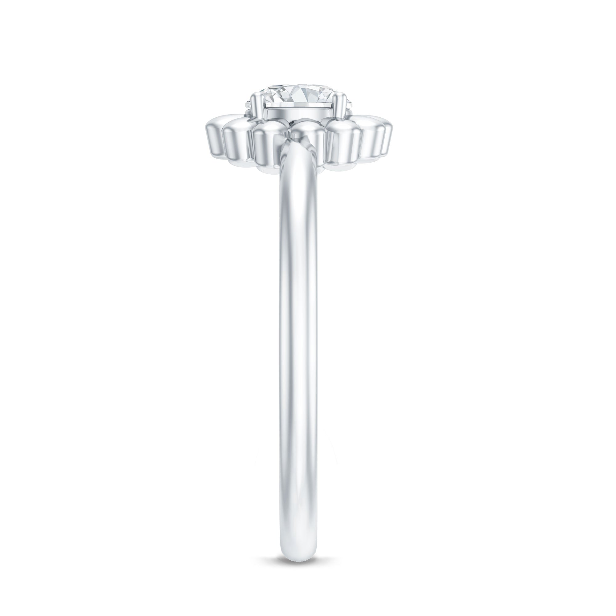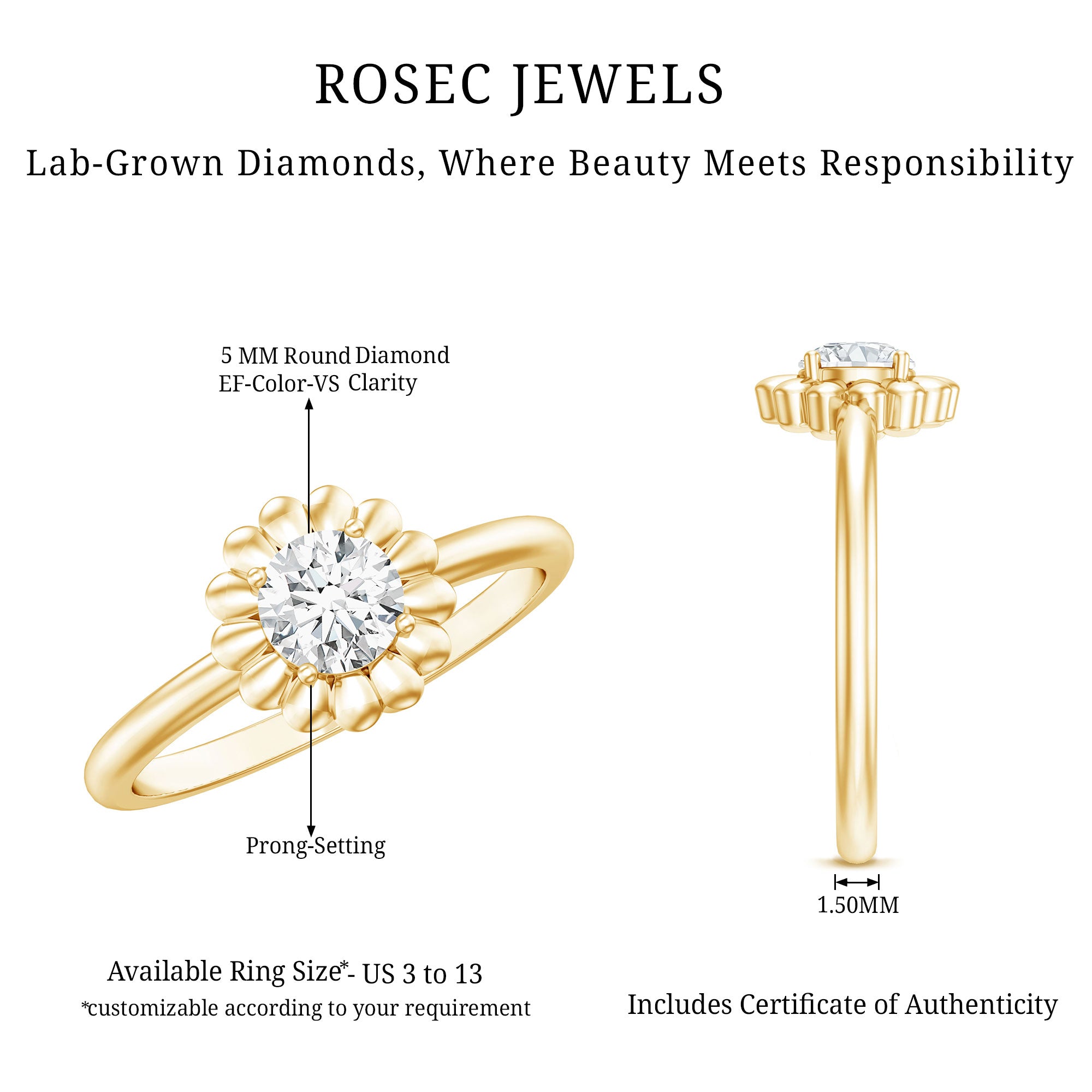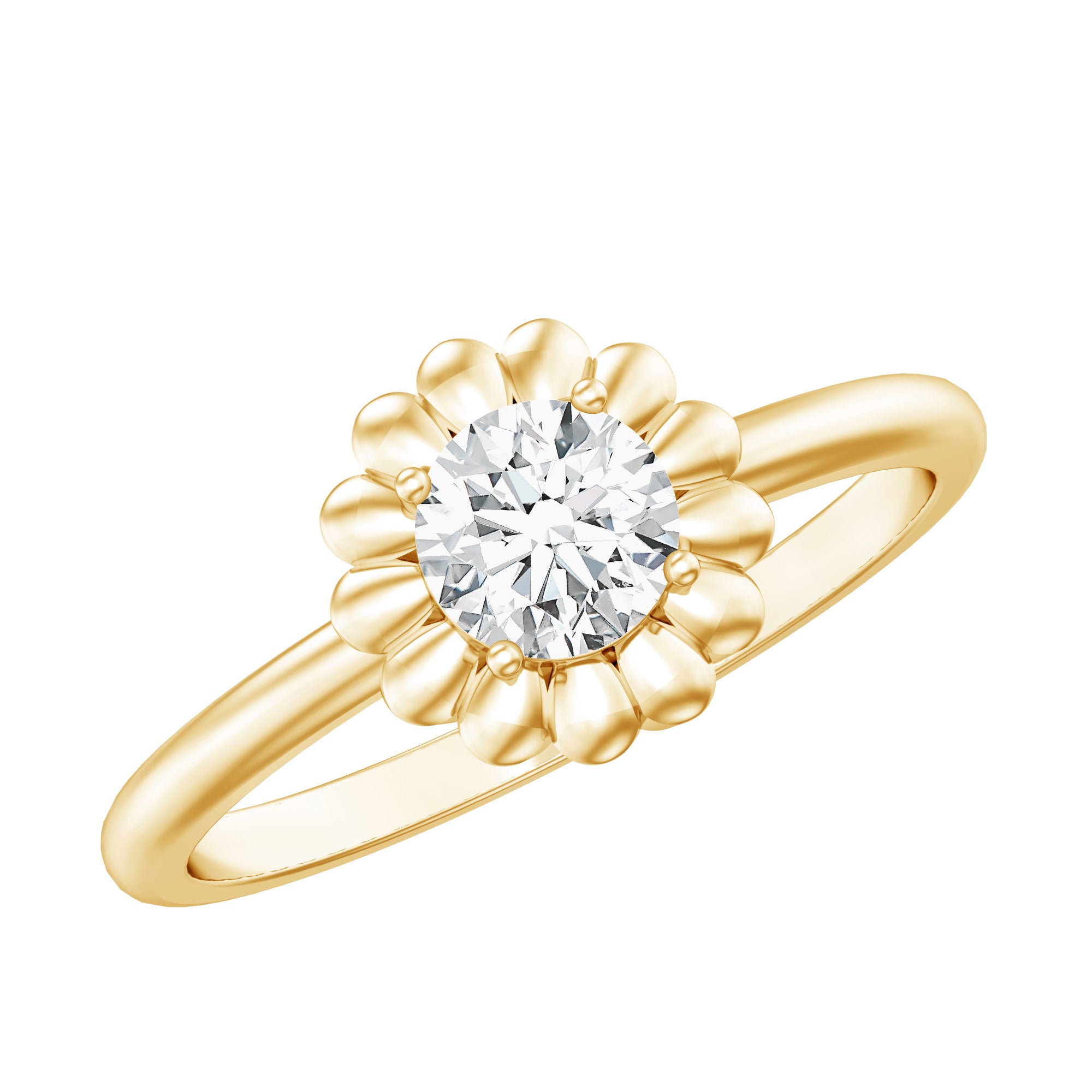 Bloom in elegance sporting a Lab Grown Diamond Flower Ring all day, everyday! Sparkling gracefully while stealing all the limelight is the center stone of 5 MM Round Shape Lab Grown Diamond encased in Prong Setting. The floral petals of Gold blossom gracefully all around it. Slip this Floral Lab Grown Diamond Ring on and play along with the Cottage Core trend in style.