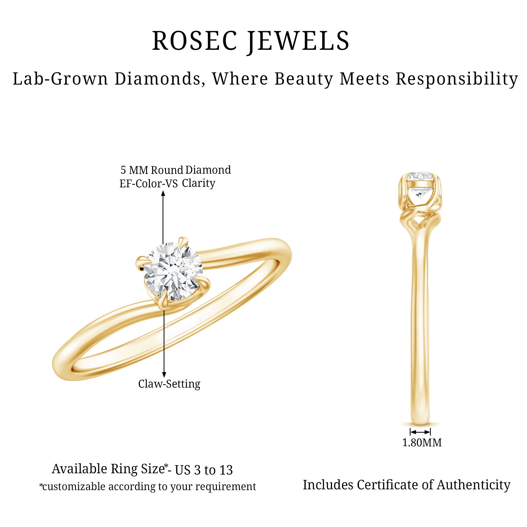 Lab grown diamonds offer the same physical and optical properties as mined diamonds, allowing them to deliver comparable brilliance and clarity in fine jewelry. Their use in a solitaire ring ensures that the stone remains the central visual element without distraction.
