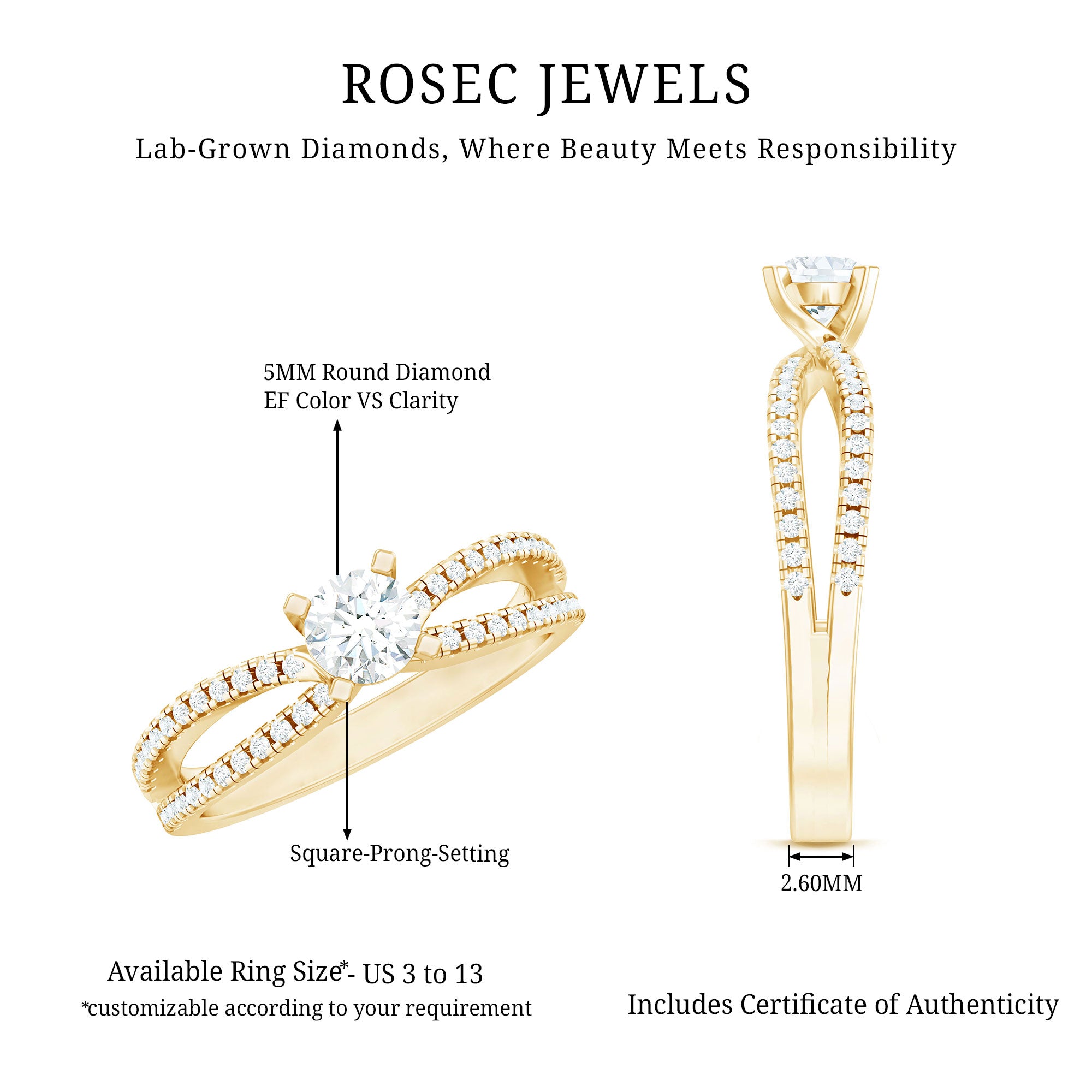 Tell her she is a standout, just like our Lab Grown Diamond Split Shank Engagement Ring. The Single Stone of 5 MM Round Shape Lab Grown Diamond secured in Square Prong Setting gracefully steals all the attention here. Out of the ordinary, this Lab Grown Diamond Engagement Ring features a Split Shank for an unconventional touch.