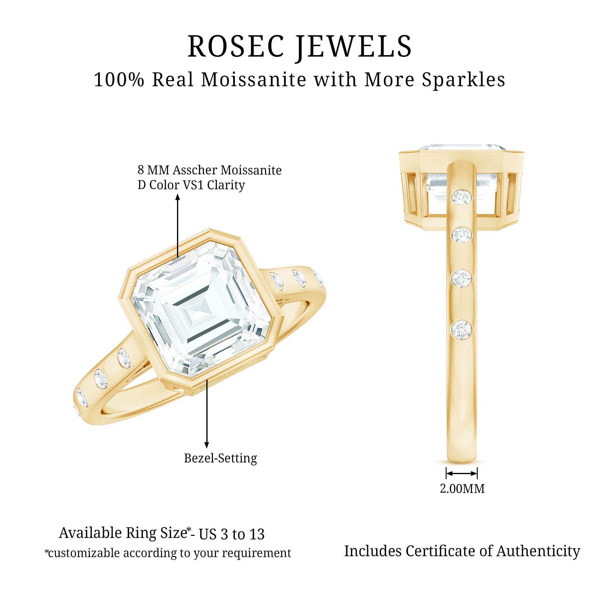 Show your special lady just how much she means to you with our gorgeous Moissanite Engagement Ring on her big day. Its elegant yet simple design beautifully showcases the center gemstone. This classic Asscher Engagement Ring features D-VS1 quality moissanites, ensuring the fire and brilliance that represent love and commitment. At the heart of it is an 8 MM asscher cut Moissanite securely set in bezel setting. The stunning round cut side stones arranged in a spaced style create a bold and eye-catching look, reflecting your unique style and personality. This Solitaire Engagement Ring has a timeless, brilliant geometric shape with sharp edges that draws all the attention. It perfectly blends classic beauty with a modern twist, providing an elegant appearance that radiates stunning brilliance. This Moissanite Solitaire Ring comes in various sizes, guaranteeing a perfect fit that feels tailor-made just for you. Every detail of this 3 Carat Moissanite Ring for Women reflects precision, passion, and a hint of magic that only true craftsmanship can achieve. Let your fingers tell your story and let your love shine with a brilliance as unique as your connection.