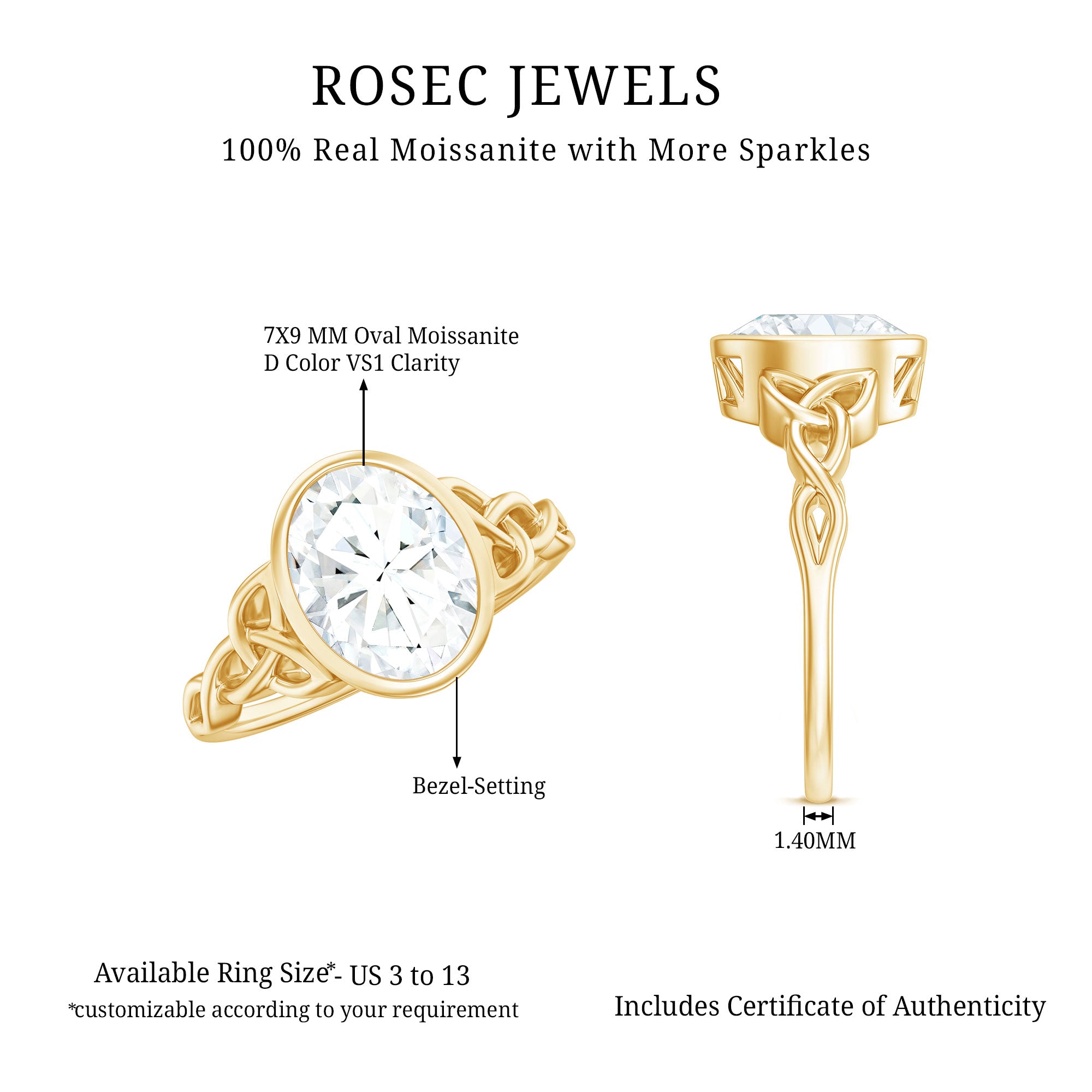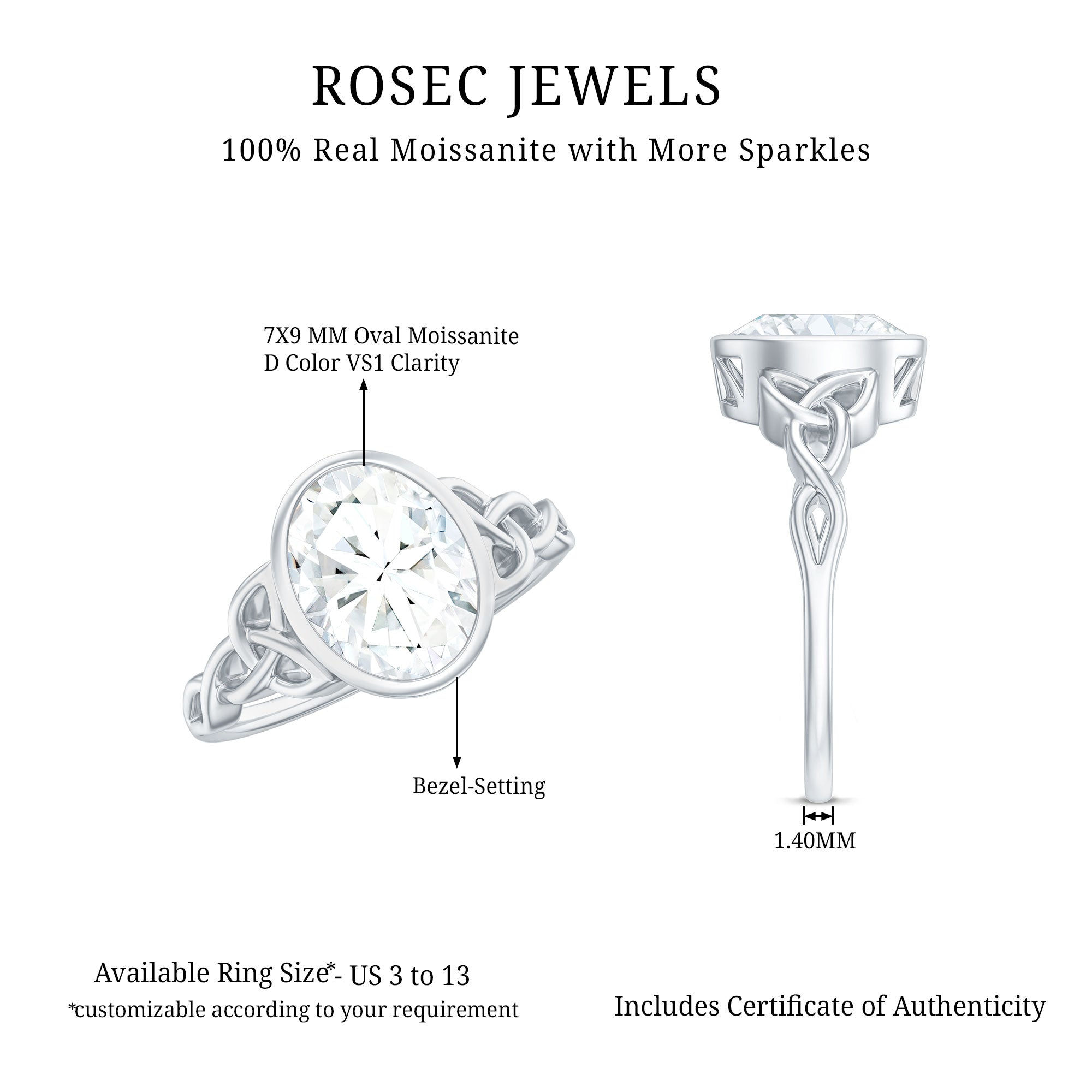 This stunning Oval Moissanite Engagement Ring brings together graceful beauty and meaningful symbolism. At the center is a brilliant 7X9 MM oval cut moissanite, set in bezel setting. The stone is both secure and stylish, designed to shine brightly through everyday moments and life’s biggest celebrations. What truly sets this Solitaire Engagement Ring apart is its intricately crafted Celtic knot band, symbolizing eternal love, loyalty, and the unbreakable bond between two souls. The flowing knotwork adds a romantic and old world charm to the modern simplicity of the solitaire oval shape, making this Bezel Set Engagement Ring a perfect balance of tradition and contemporary design. The smooth curves and low profile setting offer comfort for daily wear, while the D-VS1 quality moissanite ensures breathtaking brilliance. Available in US ring sizes 3 to 13, this 2 Carat Moissanite Ring offers a tailored fit for every hand. Arriving in a beautifully designed jewelry box, it is ready to gift, or to become the start of your own cherished story. A true symbol of enduring love, this Celtic Design Engagement Ring is a promise, designed to last a lifetime.