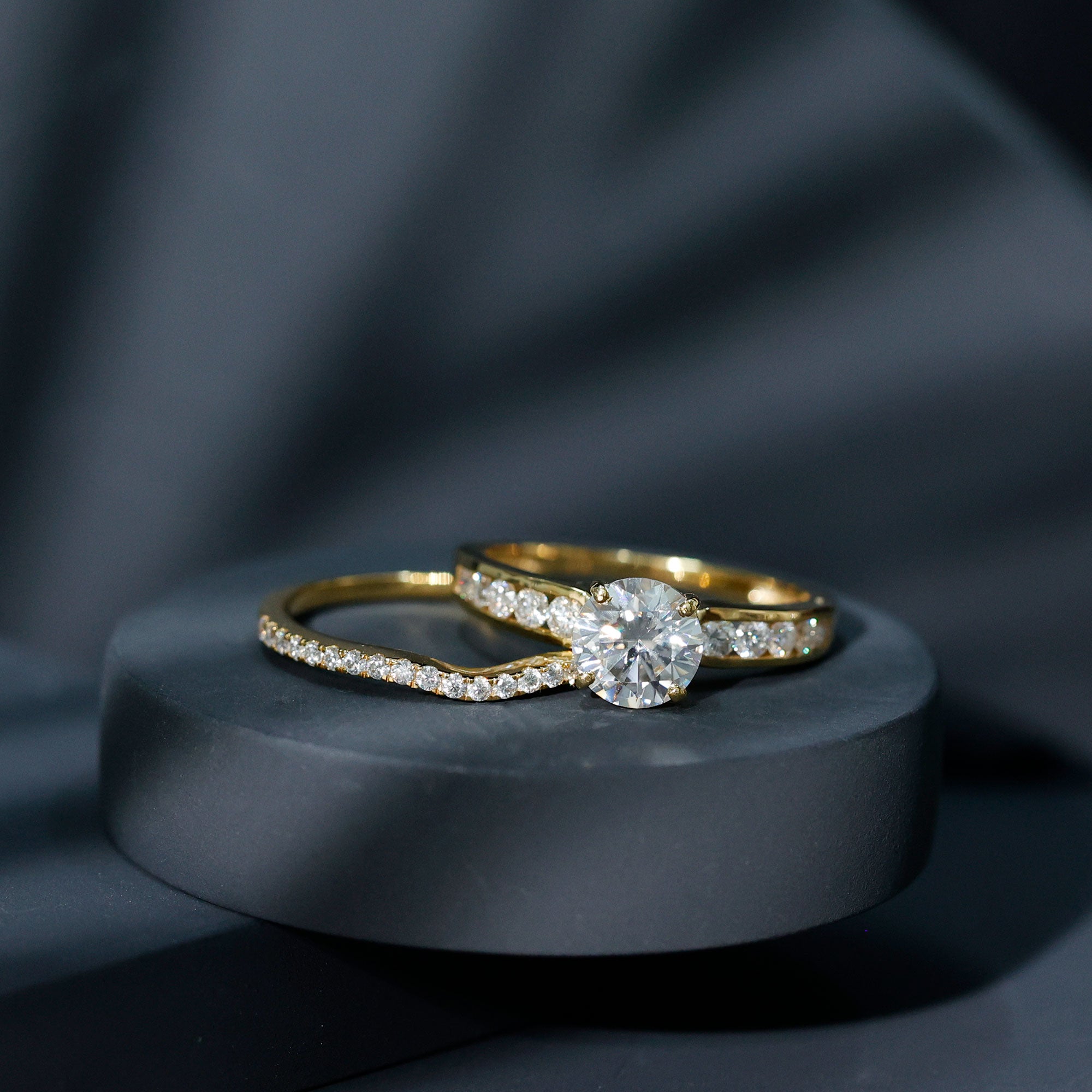 Start a beautiful new chapter with this breathtaking Moissanite Wedding Ring Set. Designed to make a lasting impression, this handcrafted set features a high set engagement ring showcasing a brilliant 8 MM round moissanite, securely set in peg head setting. Paired with a sleek, moissanite accented shadow band that sits perfectly against the engagement ring, this Stacking Ring Set offers a modern yet timeless look she will never stop admiring. The dazzling moissanite centerpiece delivers intense sparkle, making it a captivating symbol of your love and commitment. Whether you are planning the perfect proposal or simply treating yourself to something special, this Engagement and Wedding Ring Set speaks volumes with its elegant design and thoughtful details. Handcrafted in 14k yellow gold plated silver, this piece combines fine craftsmanship with accessible luxury, giving you a meaningful piece that is both stunning and durable. Presented in a signature jewelry box and available in a range of sizes, this Moissanite Engagement Ring Set is made to celebrate every love story. Whether it is a once-in-a-lifetime proposal or a personal milestone, this ring set is designed to shine, just like the person wearing it.