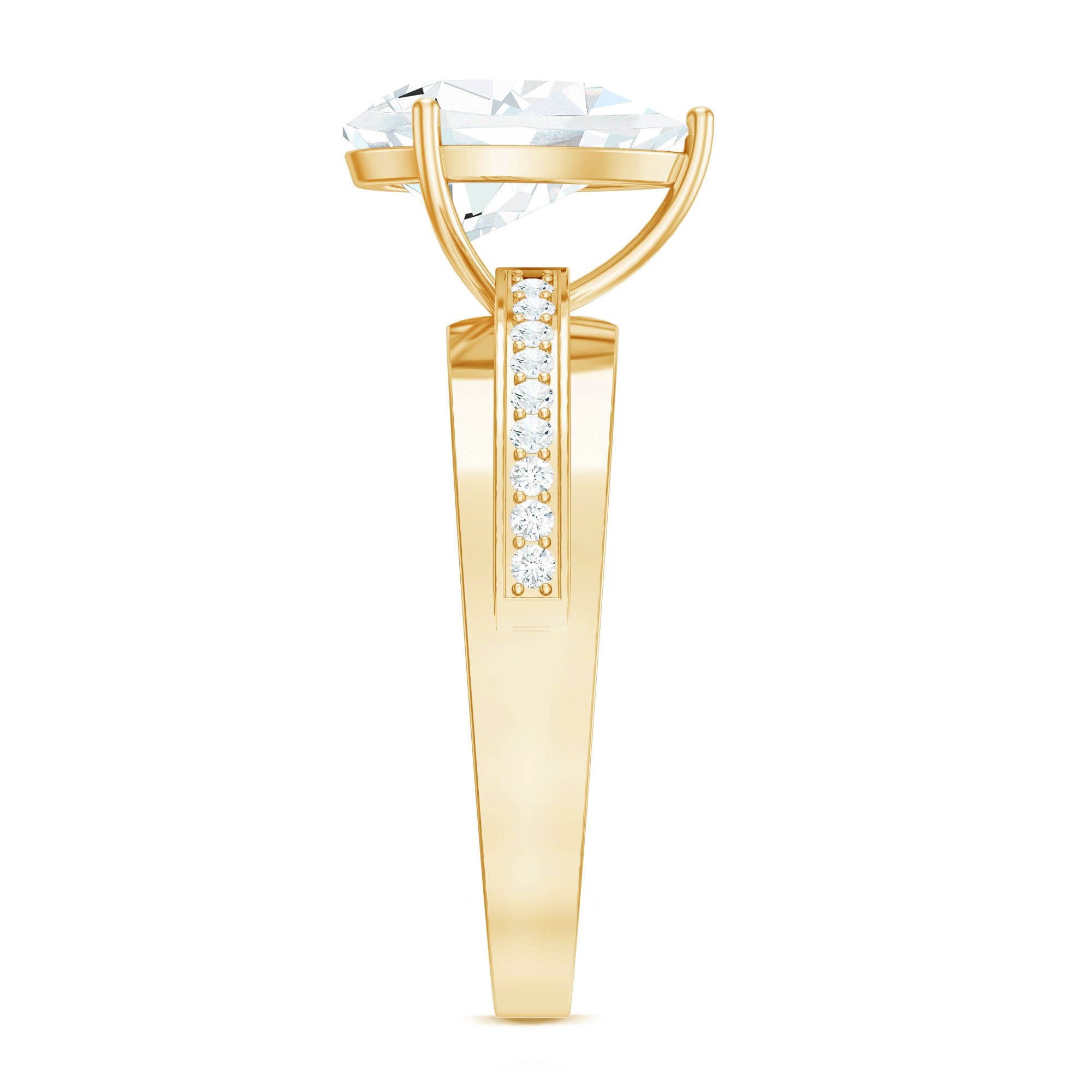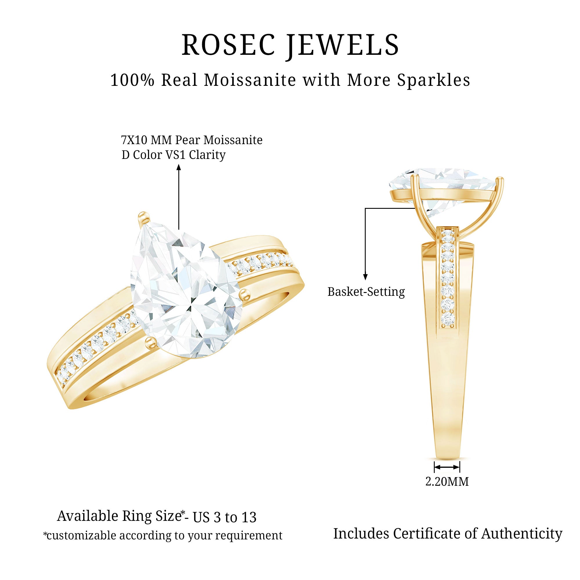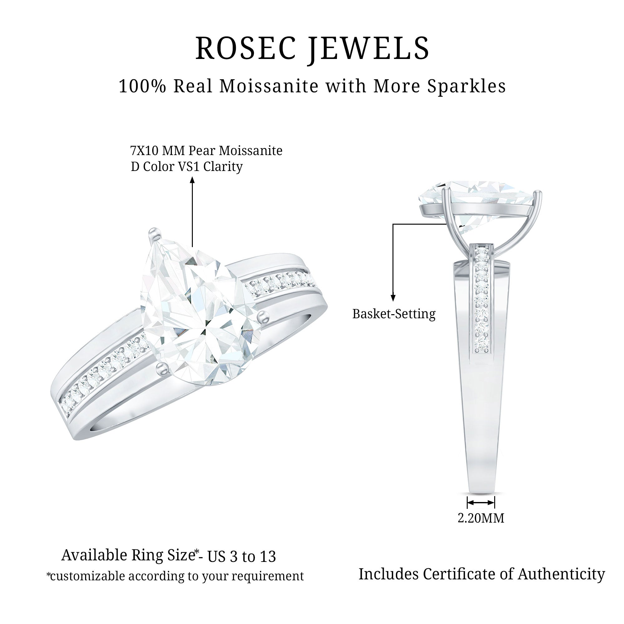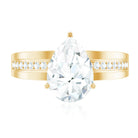 Say yes to forever with a ring that speaks volumes of grace and brilliance. This Moissanite Engagement Ring is a stunning fusion of timeless elegance and refined modern detail, perfect for a love that is one-of-a-kind. At the center of this romantic piece rests a 7X10 MM pear shaped moissanite, held securely in french setting. The teardrop silhouette brings a graceful flow and emotional depth, symbolizing the beauty of your love, laughter, and everything in between. Flanking the center stone are moissanite side stones set over the wide band, adding more sparkle to the design. Every element of this Teardrop Engagement Ring is thoughtfully crafted to enhance brilliance and elegance, giving it a refined yet statement-worthy presence. Crafted for the modern bride who appreciates both symbolism and style, this Pear Shaped Moissanite Ring is a radiant reflection of your journey together - bold, meaningful, and beautifully unique. Whether it is a proposal or a promise, this Solitaire Ring marks the start of something unforgettable. Let your love shine through every facet with a piece that blends classic romance with modern artistry, because your forever deserves nothing less.