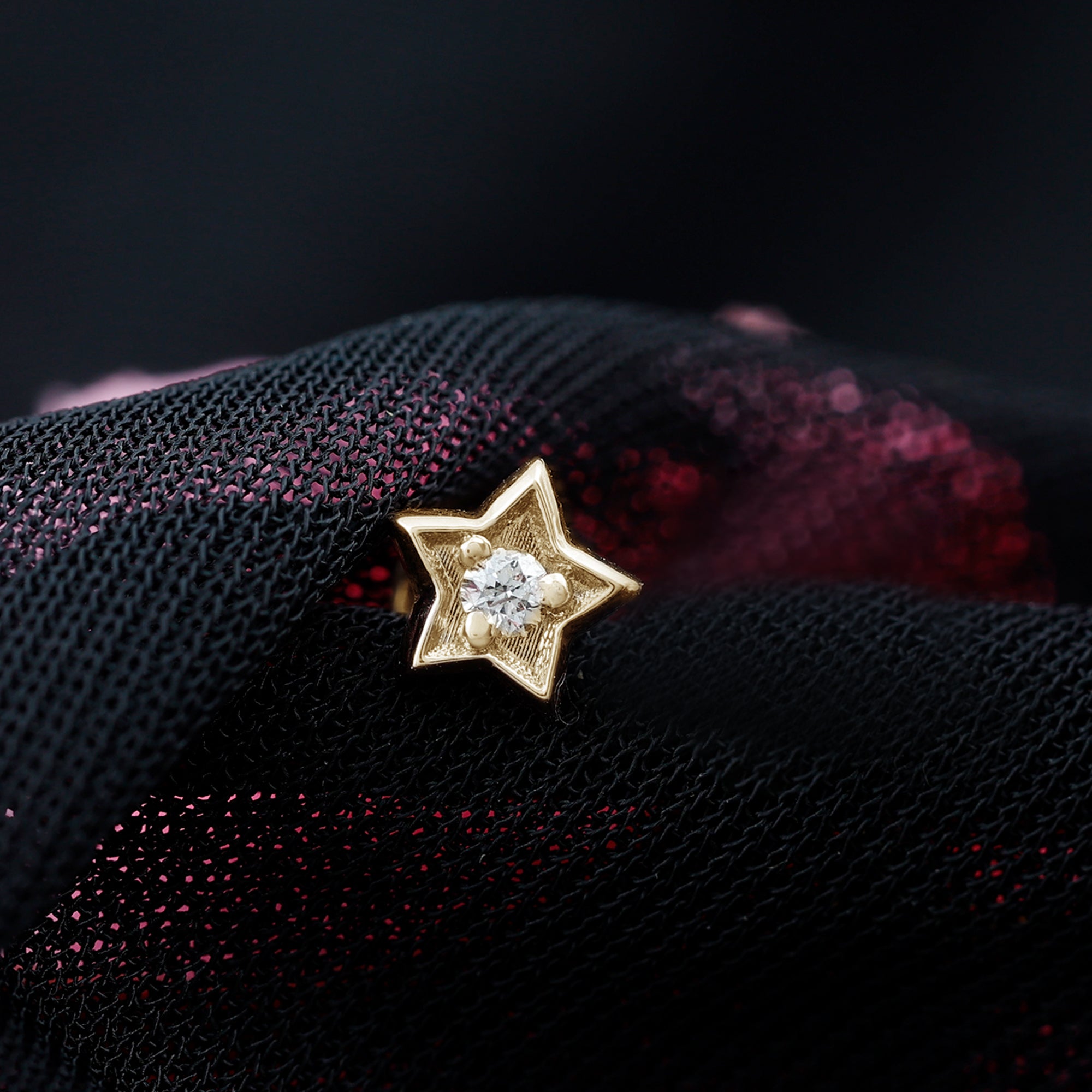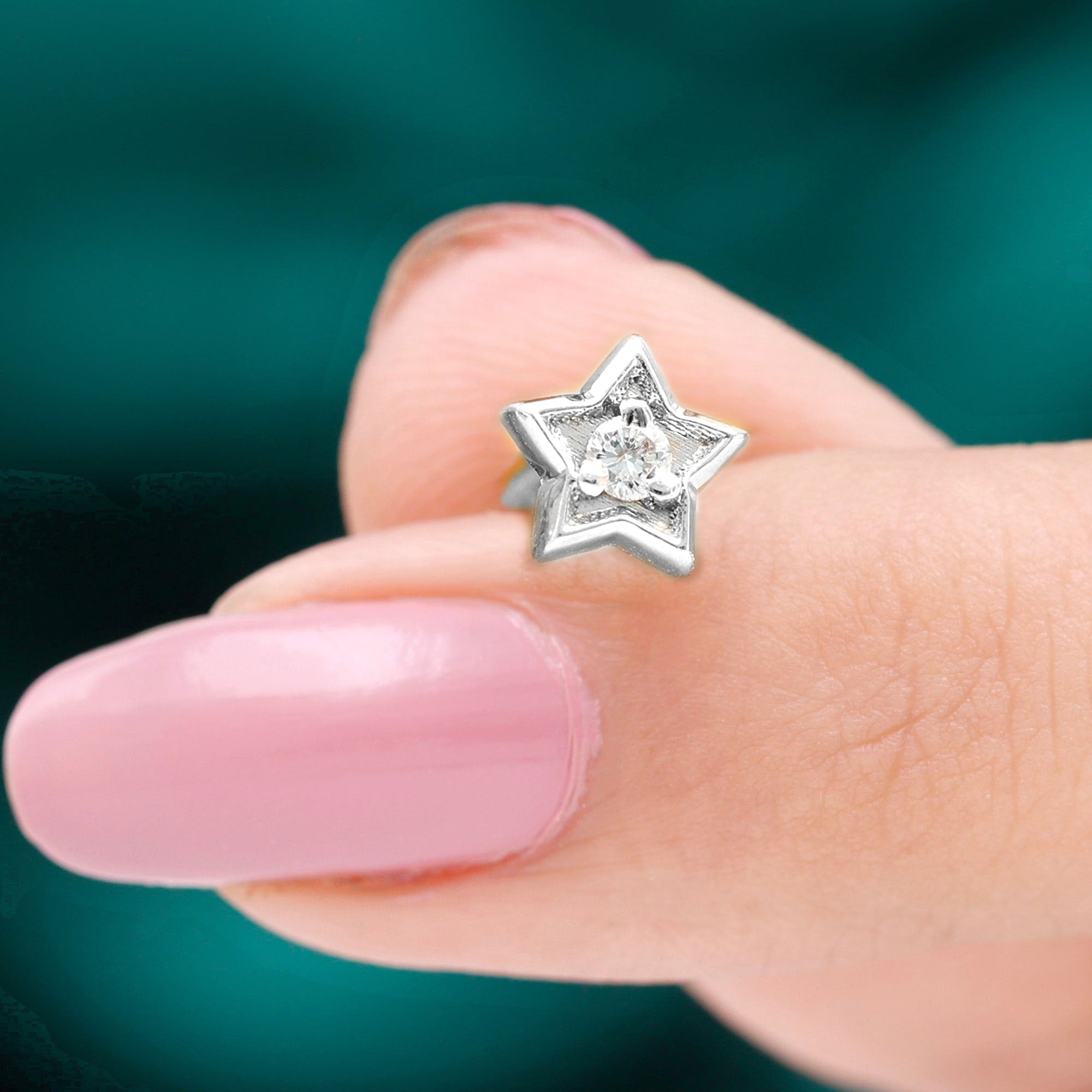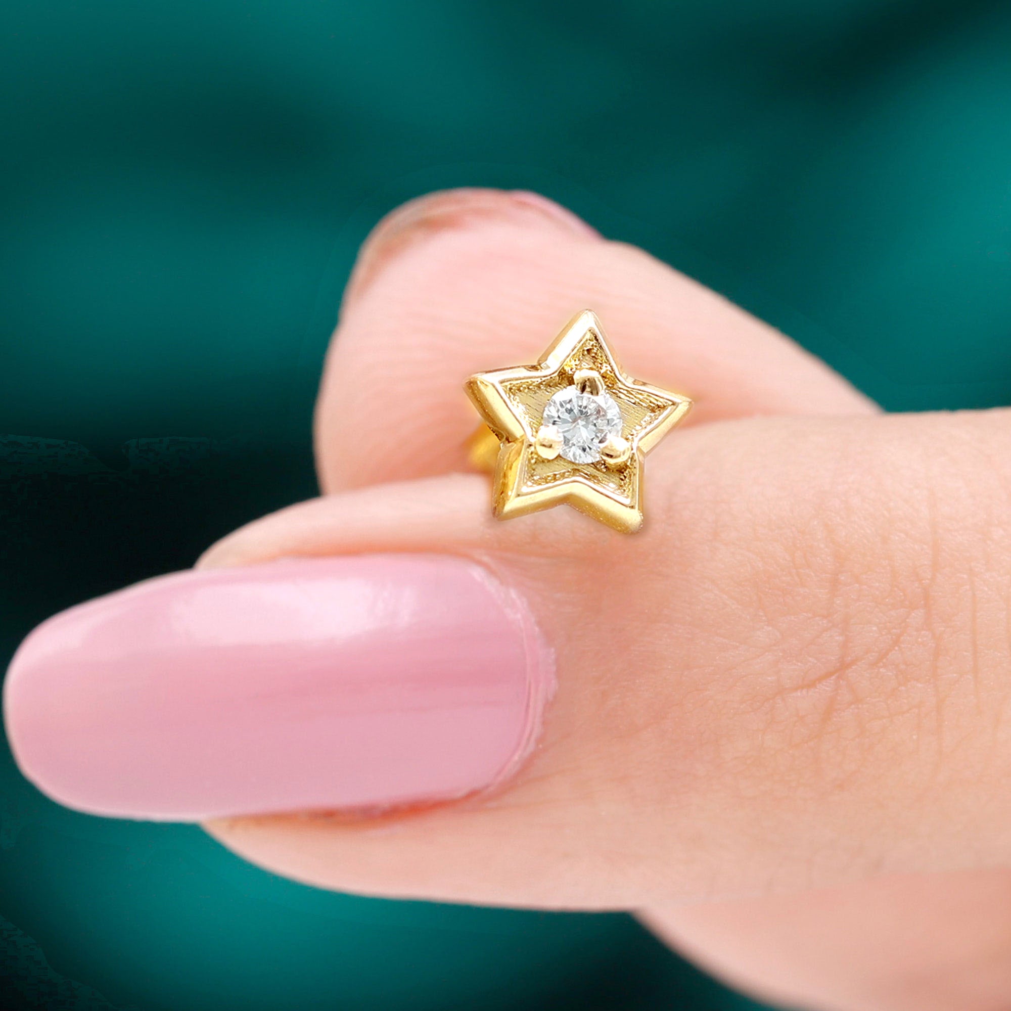 Adorned with a Round Cut Moissanite set at the center of an adorable Star design, this Moissanite Earring is a beautiful addition to your jewelry collection. Crafted in Gold for an opulent look, this tiny yet enchanting earring is a unique and charming way to show off your style around town. Perfect for a variety of piercings, including Rook, Helix, Conch, Tragus, Cartilage, or Lobe, this Moissanite Earring is sure to impress. Surprise your special someone with this Star Earring as a thoughtful Christmas gift that she will absolutely love.