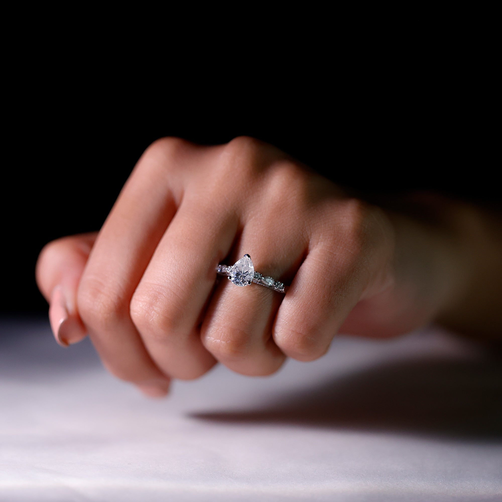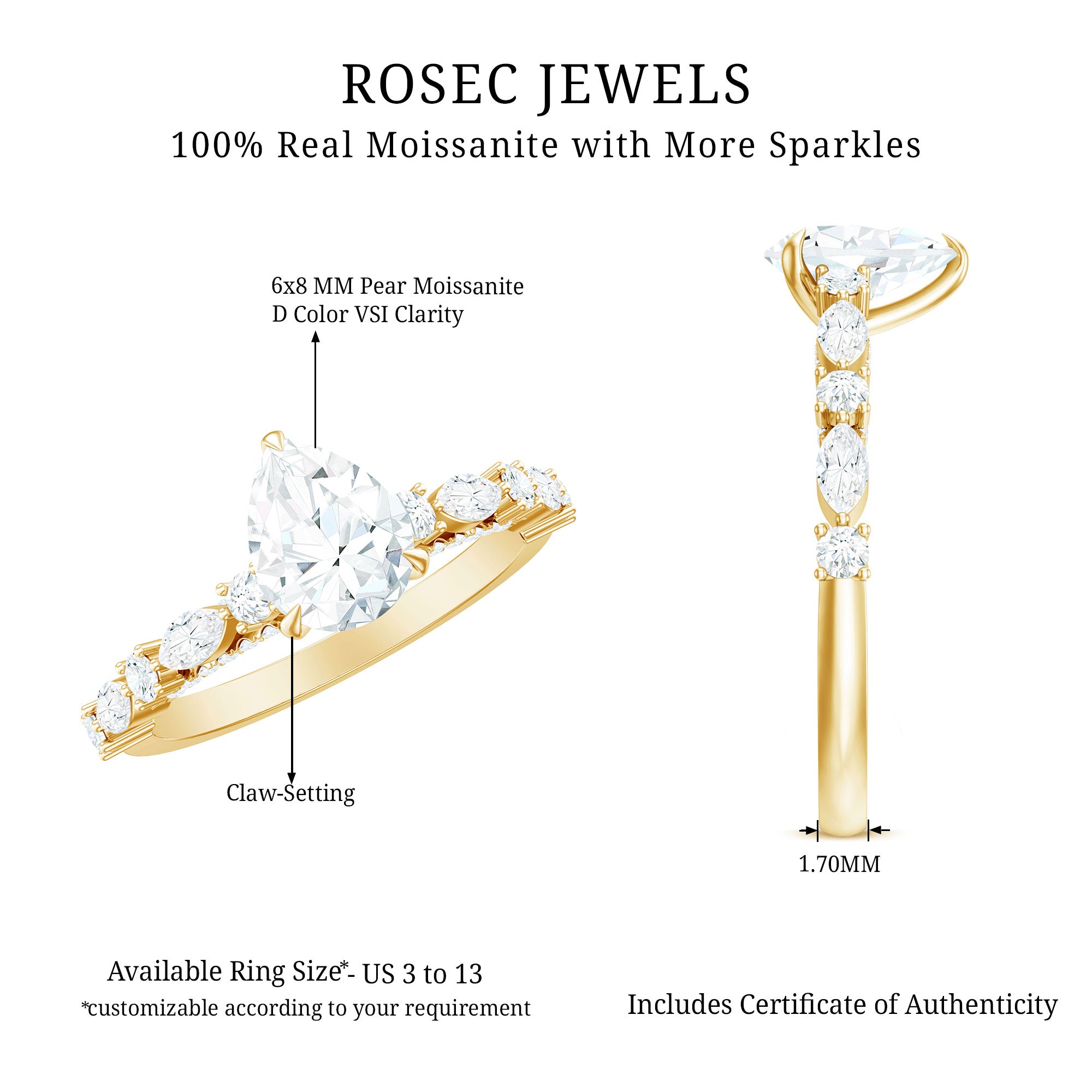 Rosec Jewels Pear Moissanite Engagement Ring brings together graceful design and brilliant sparkle, making it a wonderful choice for a once-in-a-lifetime moment. At the center sits a stunning 6X8 MM pear shaped moissanite, held securely in claw setting. To enhance the center stone, the band is lined with marquise and round moissanites that add extra brightness and depth. Additionally, there is a delightful surprise - a row of round cut stones create a surprise band that adds a special sparkle beneath the center stone. These D-VS1 quality moissanite stones are chosen for their exceptional fire and clarity, making the Teardrop Engagement Ring sparkle from every angle. Perfect for marking a proposal, celebrating a milestone, or expressing a timeless promise, this Pear Moissanite Ring carries both beauty and sentiment. Its radiant glow and thoughtful craftsmanship make it a meaningful symbol of the love you share. Designed with comfort in mind and crafted with care, it is a piece that will continue to shine through every chapter of your journey together.