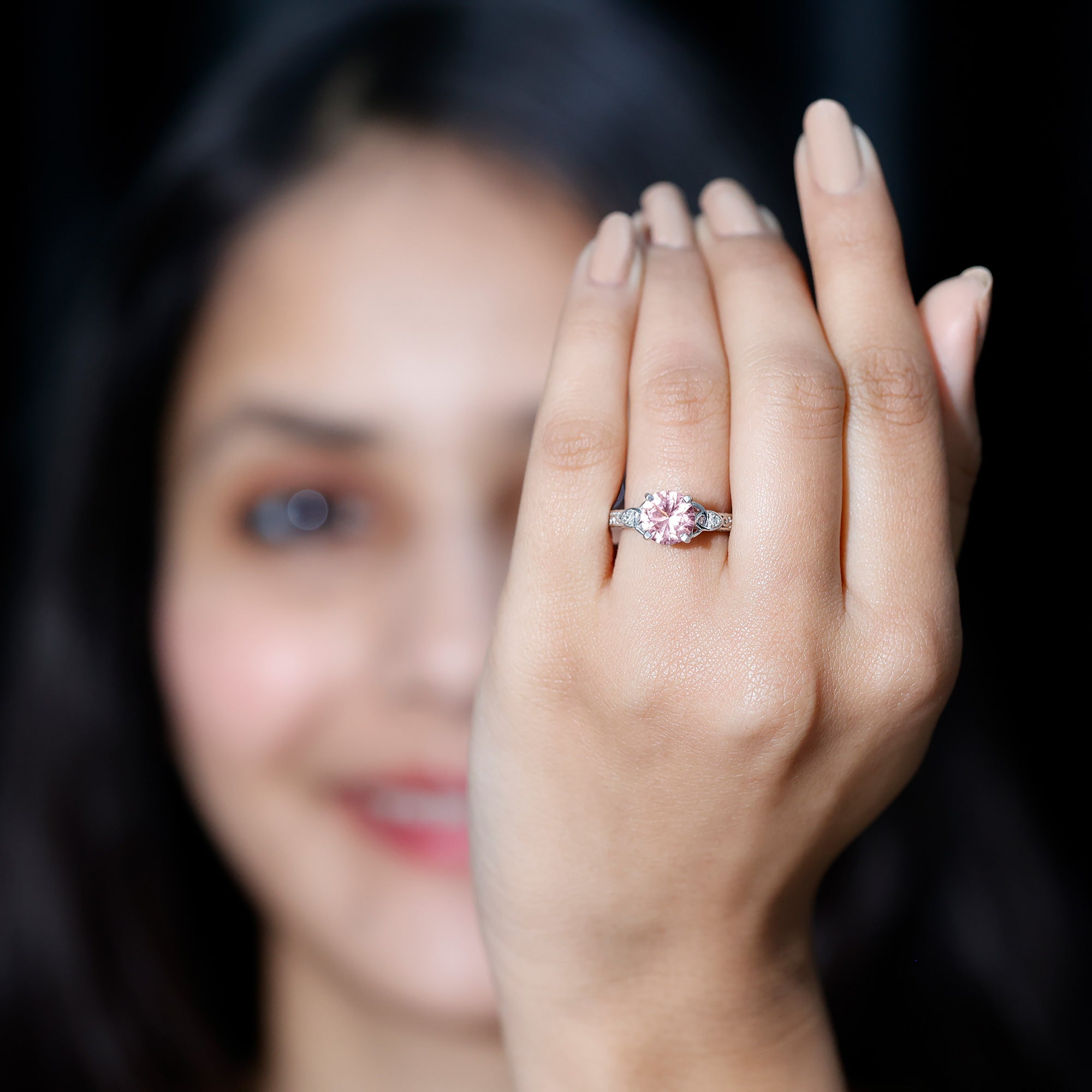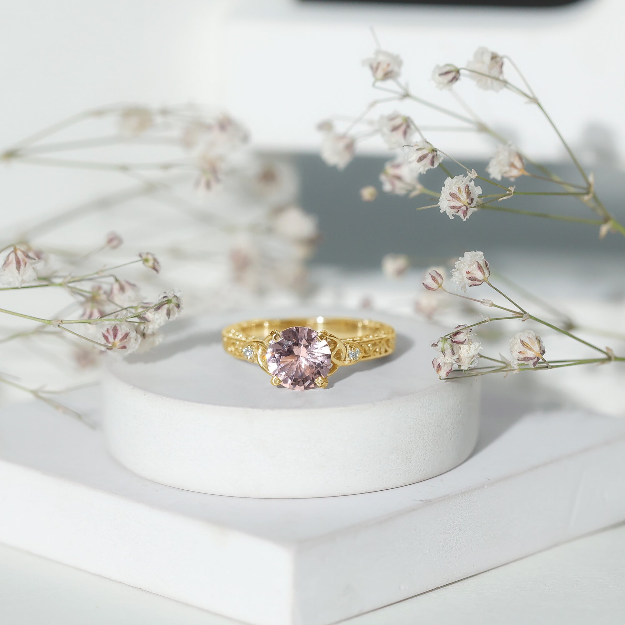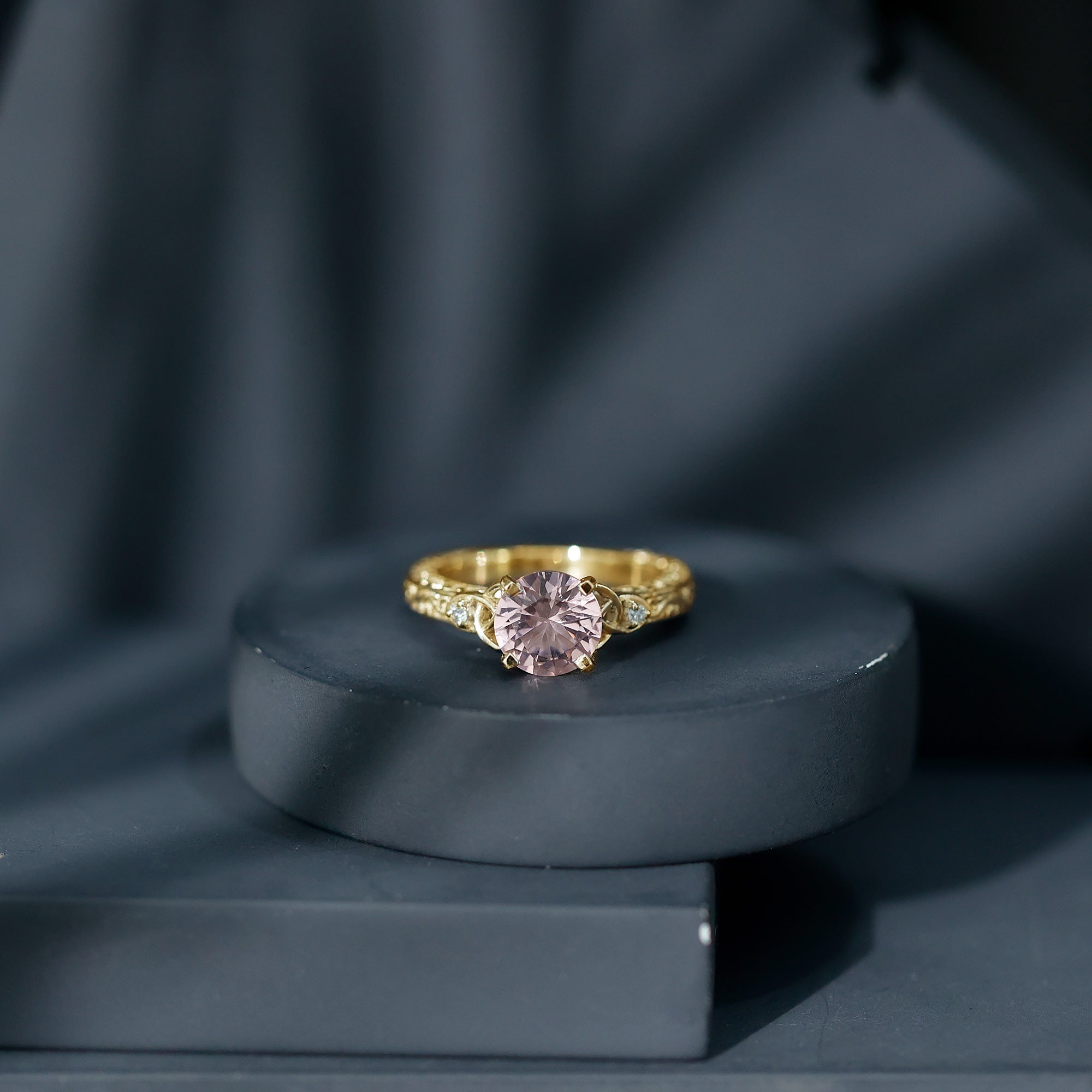 This stunning solitaire ring features a beautiful morganite center stone with Celtic knot design, accented with shimmering Diamond stone on either side. The soft pink hue of the morganite adds a touch of feminine charm and romance to the ring, while the intricate knot design symbolizes everlasting love and commitment. The shimmering Diamond stones provide a stunning contrast and add a touch of glamour and sophistication to the ring. Whether as an engagement ring or a thoughtful gift for a loved one, this ring is sure to make a lasting impression.