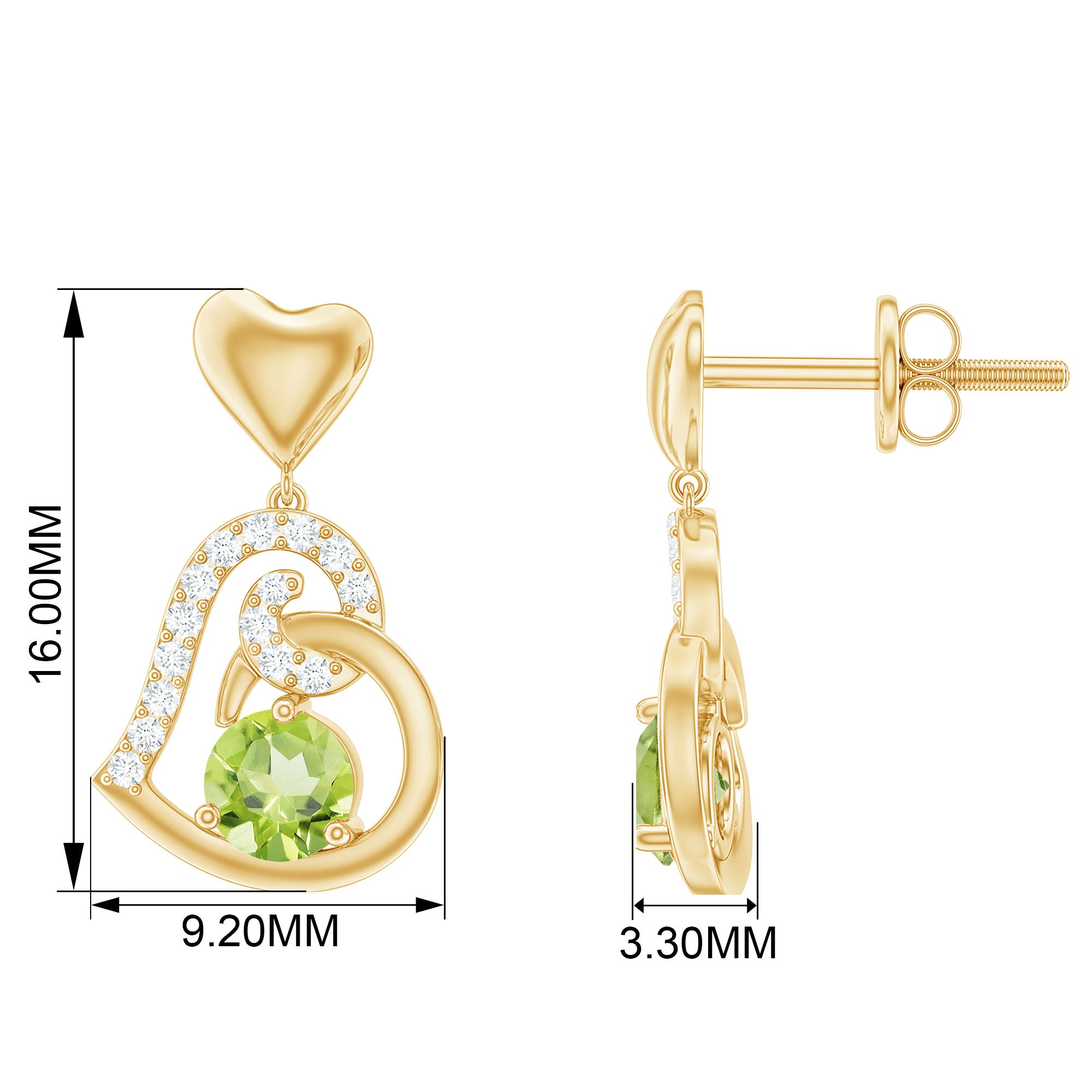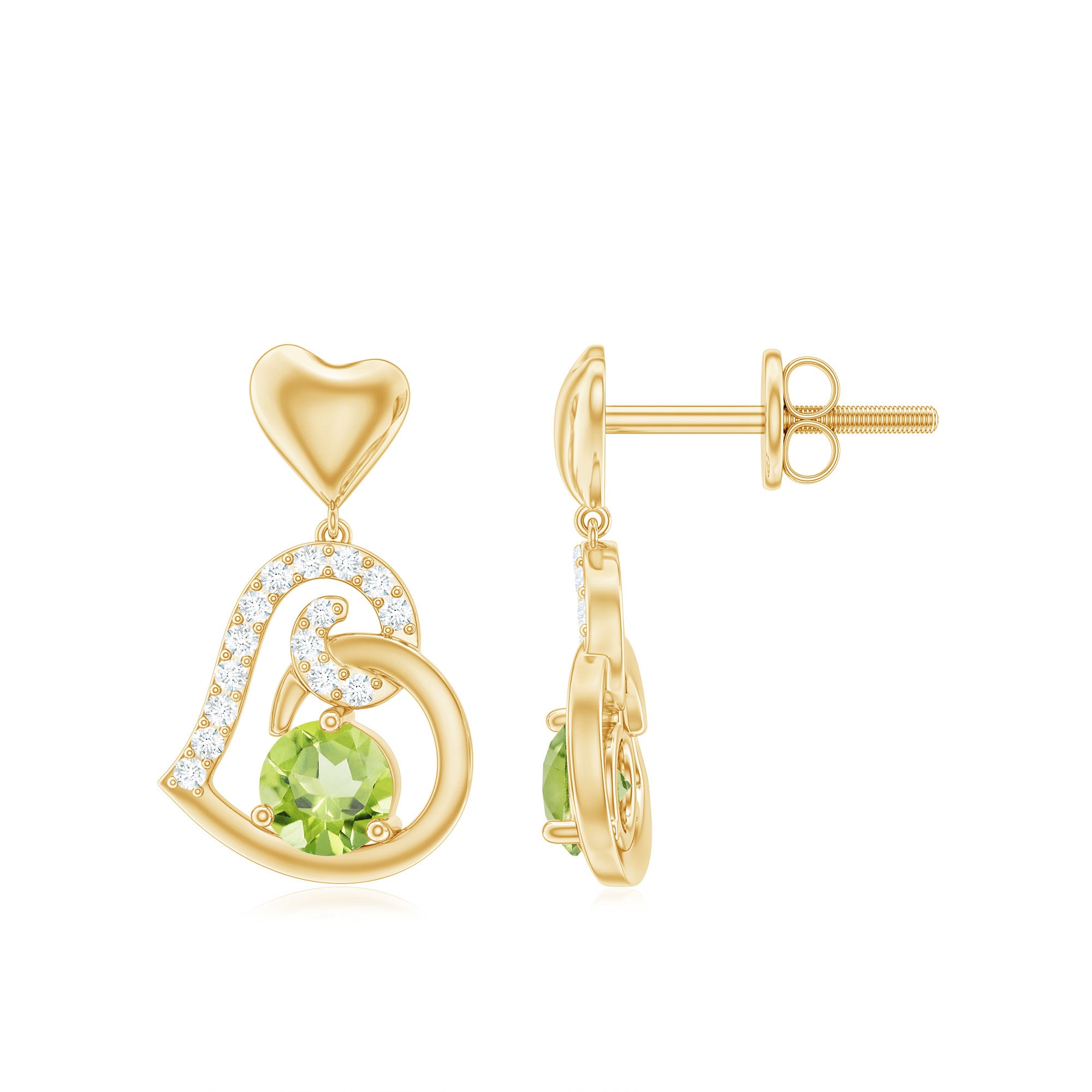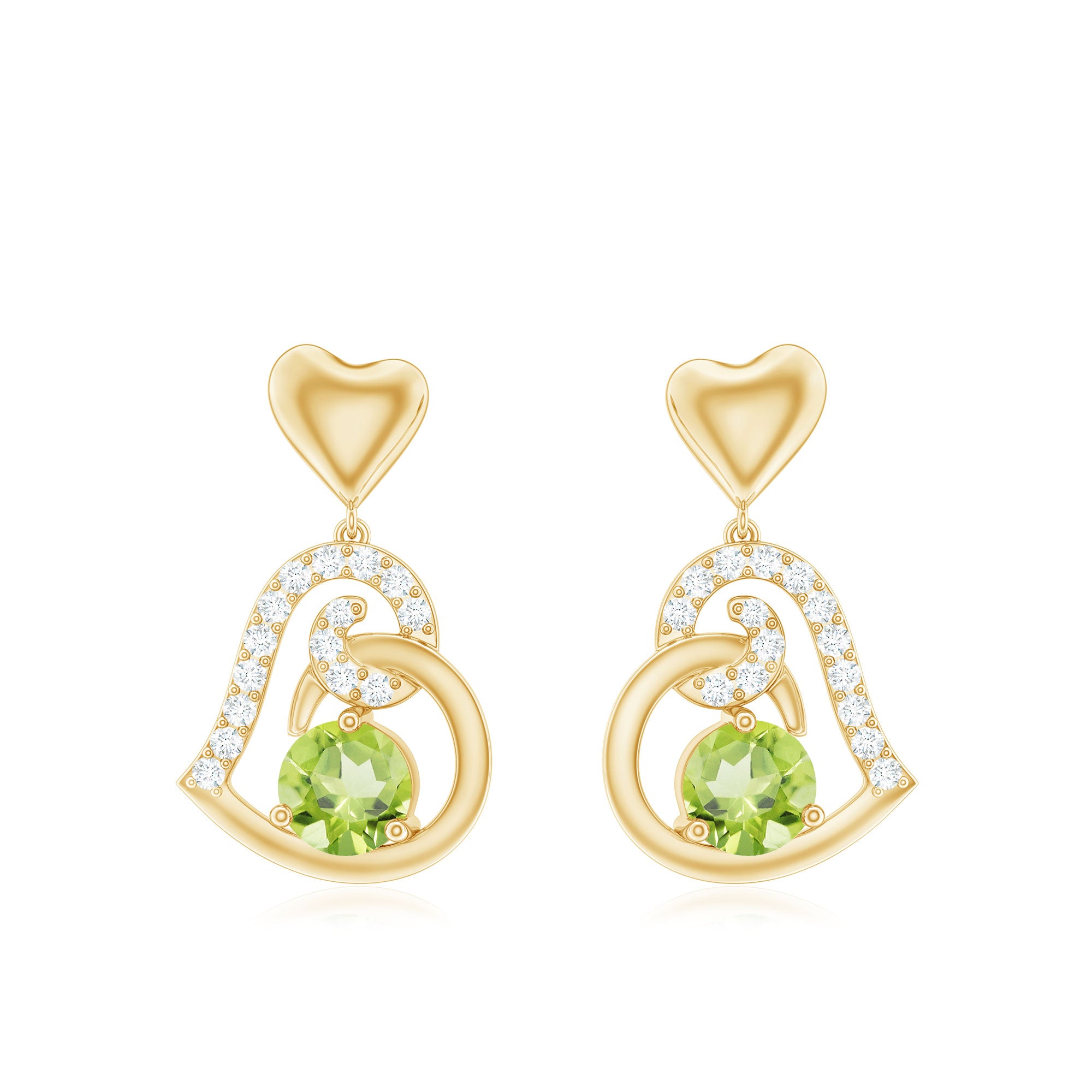 Grab everyones attention while flaunting these beautiful Heart Drop Earrings embellished with Round Shape Peridot as Solitaire in 3 Prong Setting and Round Shape Diamonds in Prong Setting, crafted in Solid Gold.