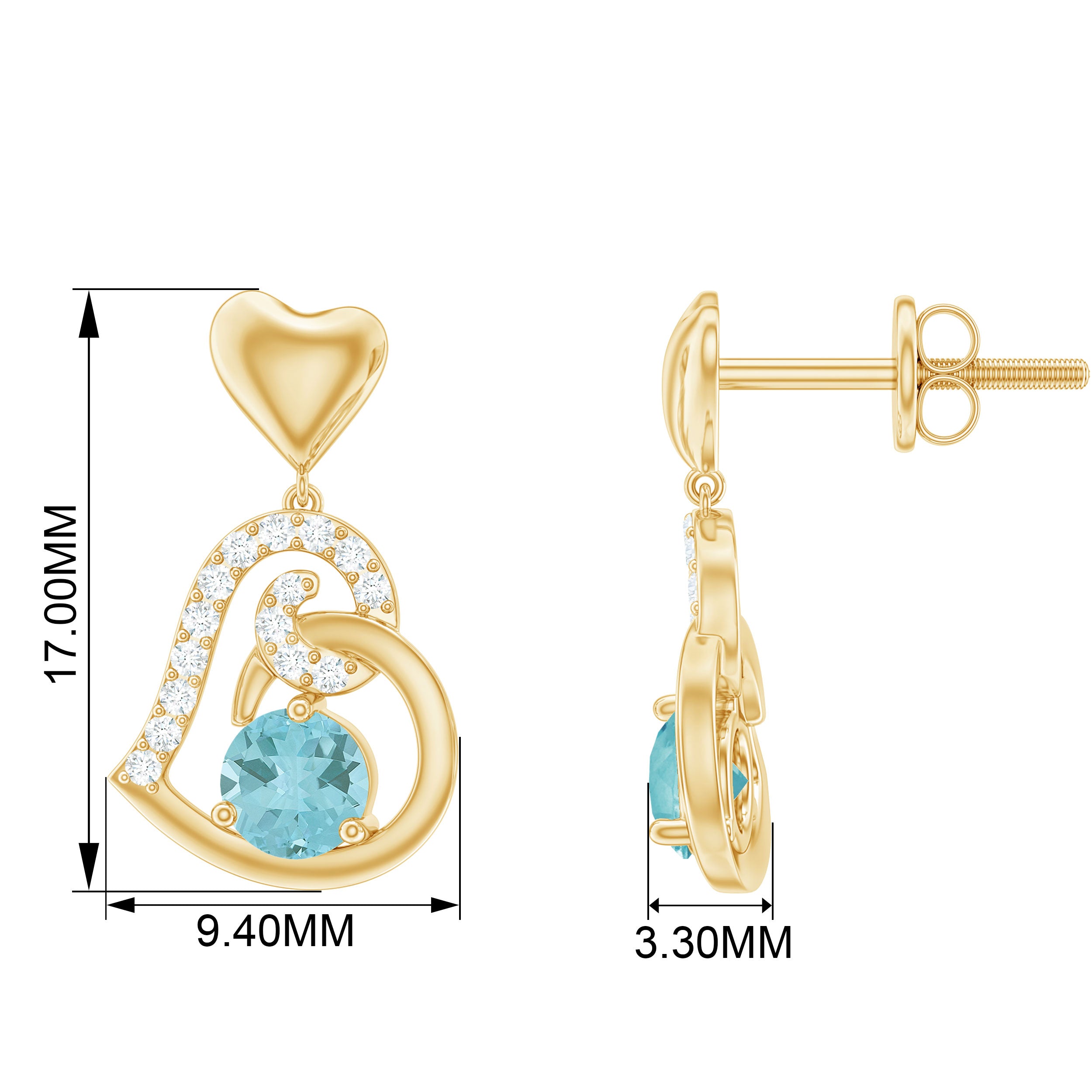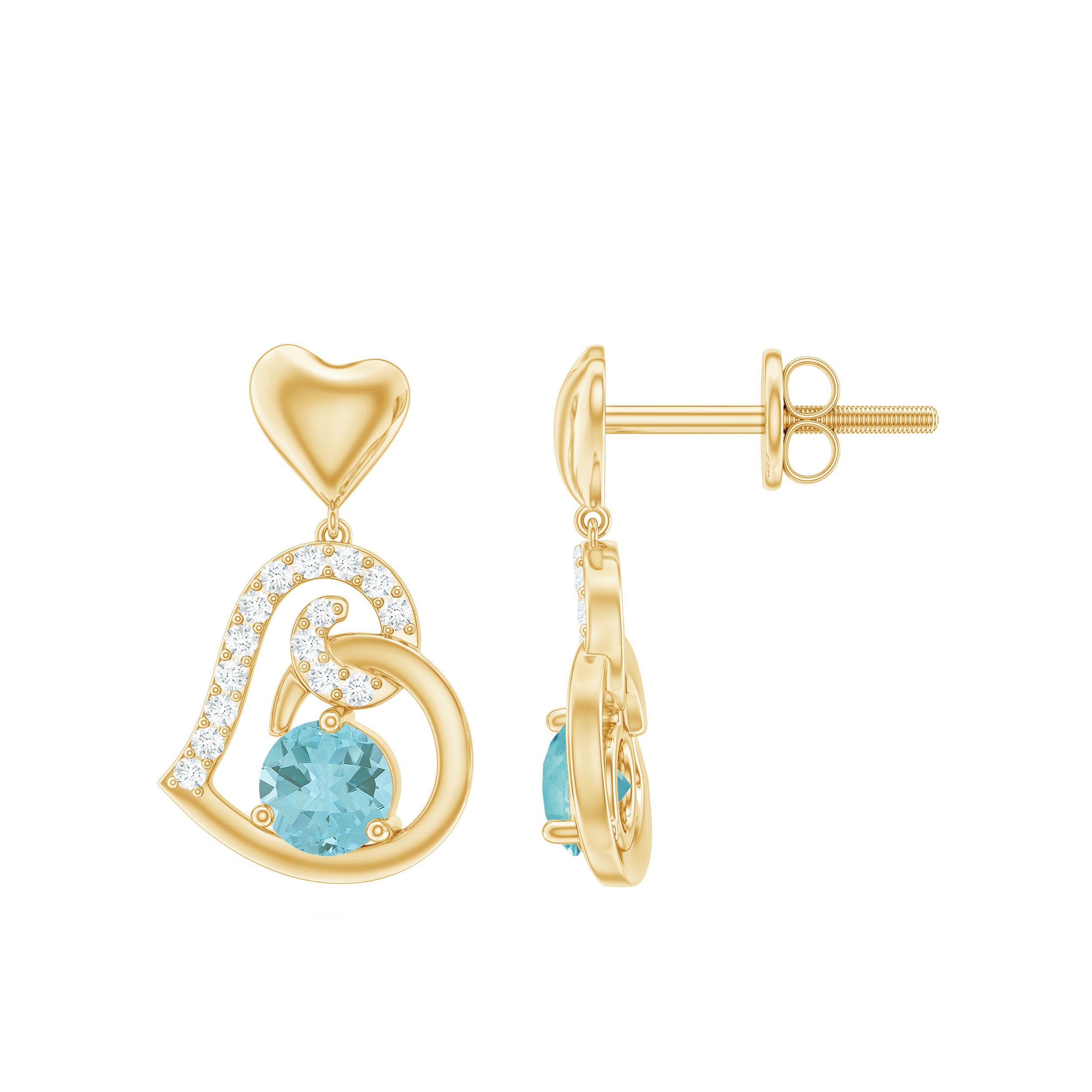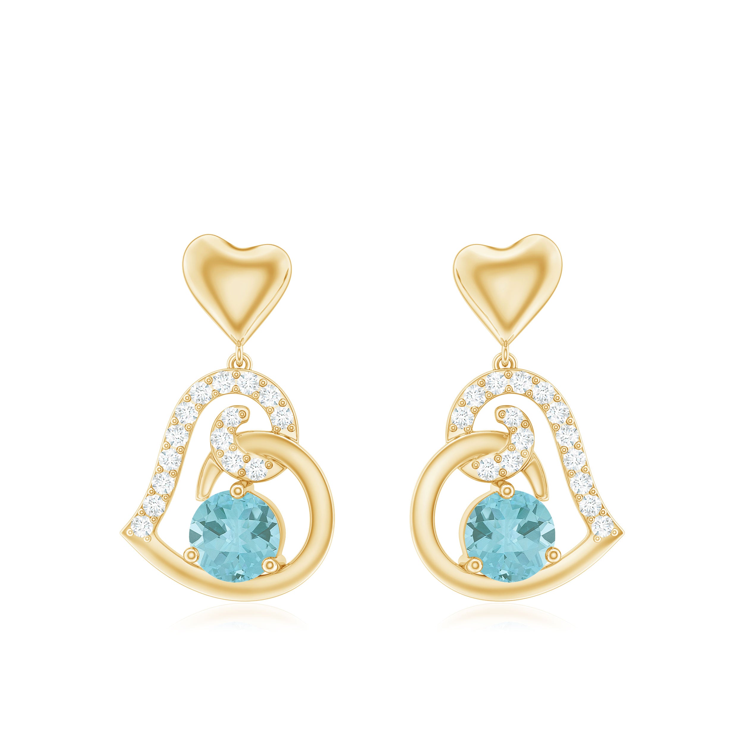 Grab everyones attention while flaunting these beautiful Heart Drop Earrings embellished with Round Shape Sky Blue Topaz as Solitaire in 3 Prong Setting and Round Shape Diamonds in Prong Setting, crafted in Solid Gold.