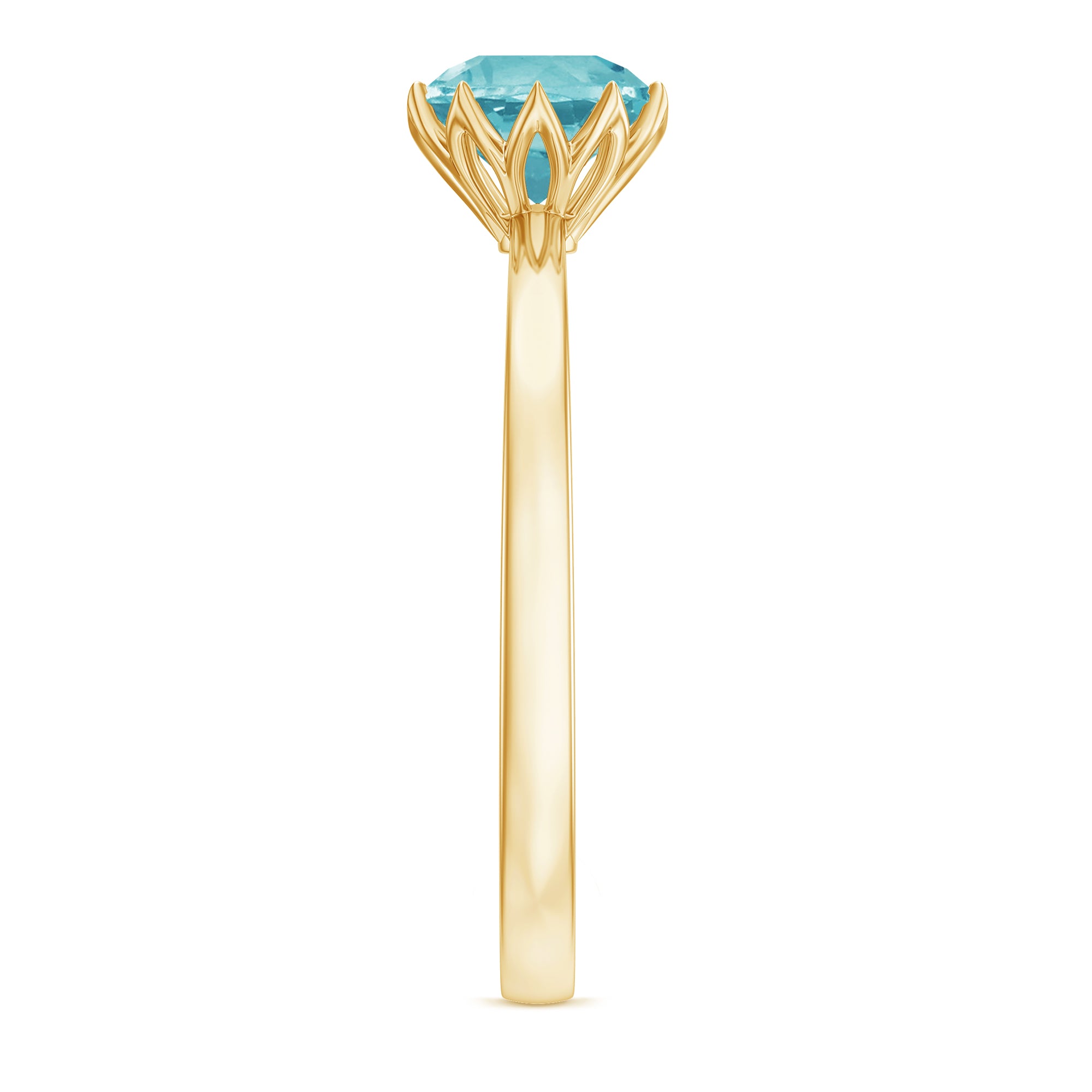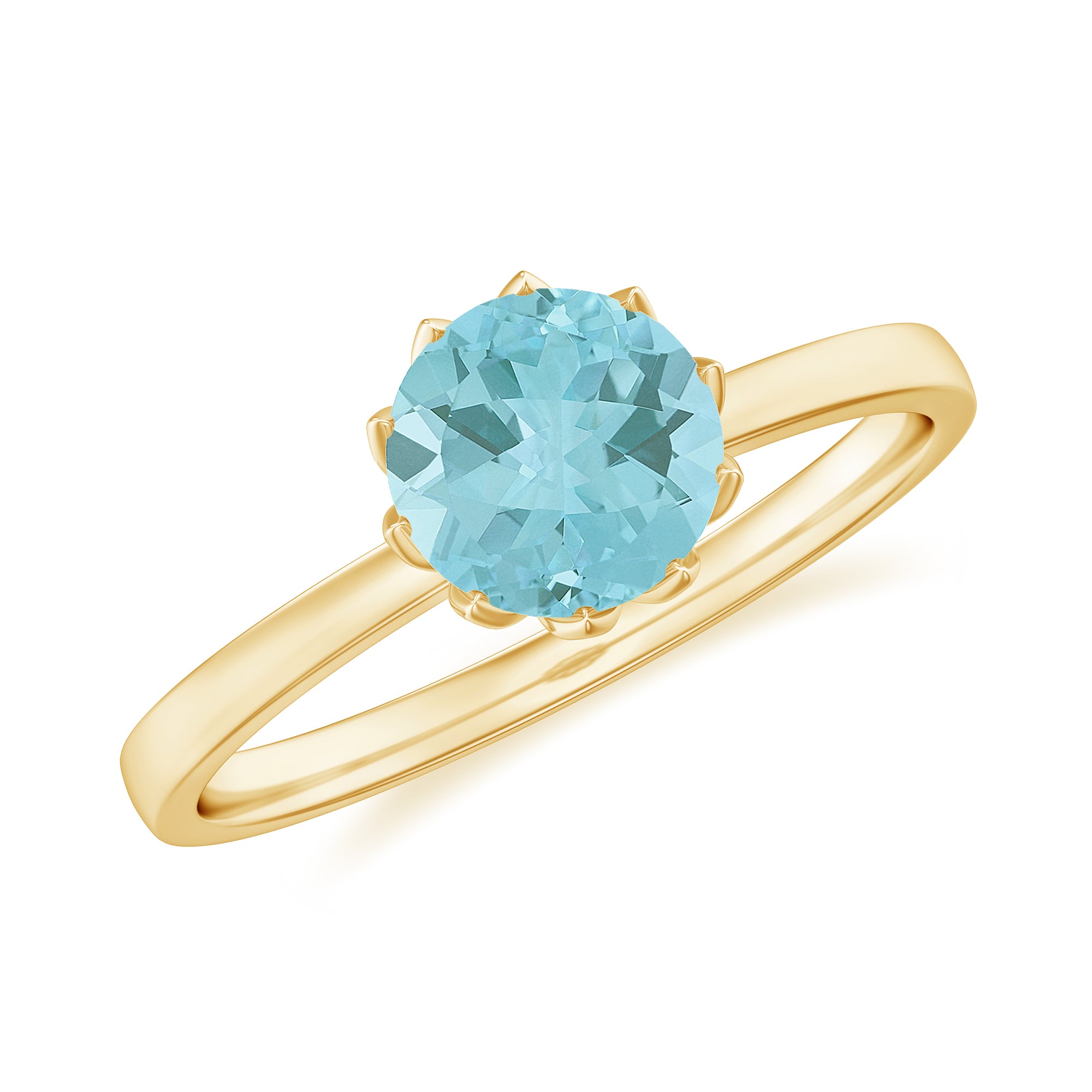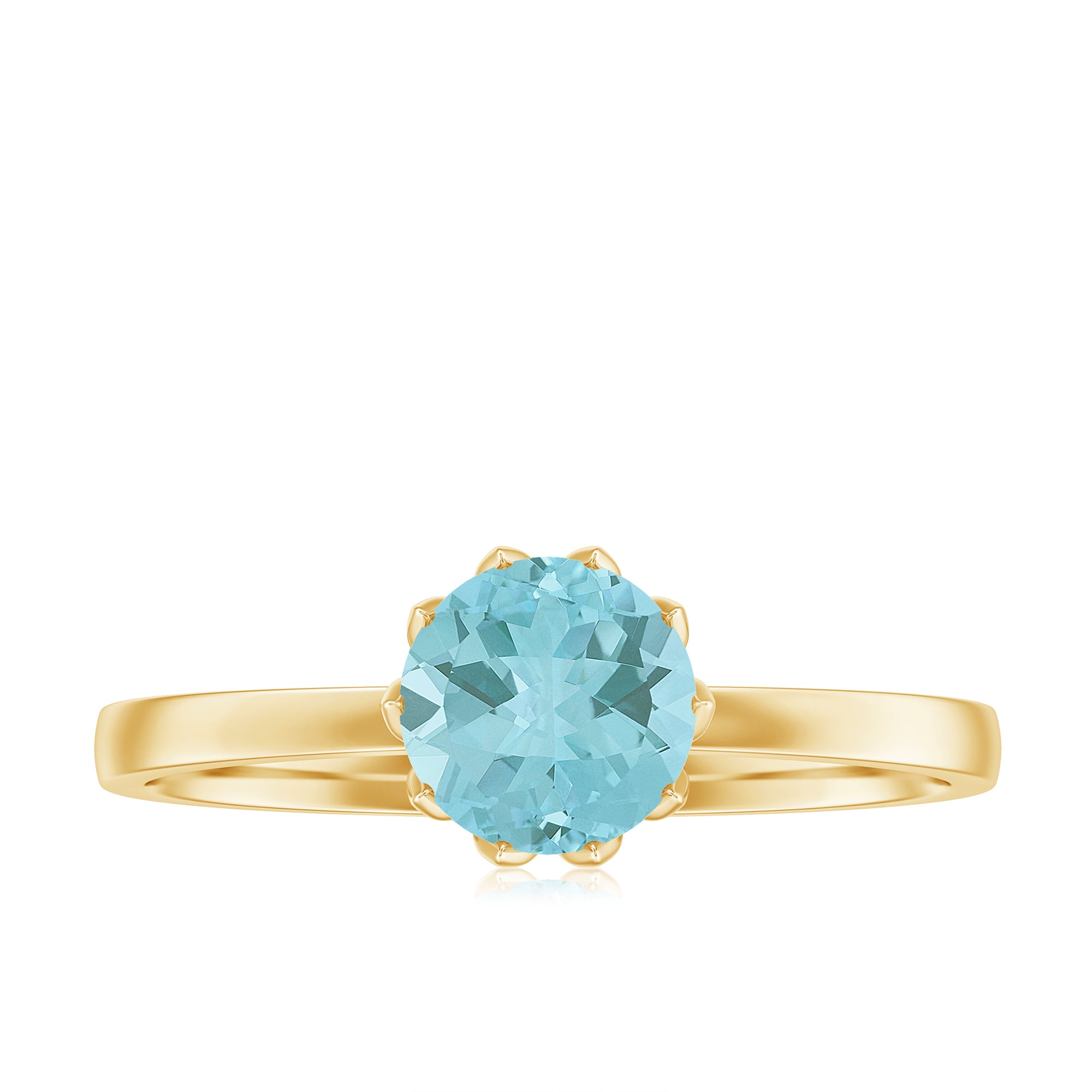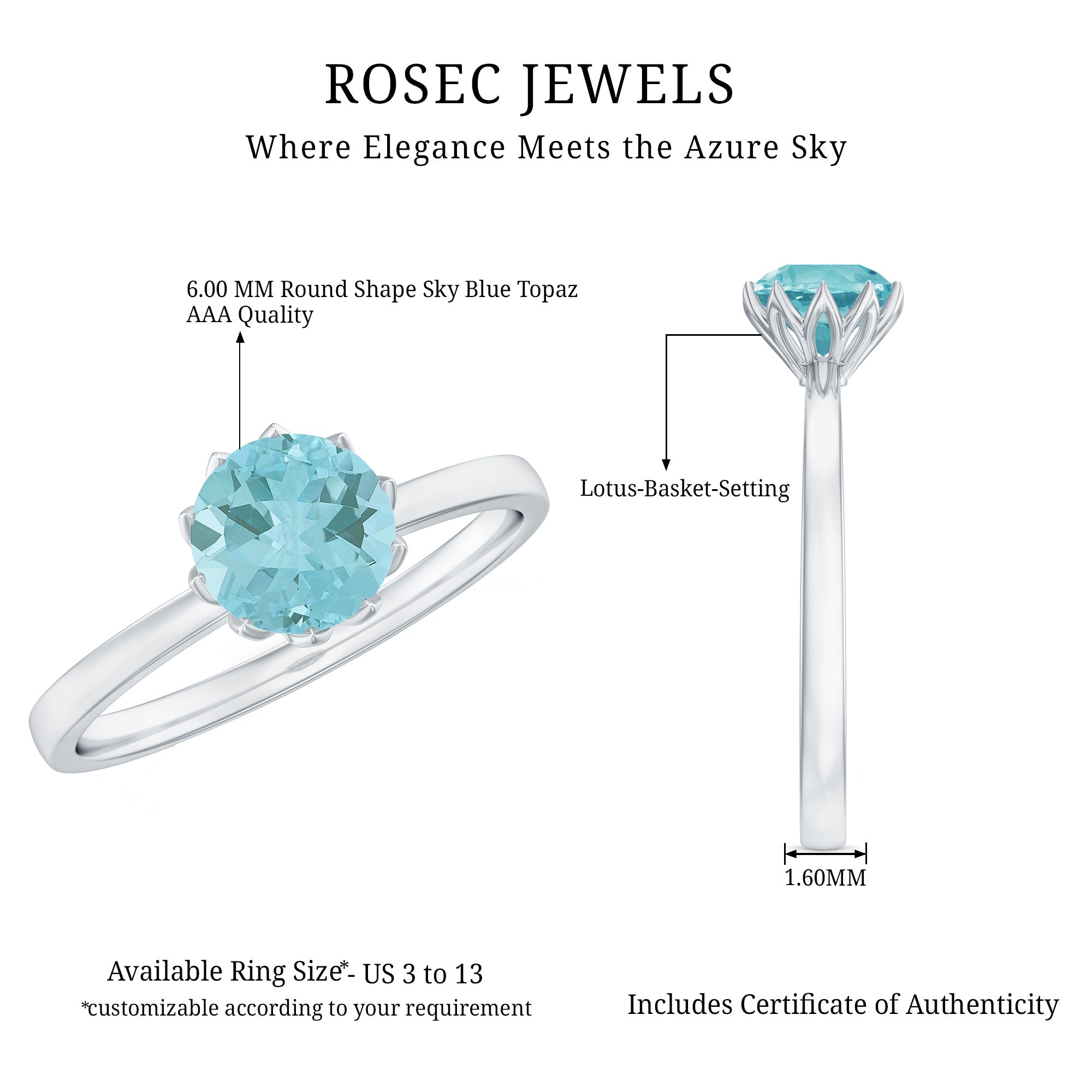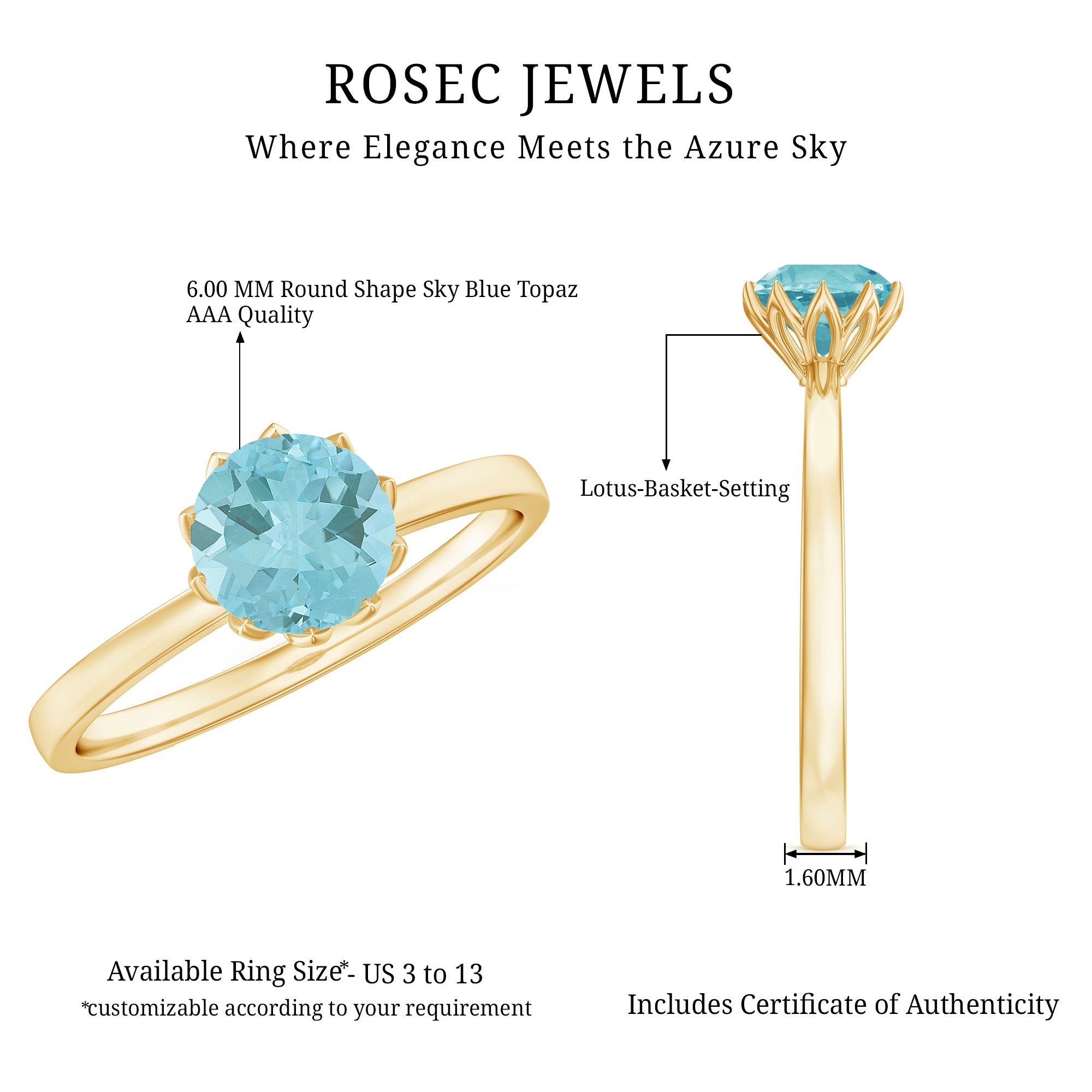 Radiate stunning beauty with a captivating sky blue topaz solitaire ring, featuring a round cut gemstone in a lotus basket setting.