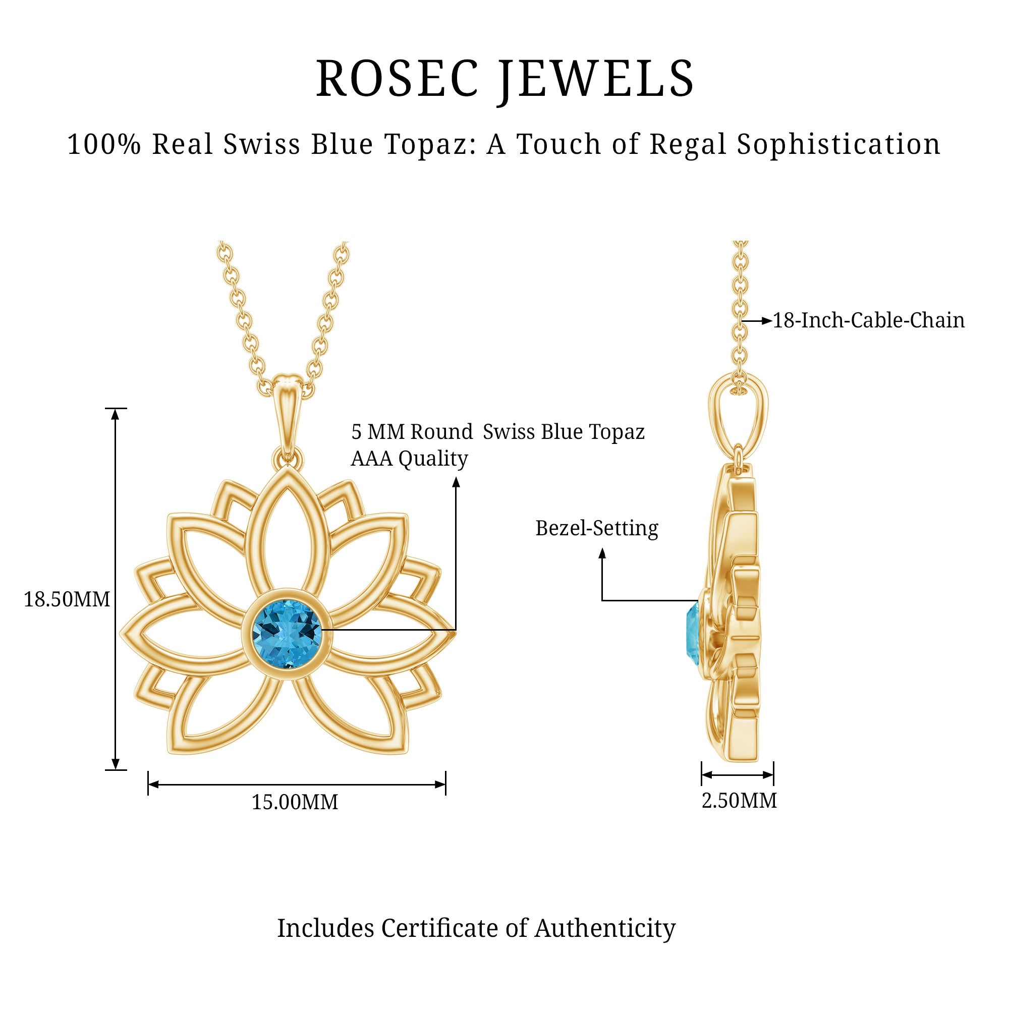This amazing Swiss Blue Topaz Pendant has lovely delicate design make a perfect accessory for vintage lover. It features a 5 MM Round Shape Swiss Blue Topaz secured in Bezel Setting. This stunning Solitaire Pendant beholds the classic shine of AAA Quality Swiss Blue Topaz. This Floral Charm Necklace is beautifully crafted to adore your neckline. This Pendant will be delivered to you with a certificate of authenticity in a premium quality box to keep it safe and secure when not in use.