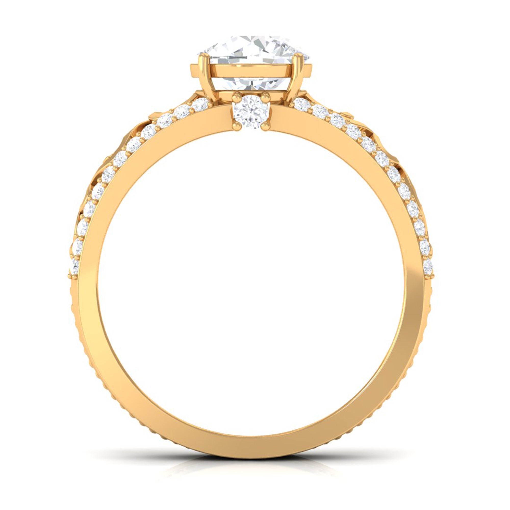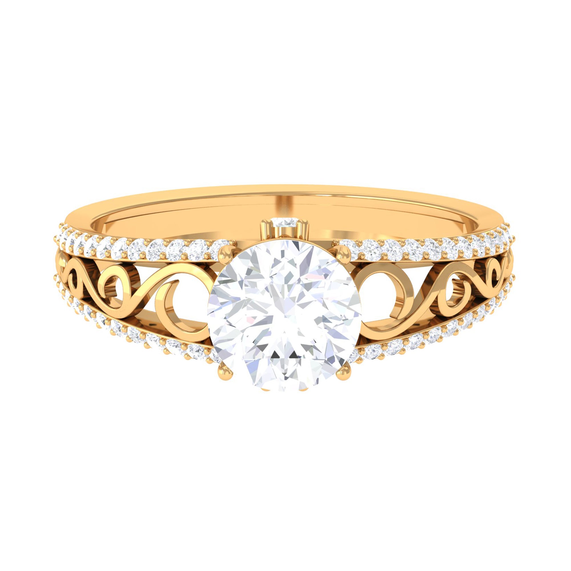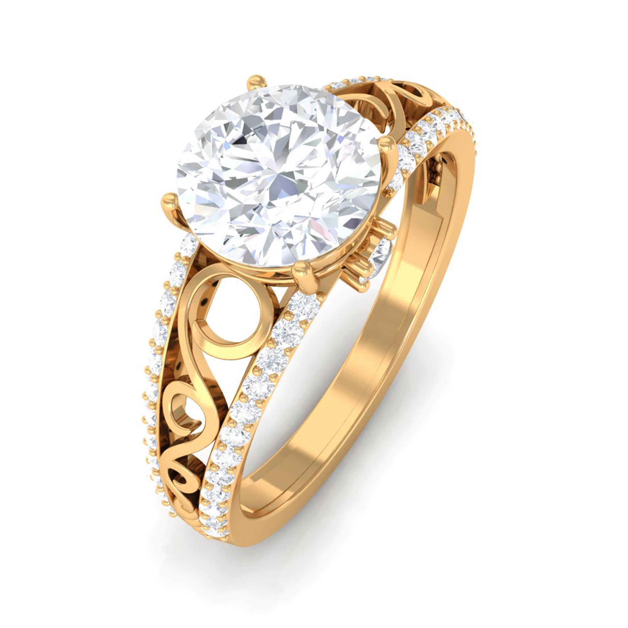 Artistically crafted in Gold, this Designer Shank Ring features Round Cut Ruby in prong setting with accent and hidden cz beautifully. This Cubic Zirconia Engagement Ring will be the perfect fit for your partner. Get this beautiful Simulated Diamond Engagement Ring for you lady and make her feel elated.